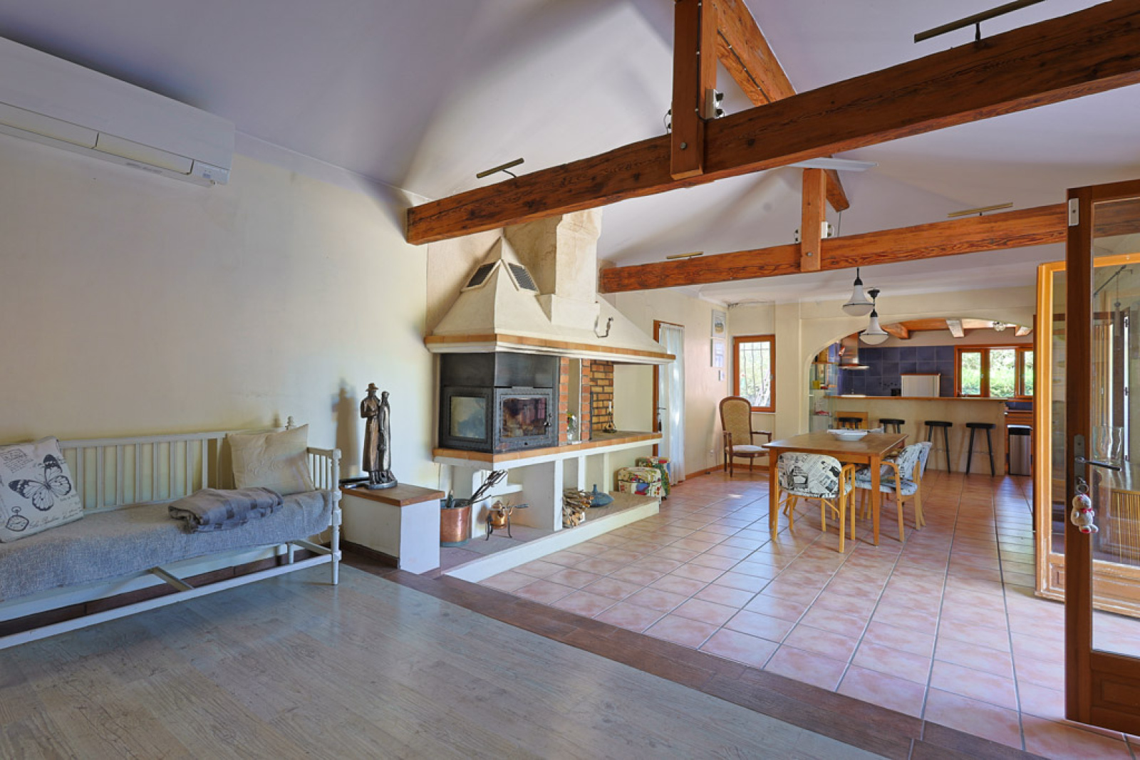 La maison se compose de nombreux espaces ouverts et offre une atmosphère chaleureuse et agréable. Les portes-fenêtres s'ouvrent sur le jardin et assurent une transition agréable entre l'intérieur et l'extérieur.