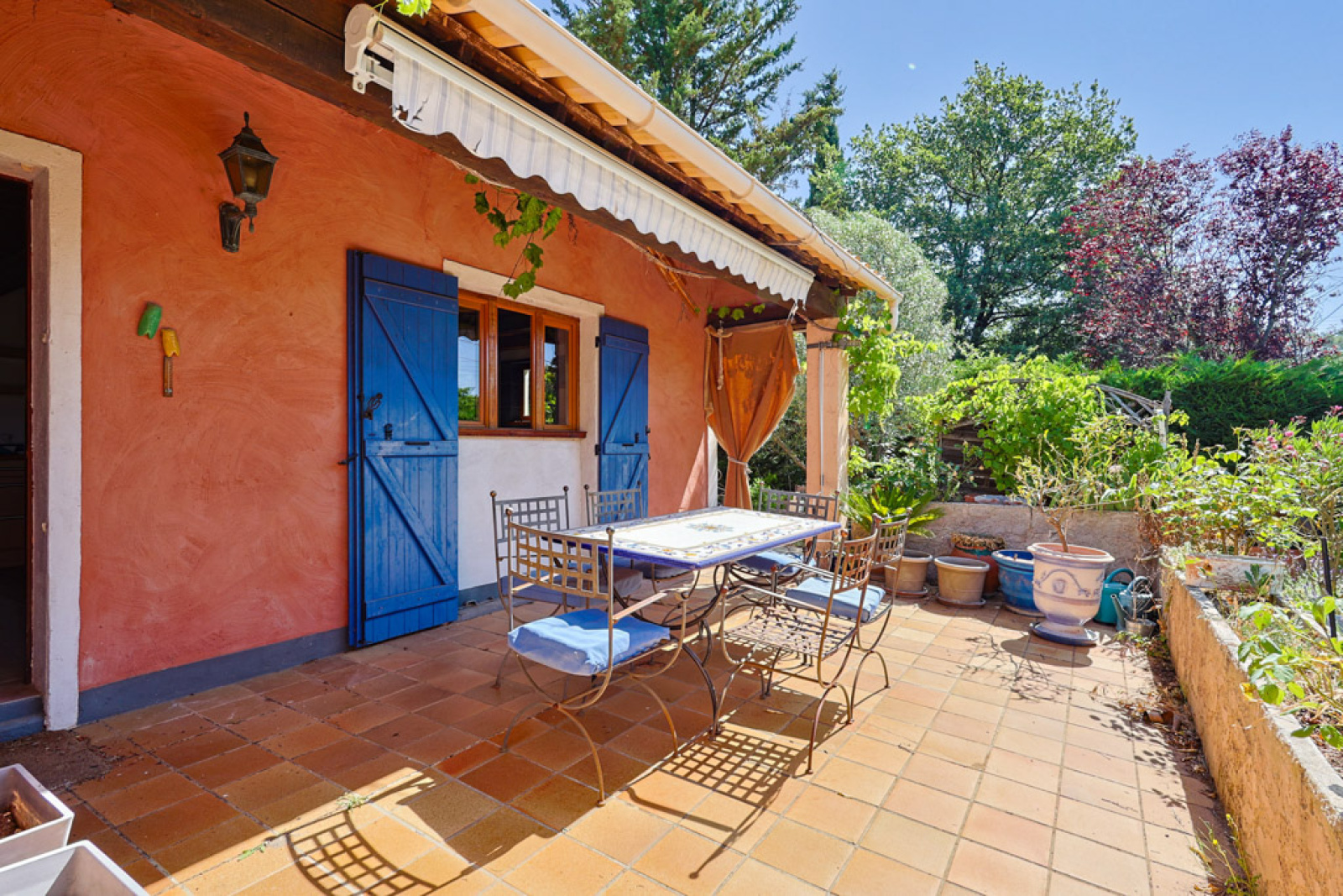 Le jardin comporte de nombreuses terrasses d'été et des coins salons qui créent une atmosphère agréable et relaxante. Il y a également un vieux cabanon en pierre.