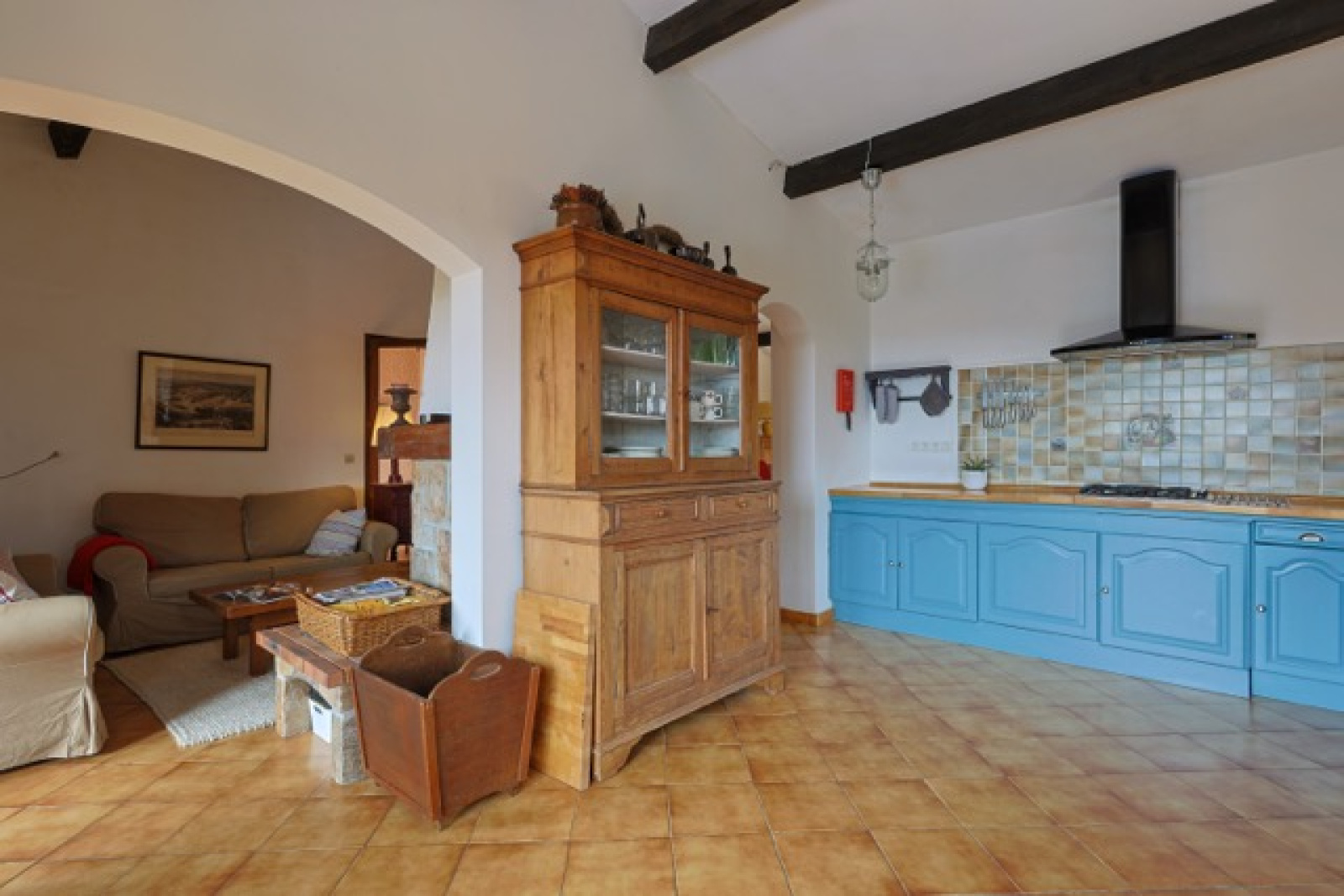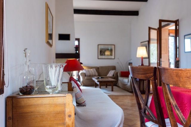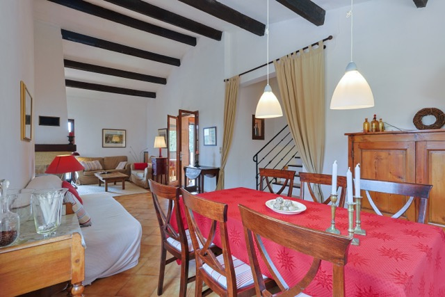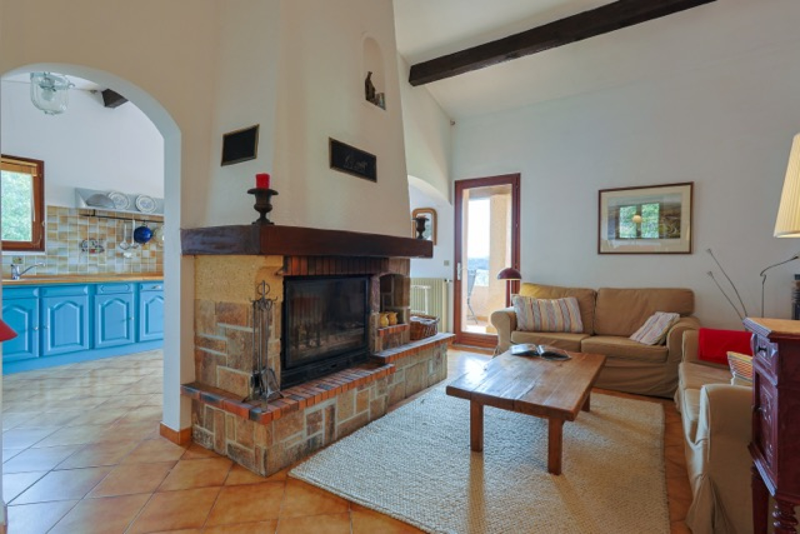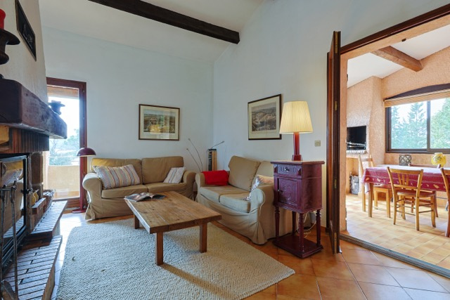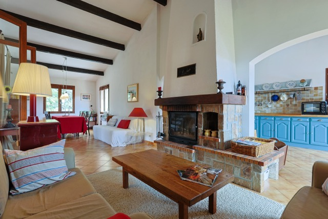 La partie vie se compose d'un bel espace ouvert avec une cheminée au milieu. La cuisine est spacieuse et a un accès direct à la terrasse couverte qui donne une vue sur le jardin et les environnements. La maison est dotée d'un sol carrelé, de poutres en bois et de portes qui s'ouvrent sur plusieurs terrasses extérieures. La terrasse au rez-de-jardin est couverte et offre une ombre bienvenue pendant les jours d'été. Idéale pour les repas en plein air entre famille et les amis. La terrasse du premier étage est exposée au sud.