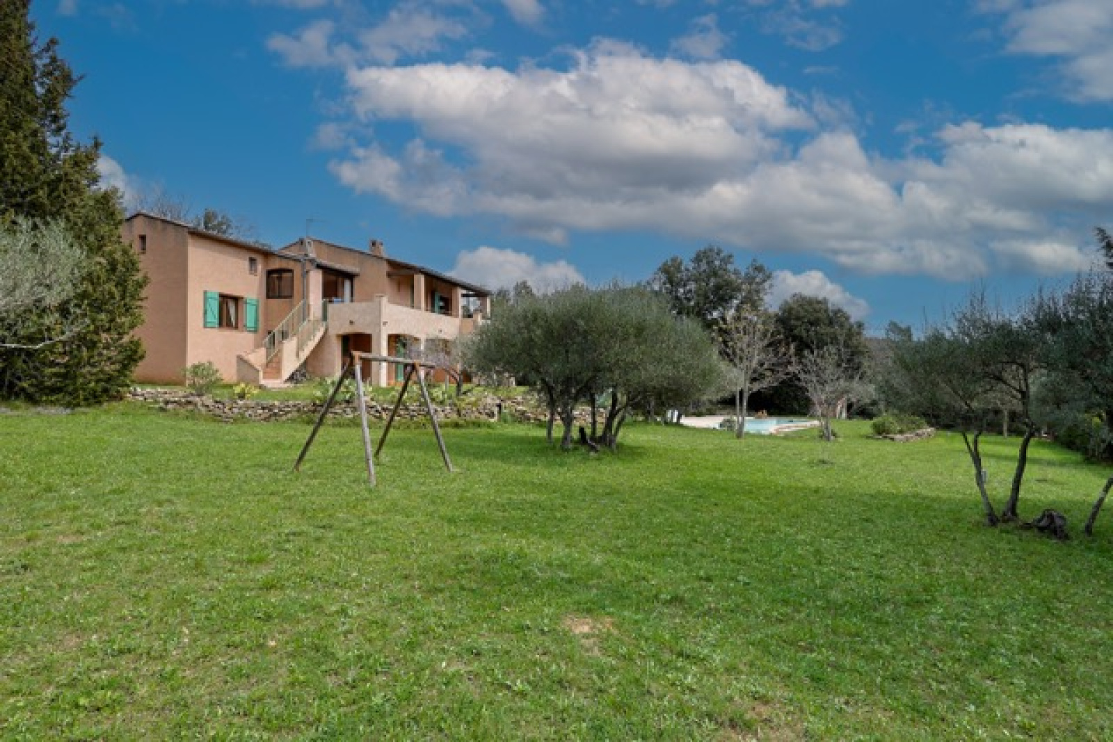 La piscine au sel (Diffazur) est en forme libre avec une terrasse autour. Le jardin est entièrement clôturé.