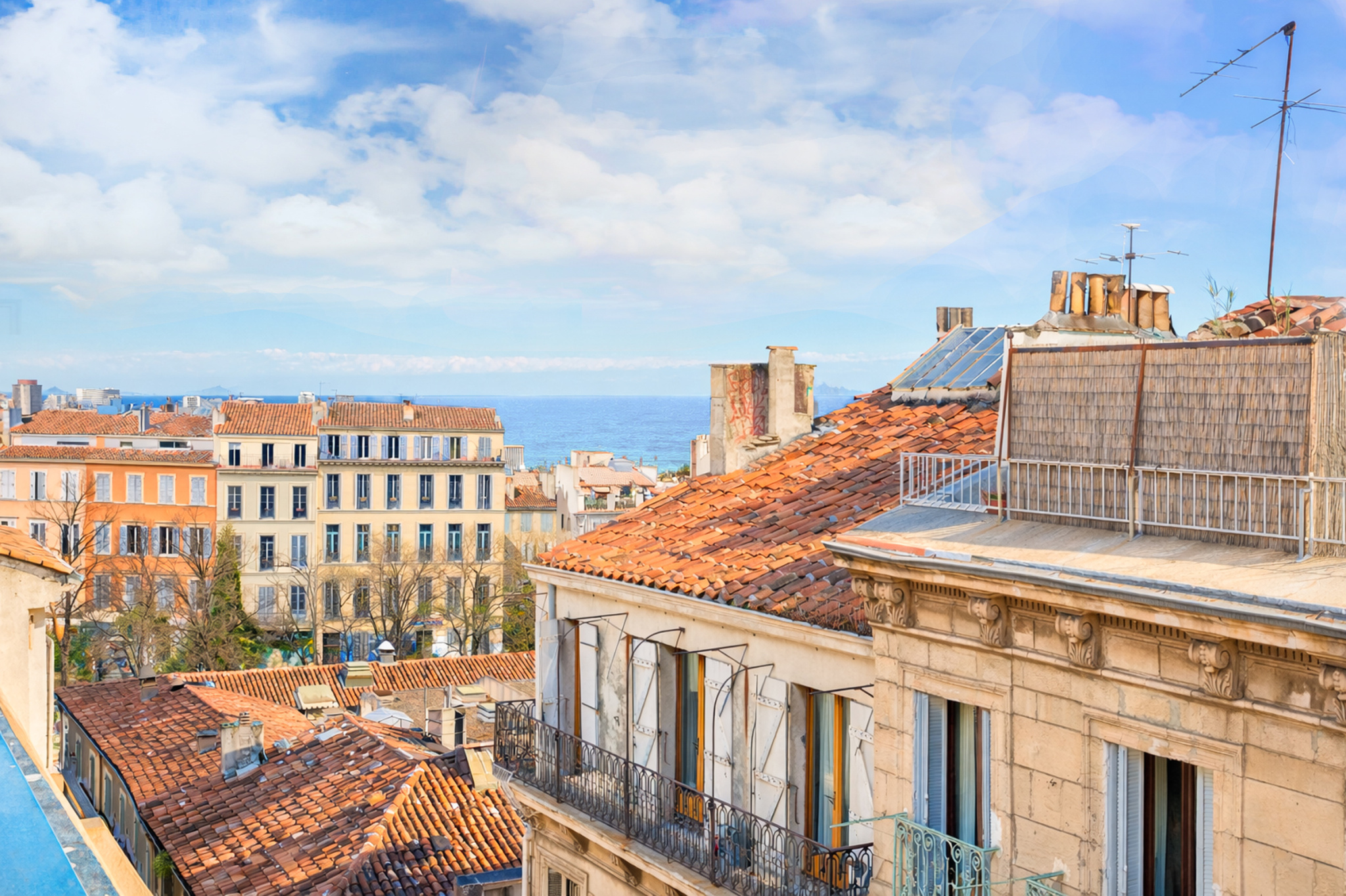 Depuis sa belle terrasse, on profite d'une petite vue mer et d'un panorama dégagé au-dessus des toits.