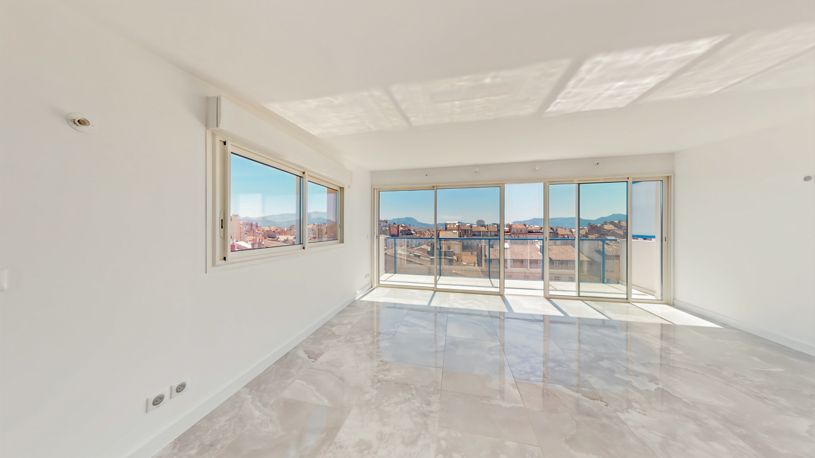 Séjour lumineux ouvrant sur une vaste terrasse plein sud avec vue dégagée jusqu'à Notre-Dame de la Garde.