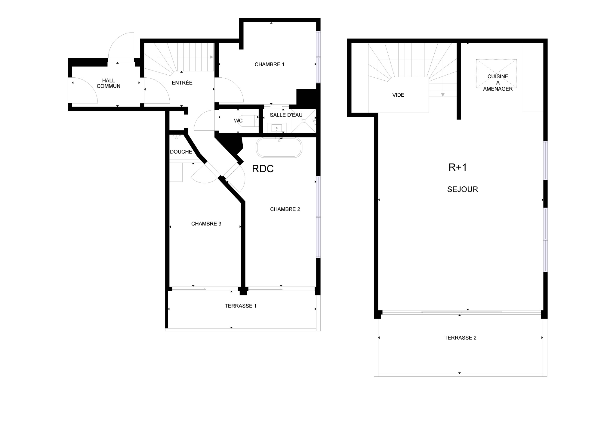 Trois chambres, chacune avec salle d'eau privative (dont une avec baignoire).