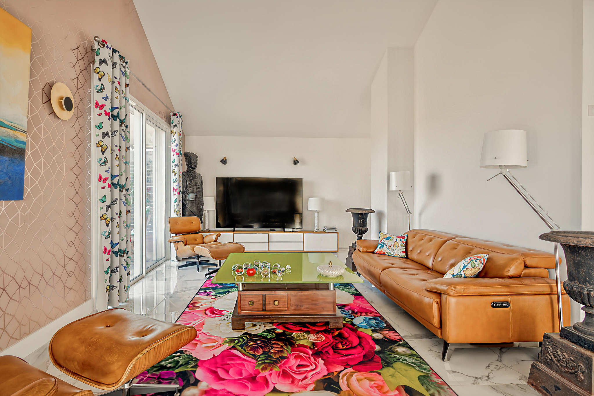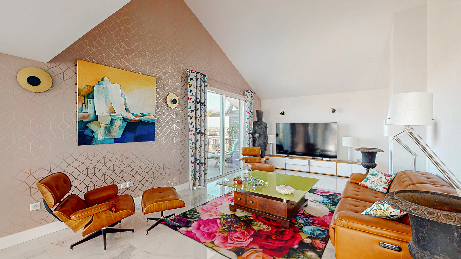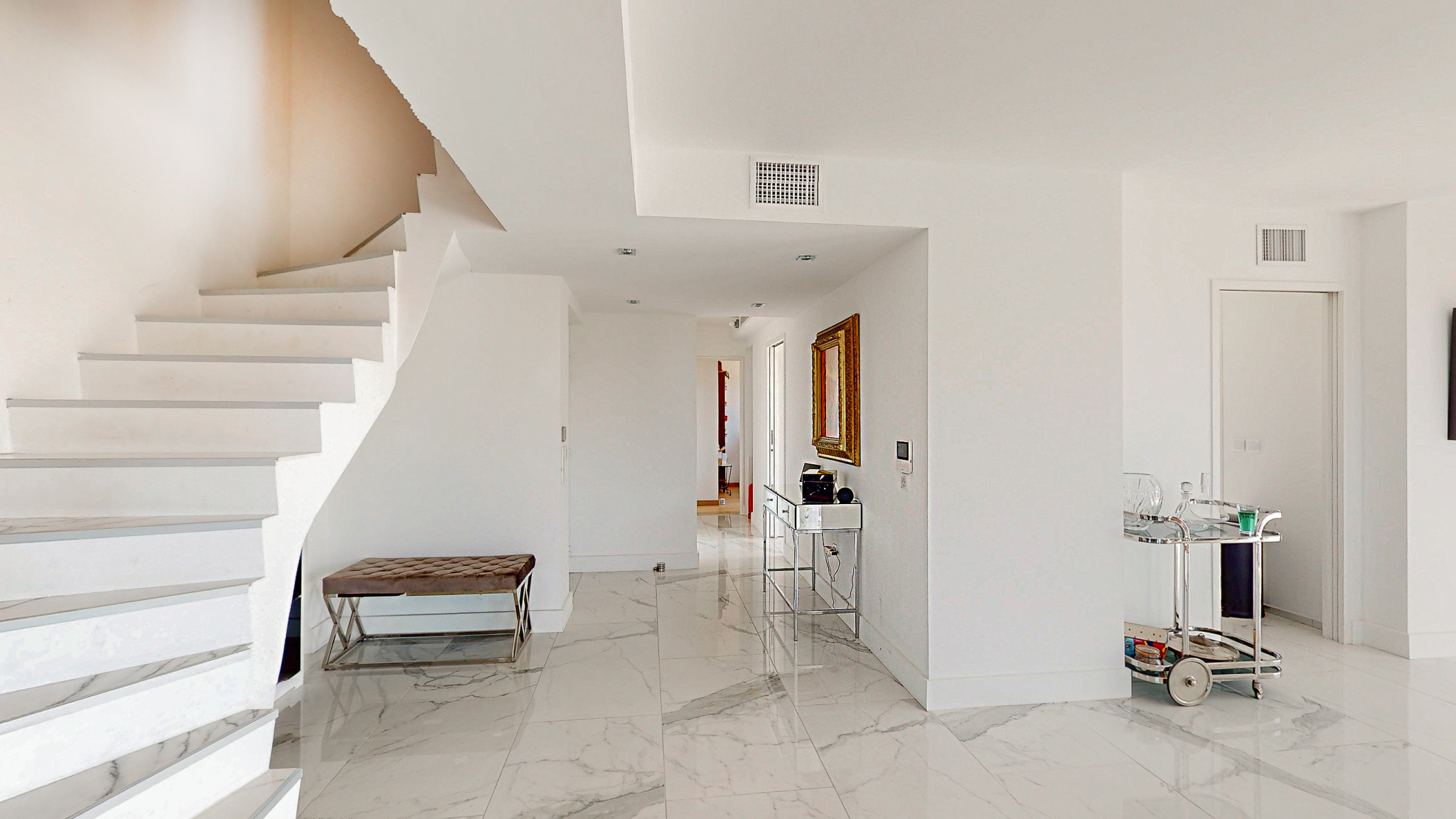 Un penthouse au style résolument contemporainLe design intérieur, à la fois audacieux et chaleureux, conjugue des finitions haut de gamme à une architecture baignée de lumière. Le sol en marbre poli reflète les jeux de lumière naturelle, tandis que les luminaires sculpturaux ajoutent une touche artistique à l’ensemble, instaurant une ambiance à la fois raffinée et accueillante. Des rideaux tamisent subtilement la lumière du jour, et à la nuit tombée, un éclairage indirect, programmable, prolonge l’atmosphère feutrée et élégante du lieu.
