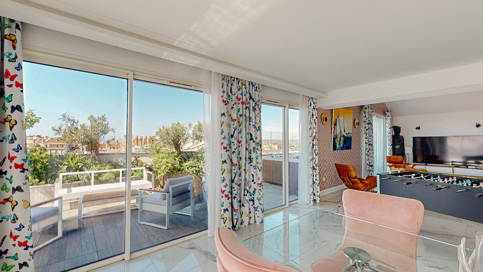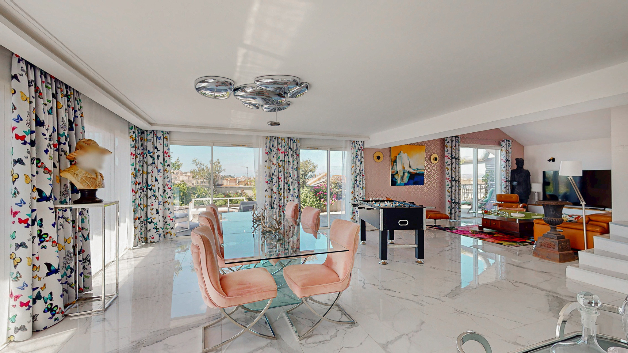 L’entrée principale s’ouvre sur une vaste pièce de vie baignée de lumière grâce à de larges baies vitrées donnant accès à une première terrasse aménagée avec jacuzzi, solarium et coin repas. Le séjour double, à la décoration raffinée mêlant design contemporain et touches vintage, s’organise autour d'une salle à manger vitrée et salon lounge.La cuisine ouverte, élégamment équipée, offre une grande convivialité avec la possibilité de prendre ses repas en extérieur, face à la ville et à la mer. Une première chambre avec salle d’eau privative et terrasse complète ce niveau. Buanderie, espace de rangement et WC indépendants assurent un confort optimal.