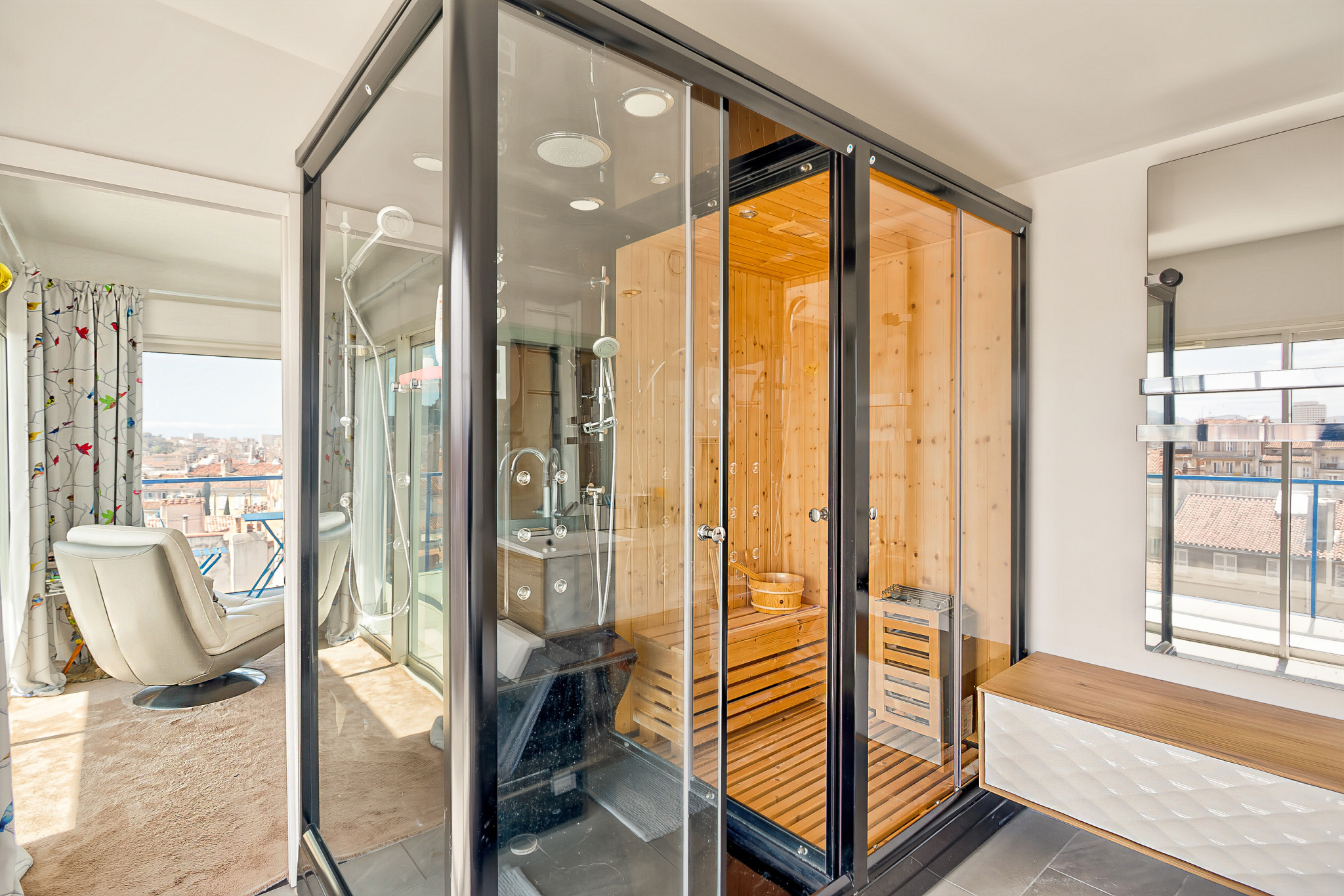 Au derniers étages (6e et 7e) d’une résidence contemporaine avec Piscine, salle de sports en R-1 dans le 6eme arrondissement de Marseolle, ce penthouse en duplex développe 175 m² carrez prolongés par deux grandes terrasses plein ciel totalisant 100m2. Il domine la ville avec une des vues les plus spectaculaires sur Marseille, jusqu’à la mer.