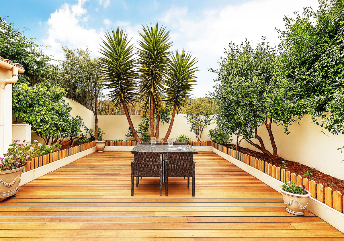 À l’extérieur, la terrasse en bois éxotique de 40 m² s’impose comme une véritable pièce de vie supplémentaire. Agrémentée de plantes aux inspirations méditerranéennes et tropicales, elle offre un cadre agréable pour recevoir, partager des repas ou profiter des beaux jours en toute tranquillité.