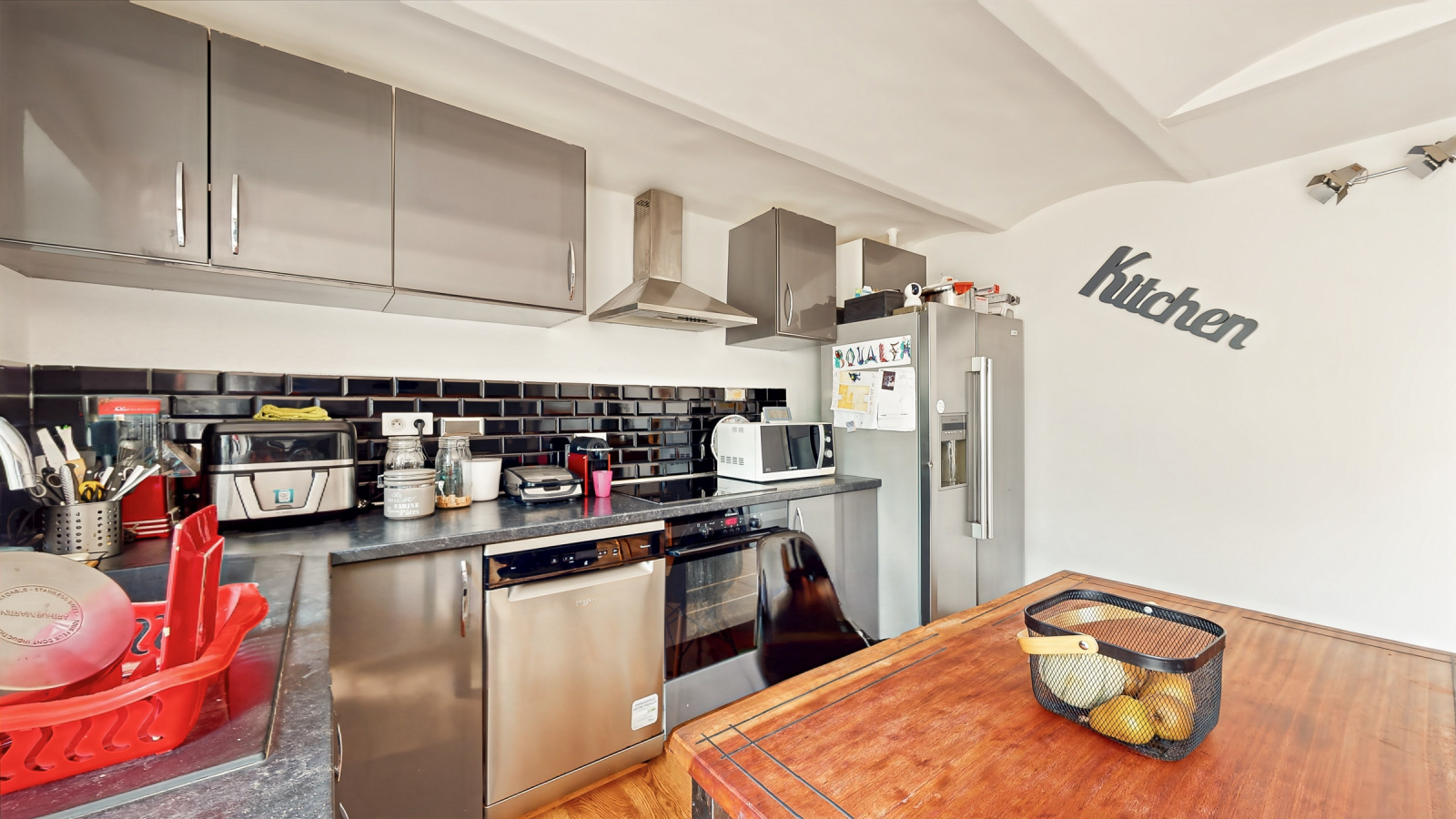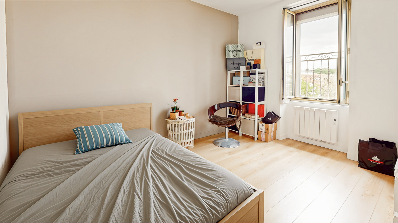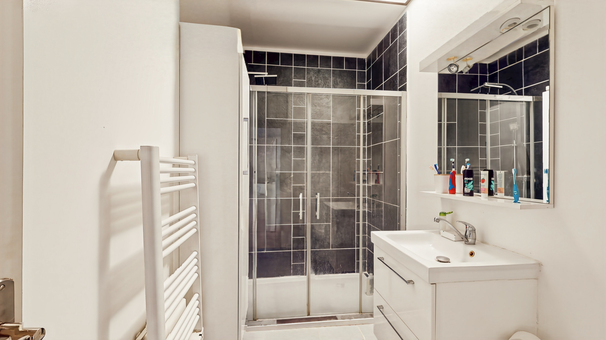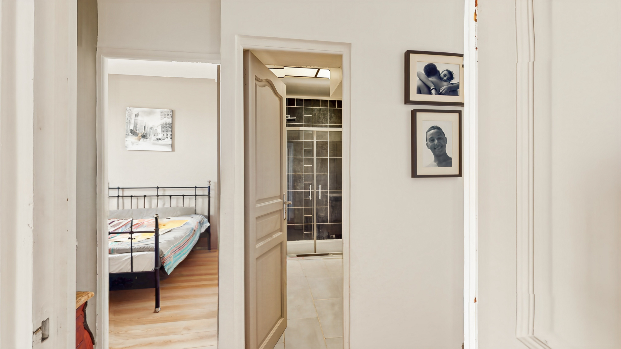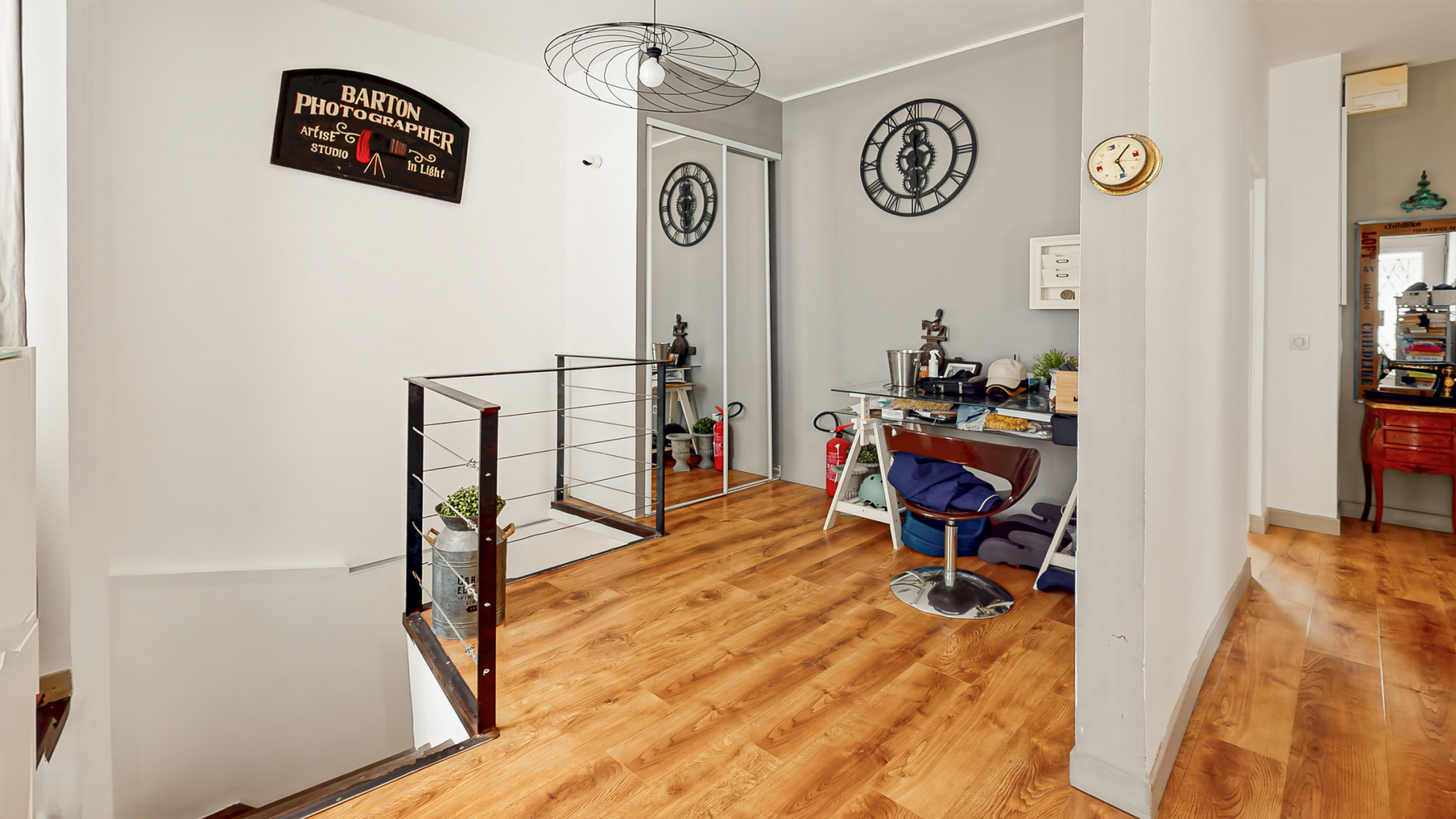 À l’étage, accessible également depuis la rue, l’espace nuit accueille trois chambres, dont une suite parentale avec dressing. Une salle d’eau épurée et fonctionnelle complète ce niveau, ainsi qu’un espace bureau idéal pour le télétravail ou un coin lecture.