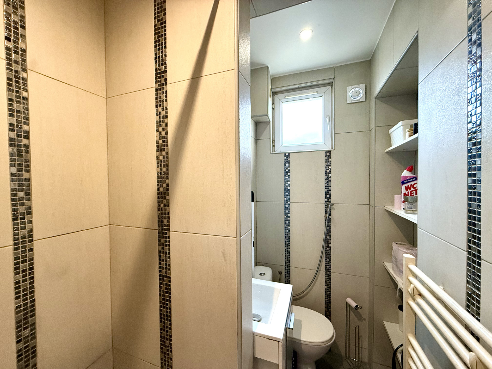 Appartement en très bon état, F2 de 34m2 loi carrez avec entrée, séjour, cuisine séparée, une chambre avec placards de rangement, salle d'eau avec wc et lavabo