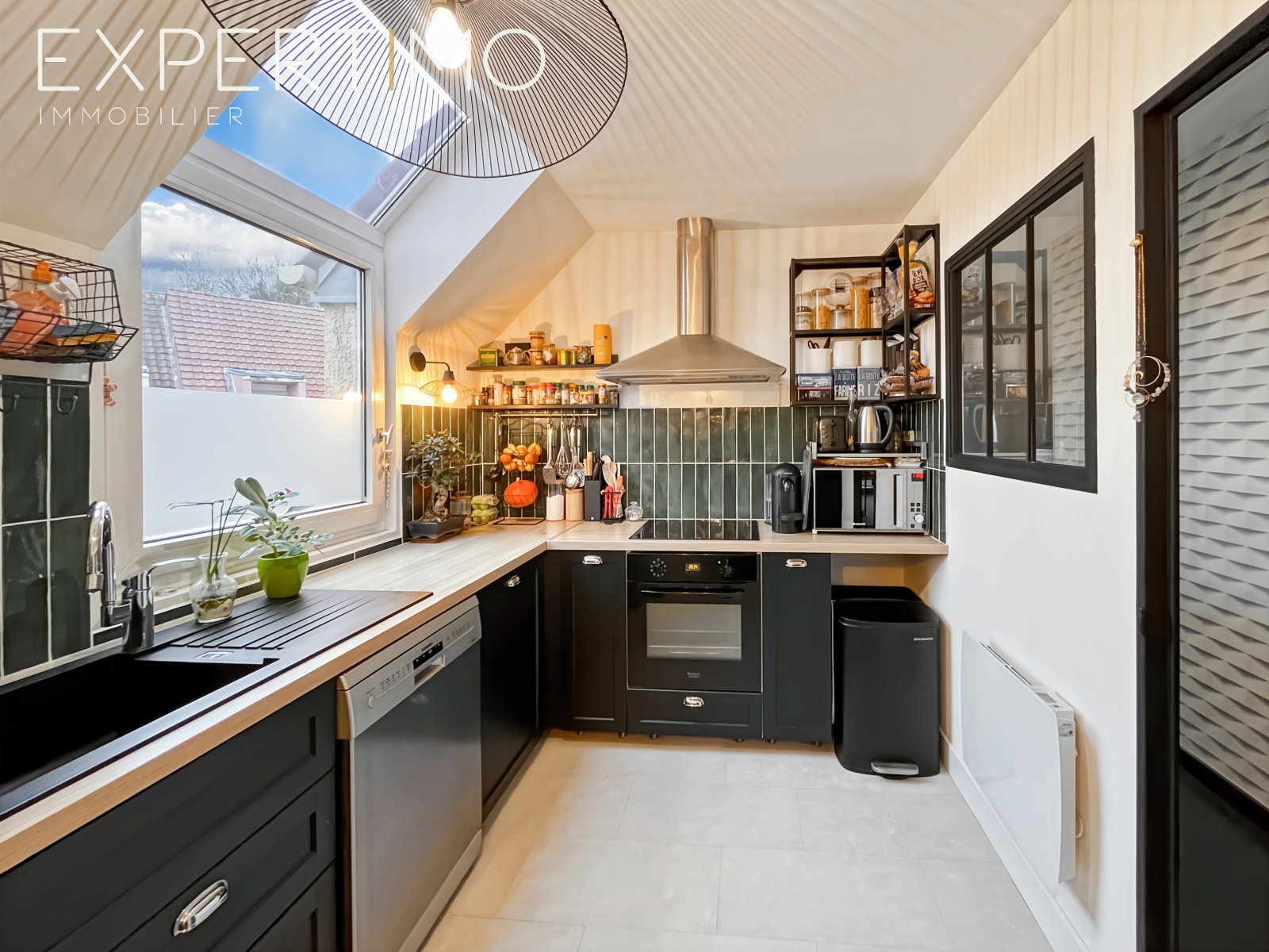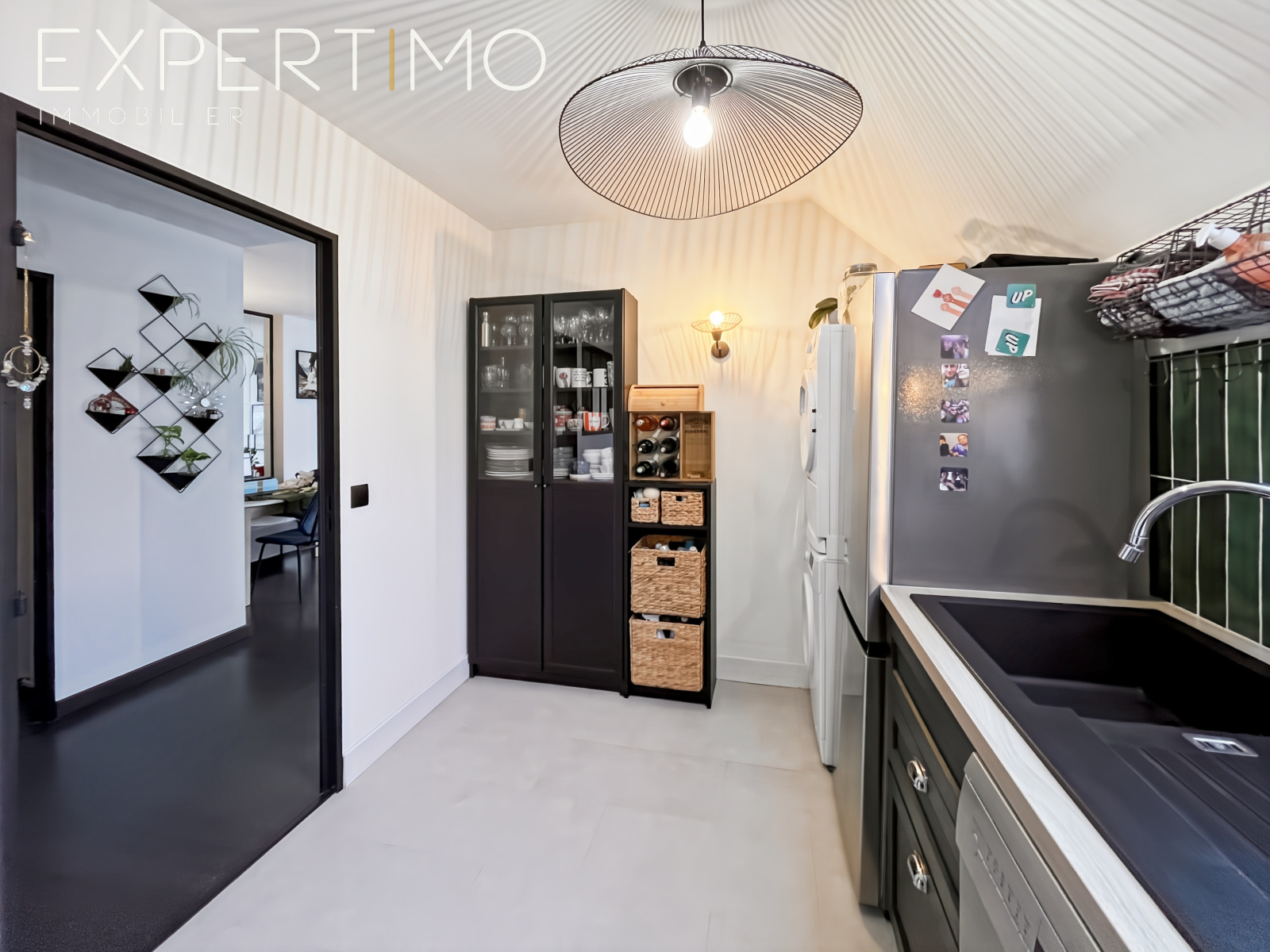 La cuisine aménagée et équipée s’ouvre sur un salon-séjour traversant, lumineux tout au long de la journée.