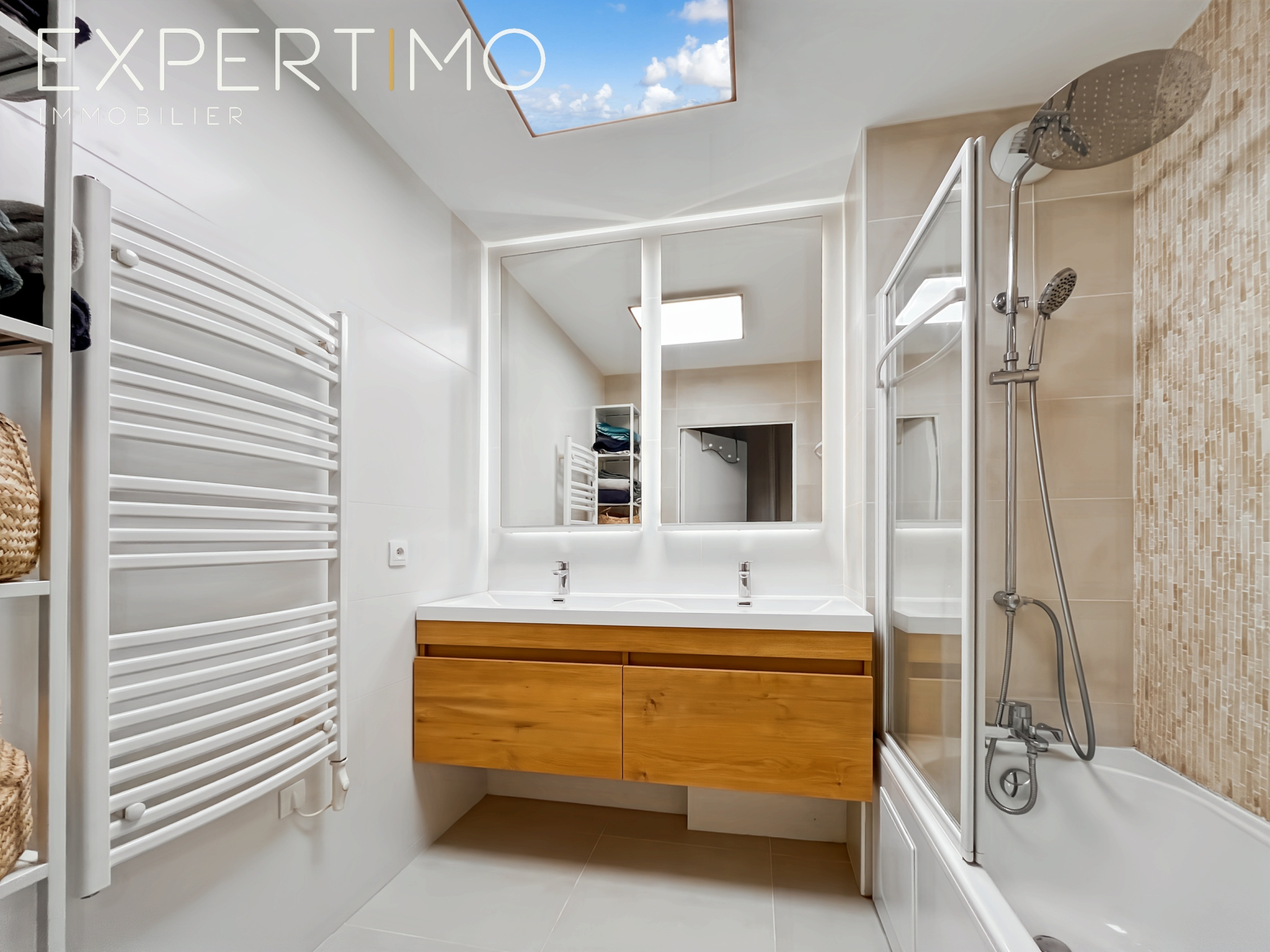 L’espace nuit comprend un grand placard de rangement, deux chambres dont une avec accès direct à la terrasse , ainsi qu’une salle de bains avec double vasque.
