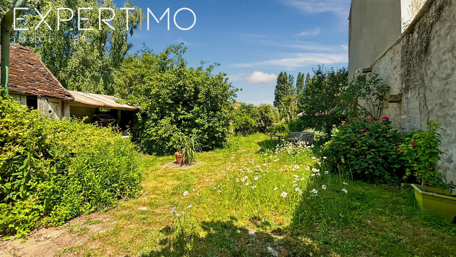 L’extérieur de la maison comprend de nombreuses annexes : une buanderie, une cave voûtée, un cabanon et trois garages de 15 m² chacun, offrant ainsi de nombreuses options de rangement ou de loisirs.