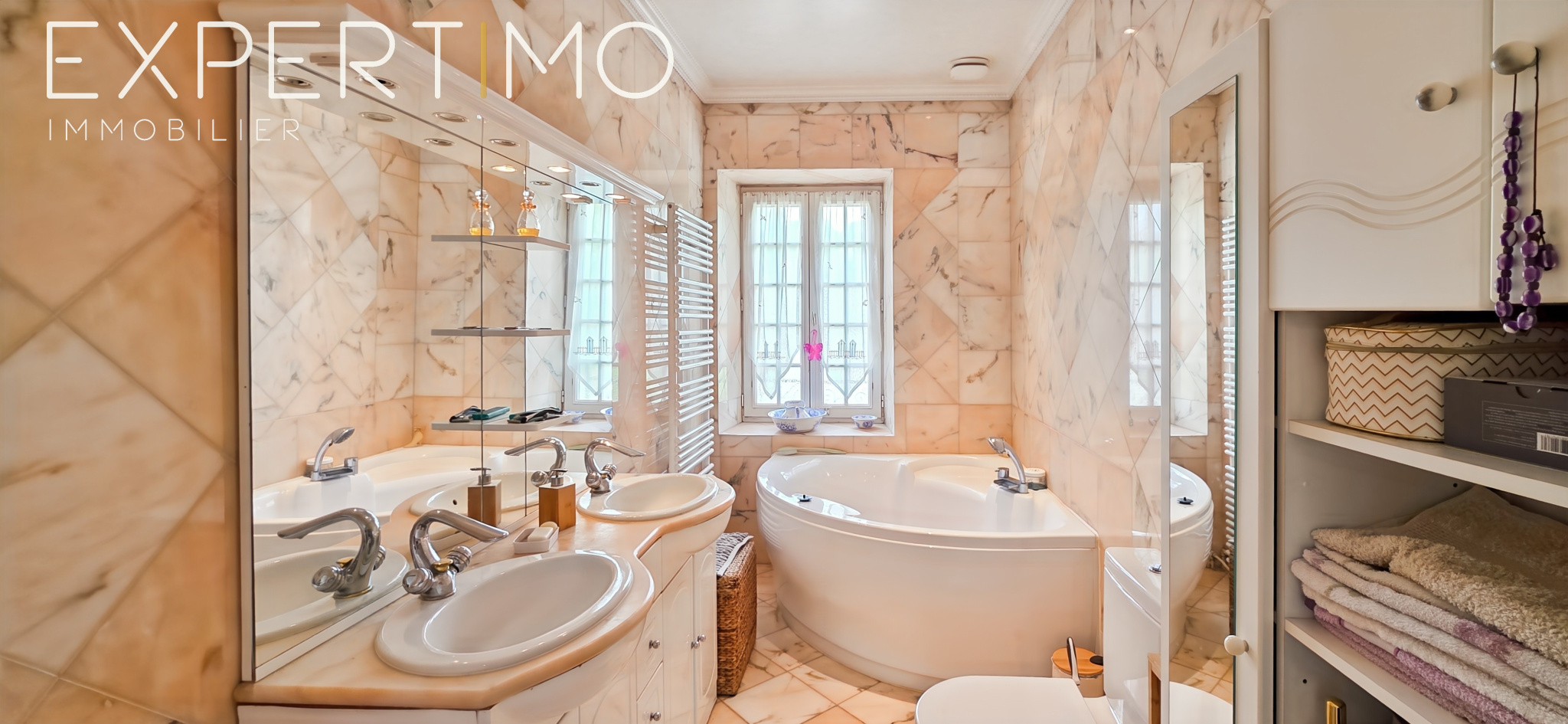 À l’étage, trois chambres spacieuses, dont une suite parentale avec dressing, s’articulent autour d’un palier central et d’une salle de bains en marbre rose. Un sous-sol total d’environ 72 m² complète la maison principale.