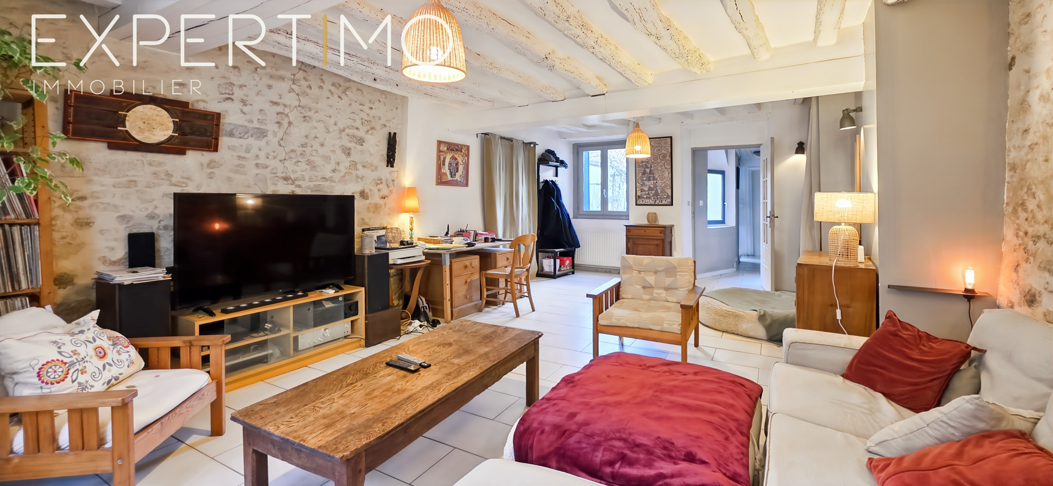 Derrière une façade discrète, ce bien développe 133 m² habitables (145 m² au sol) et se distingue par son authenticité : murs en pierre apparente, poutres, volumes chaleureux et organisation atypique qui lui confèrent un véritable cachet.