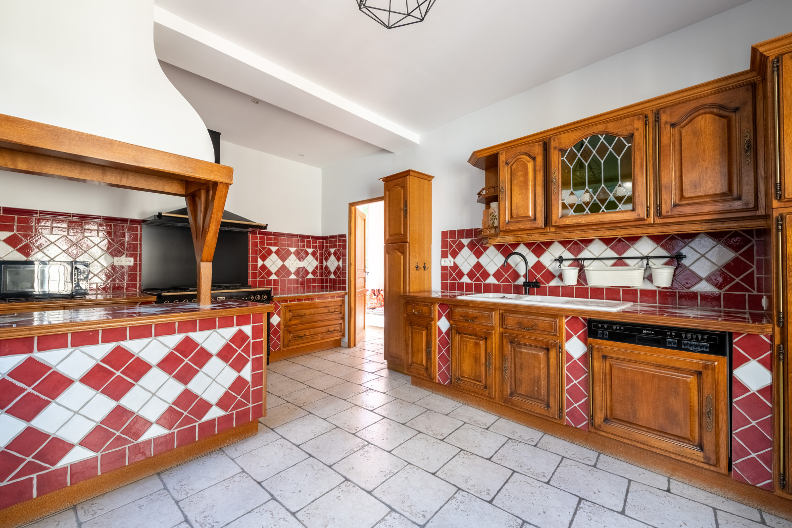 Dans la continuité, une seconde pièce, de dimensions comparables, reprend les mêmes codes architecturaux et s’ouvre elle aussi sur le jardin. Elle communique avec une cuisine indépendante, généreuse et équipée d’un piano de cuisson. Celle-ci dispose d’une double ouverture : sur une cour d’un côté, et, par l’intermédiaire d’une petite pièce, vers le jardin de l’autre, offrant une circulation fluide entre les espaces. La salle d'eau équipée de toilettes s’inscrit dans ce même ensemble.