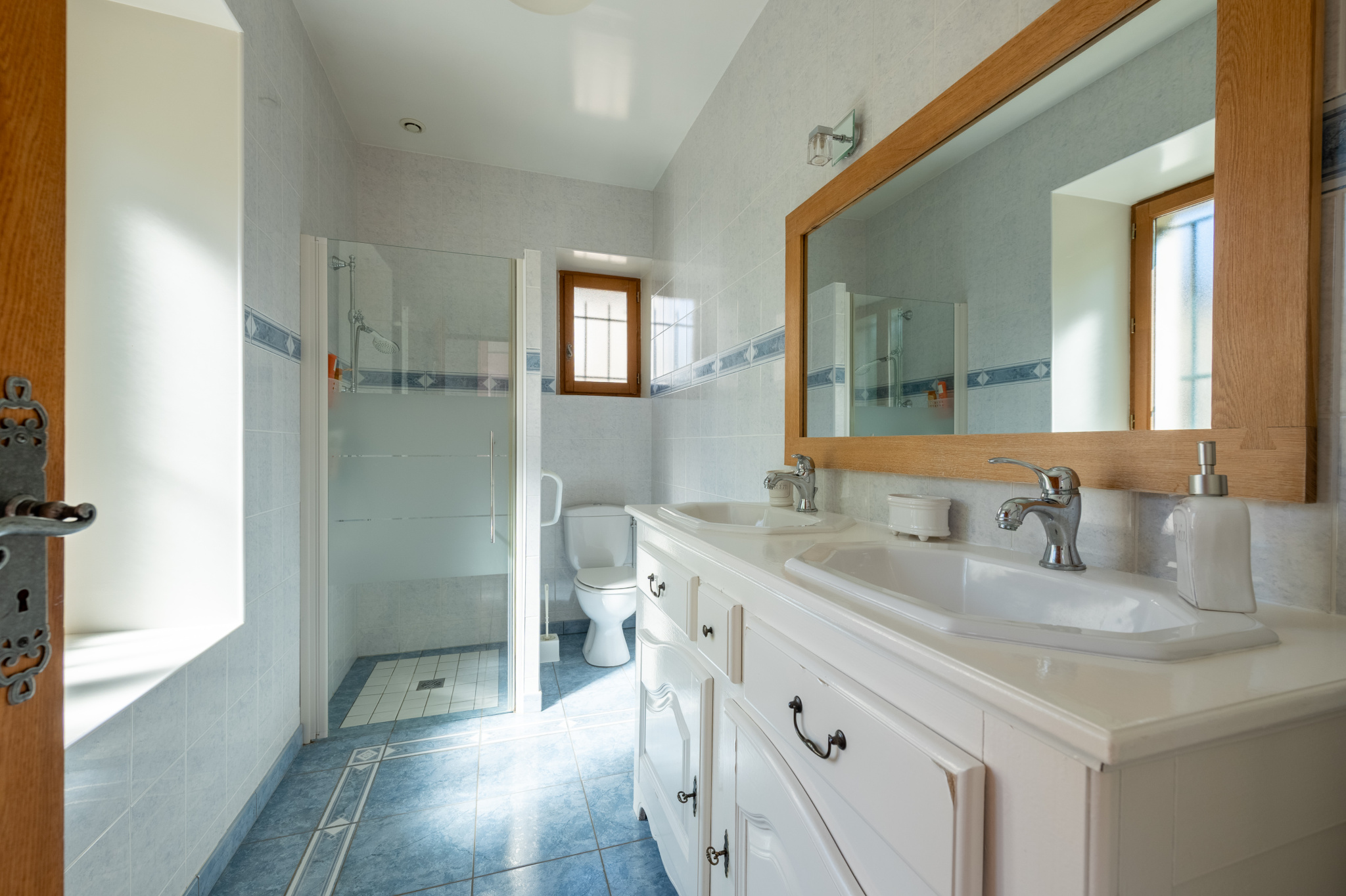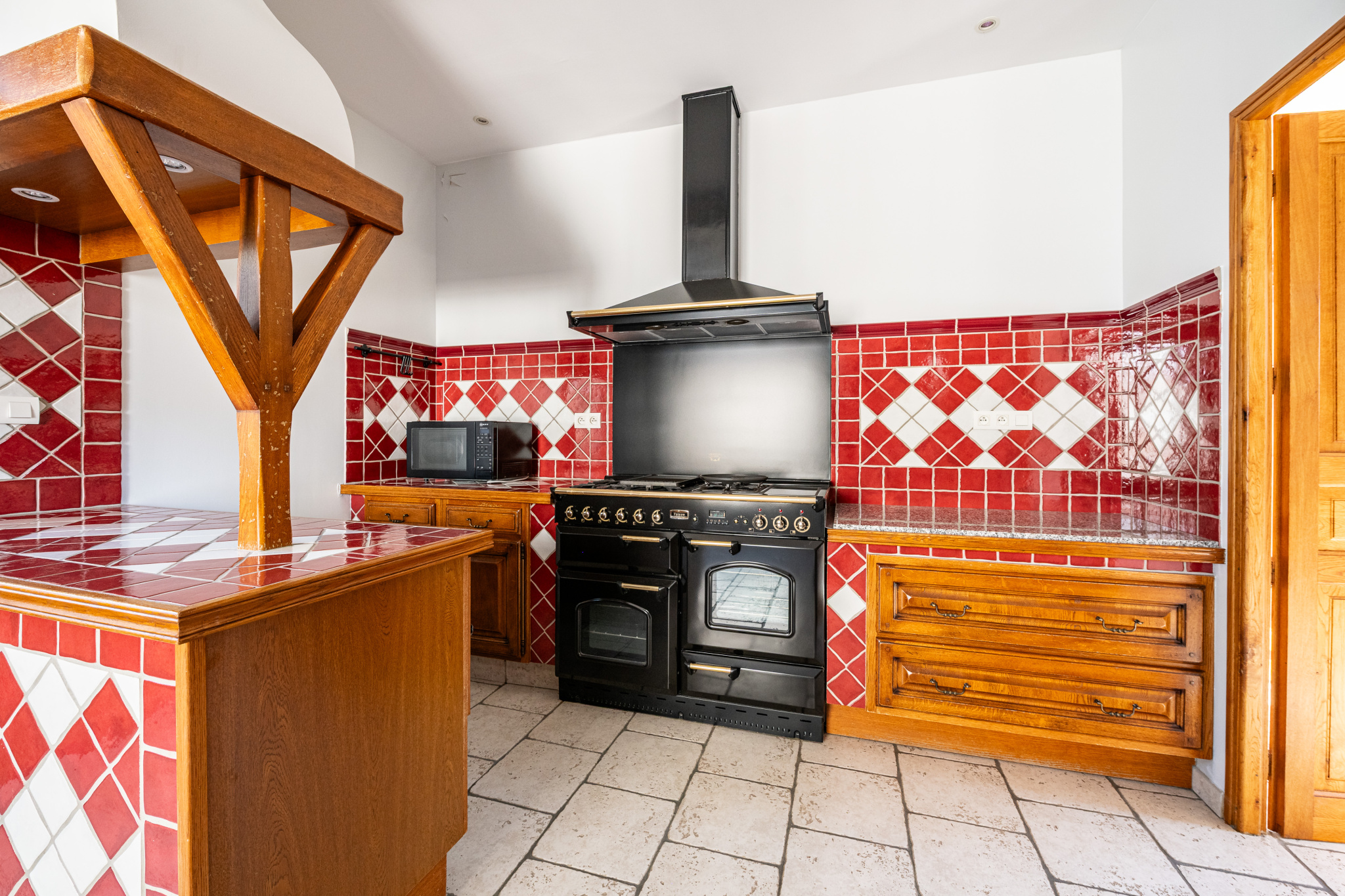 L’arrivée s’organise autour d’un hall d’accueil qui introduit une vaste pièce de réception. Le regard est immédiatement accroché par les proportions et la présence affirmée des éléments anciens. Une large porte-fenêtre prolonge naturellement l’espace vers le jardin.