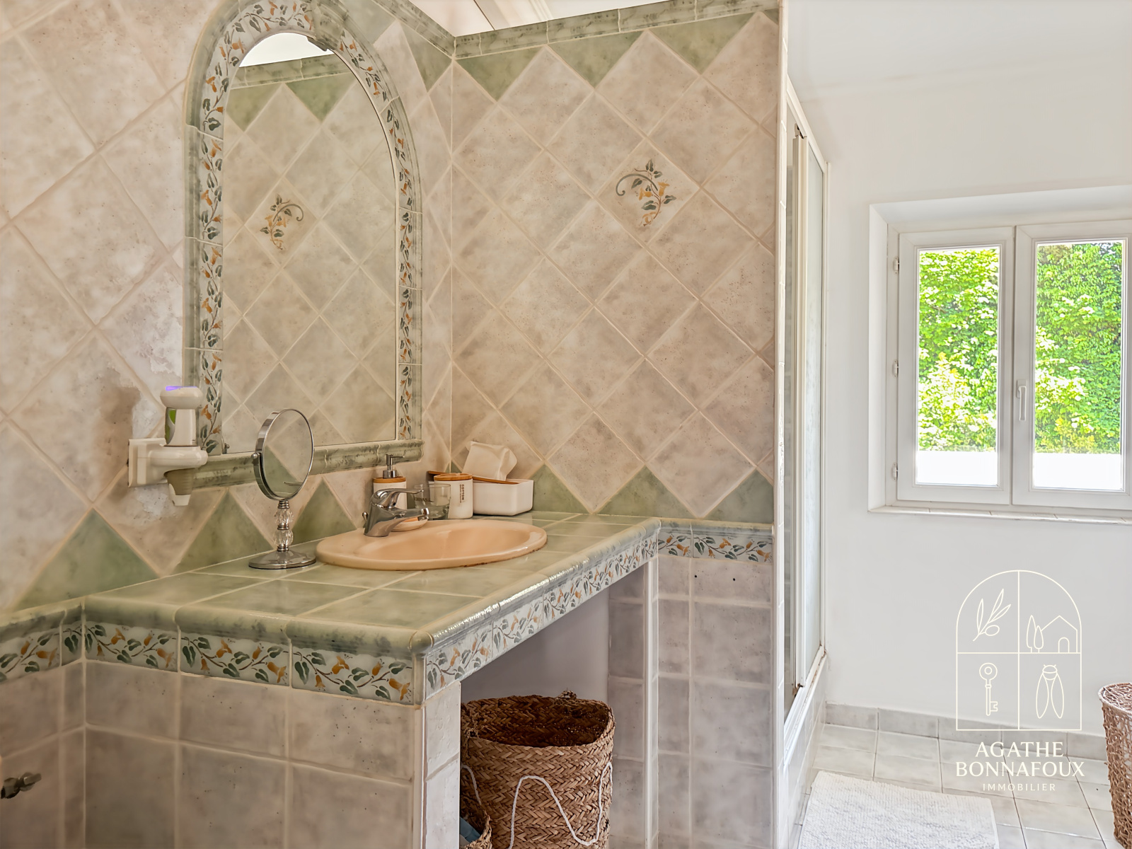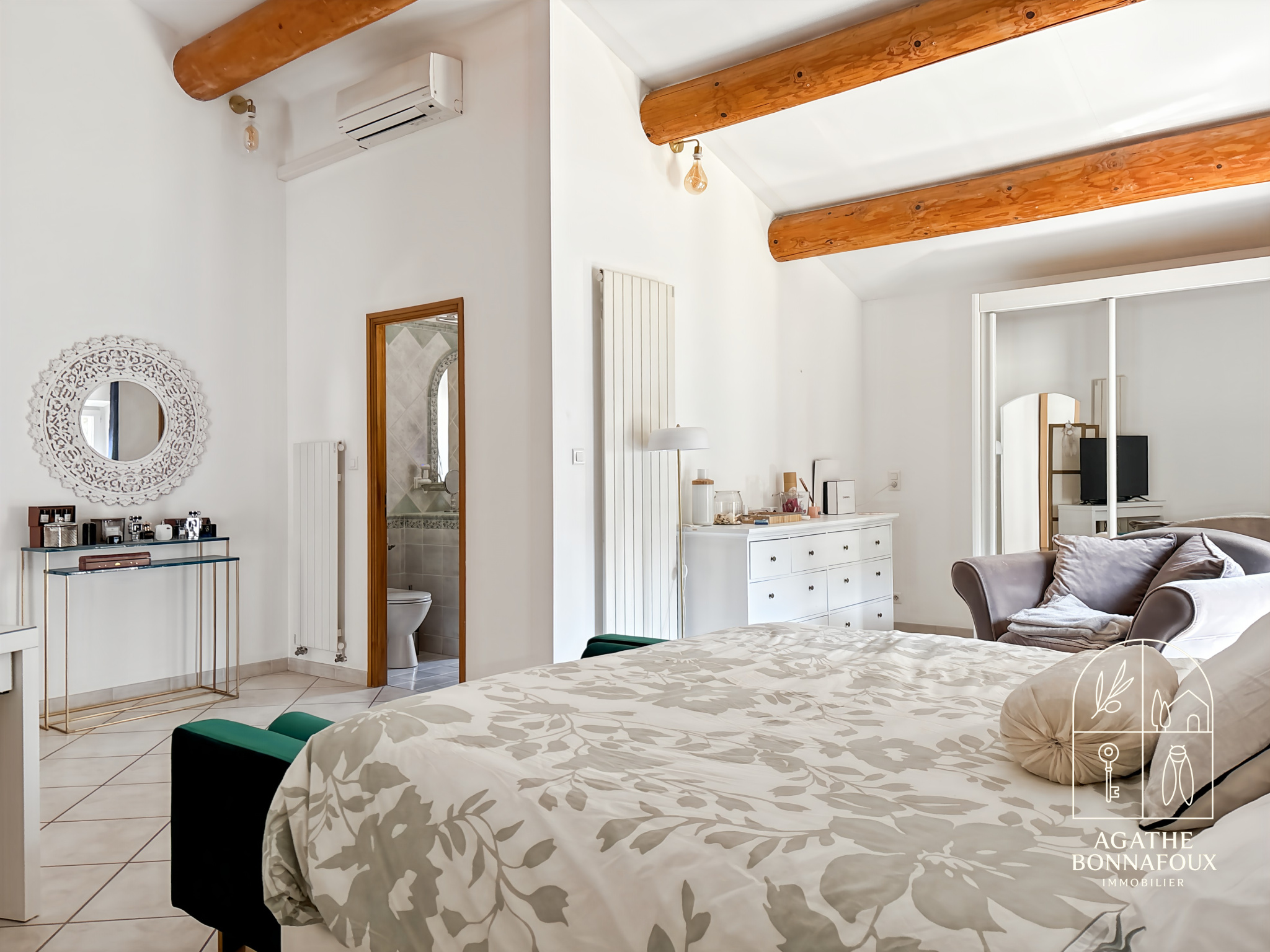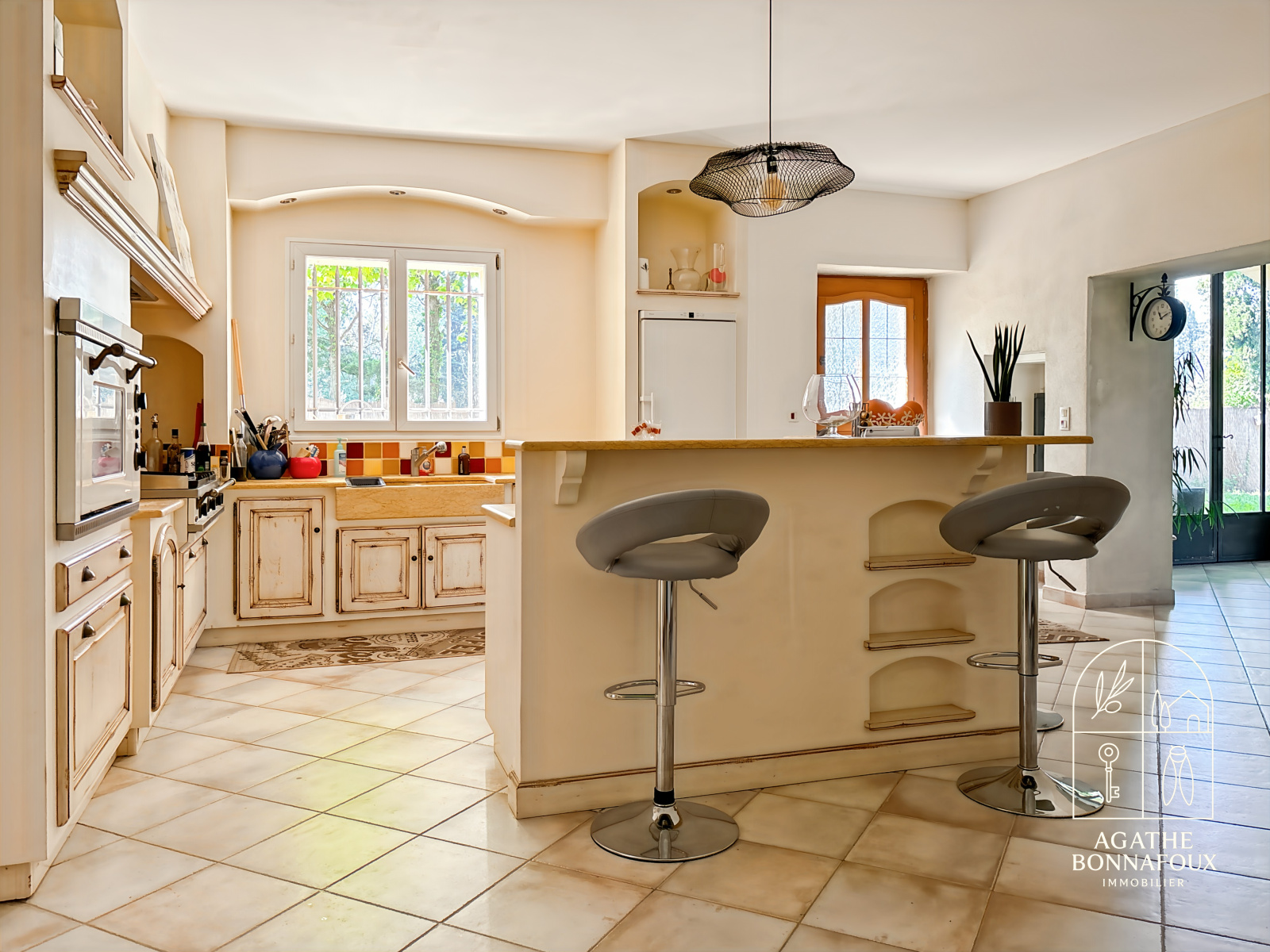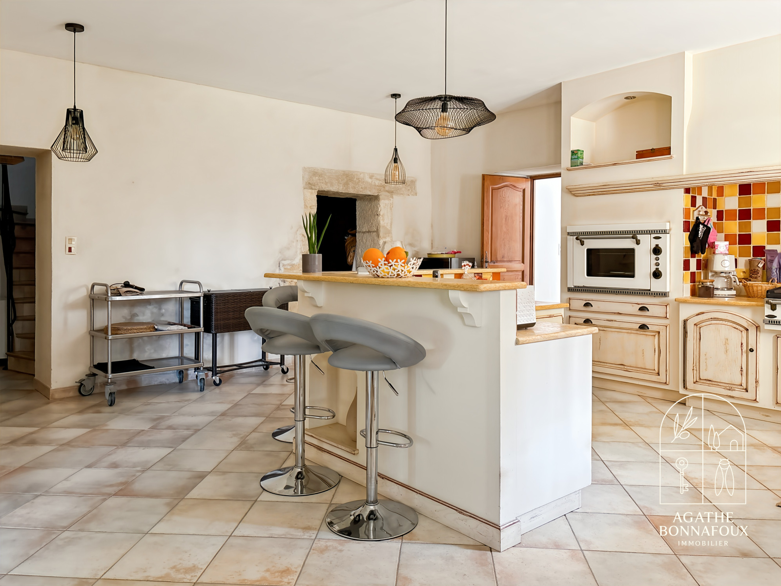 Le rez-de-chaussée s’ouvre sur une élégante cuisine provençale aux volumes généreux ainsi qu’un séjour lumineux avec salon et cheminée, sublimé par ses matériaux nobles et son atmosphère chaleureuse.
