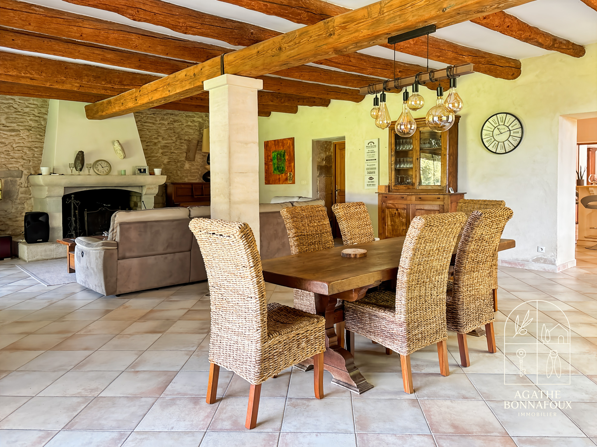 Développant 341 m² habitables, cette propriété offre un cadre de vie rare où le charme de l’ancien – pierres apparentes, poutres authentiques et cheminée – se conjugue harmonieusement avec le confort contemporain (rénovation globale).