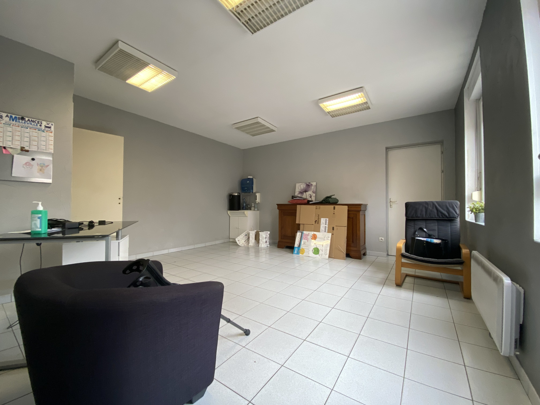 - Au rez de chaussée : sur 56 m2, une entrée, une salle d'attente, deux pièces de 23 m2 et 20 m2, wc,