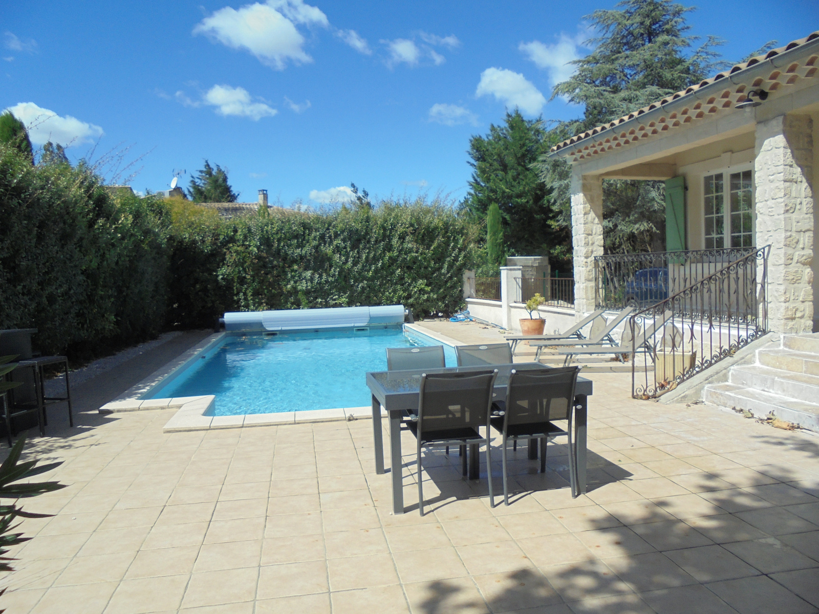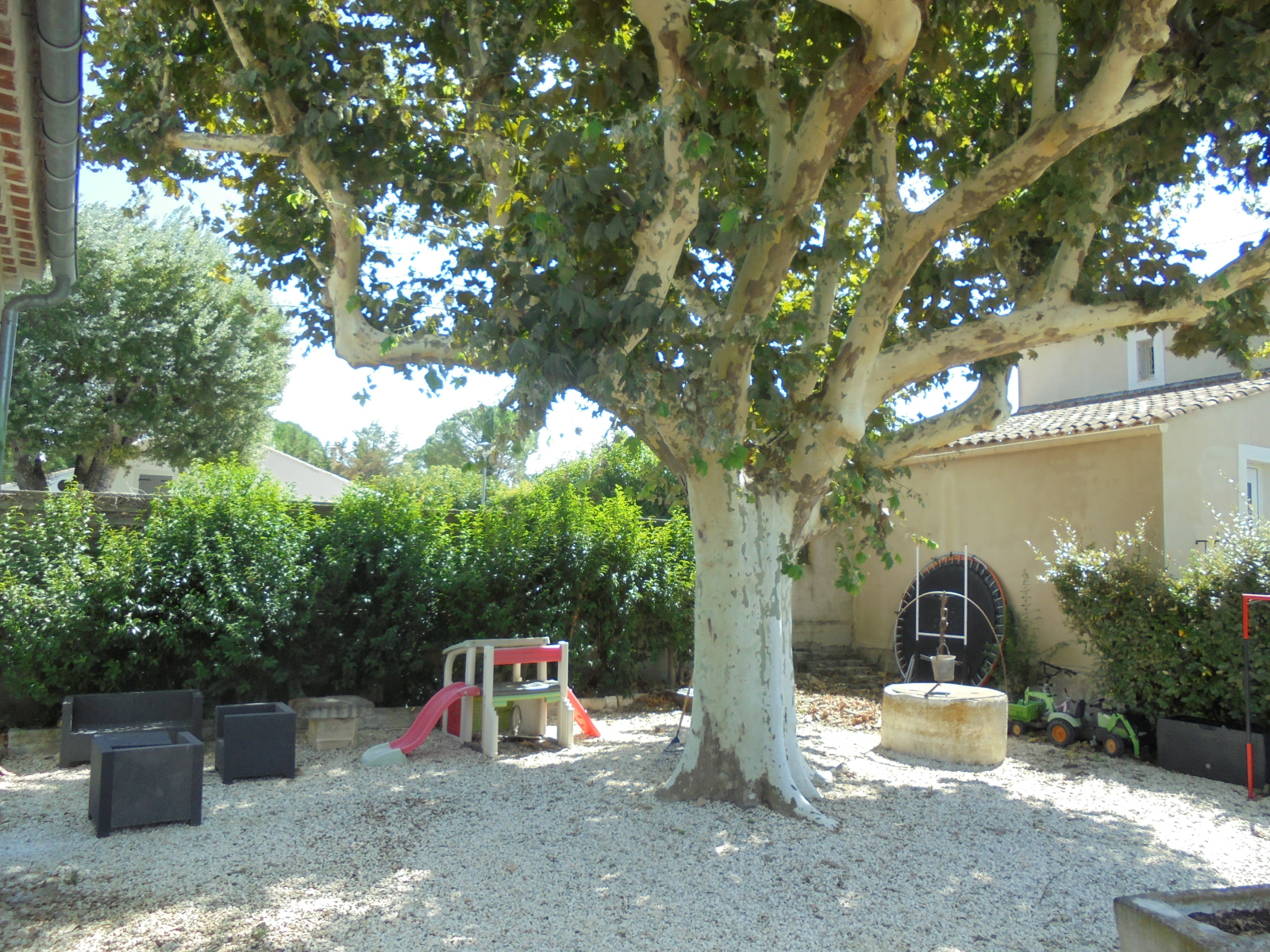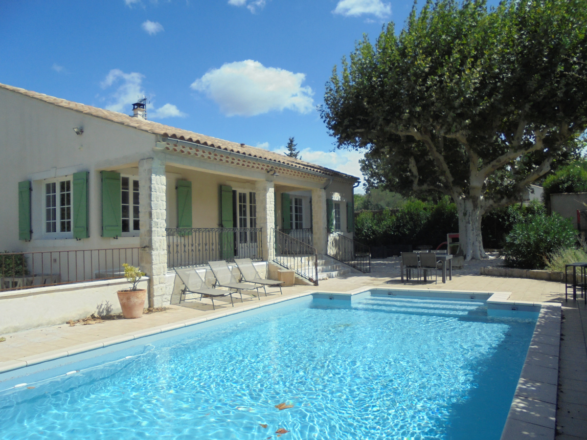 *** VENDU *** Eyragues, dans quartier résidentiel très calme, belle maison qualitative de plain-pied orientée plein Sud, maison années 1966, d'une superficie de 135 m2, entièrement rénovée avec de belles prestations ! comprenant une vaste pièce de vie de 60 m2 avec cuisine ouverte équipée, 3 chambres dont une suite parentale avec salle d'eau et dressing, une salle de bains, 2 w.c., et un grand garage attenant de 40 m2 pouvant être aménagé, possibilité d'étendre encore le bâti. L'ensemble sur un beau terrain arboré et clôturé de 1300 m2, avec piscine traditionnelle au sel de 10x5 sécurisée. Un très beau platane au-devant vous permettra de magnifiques moments de détente !
