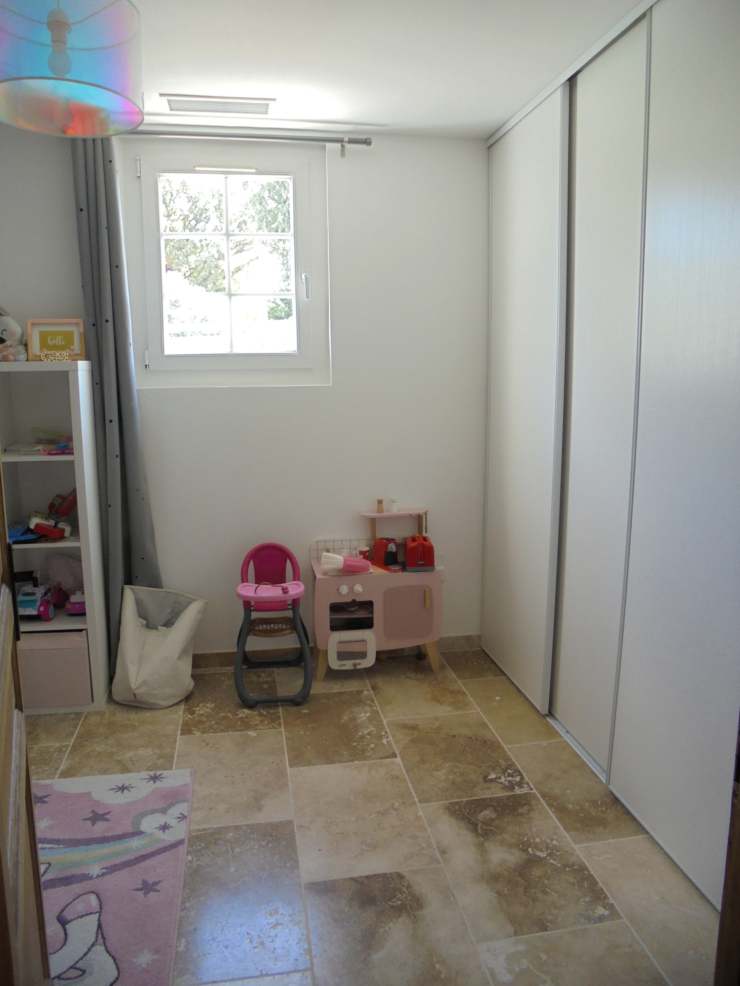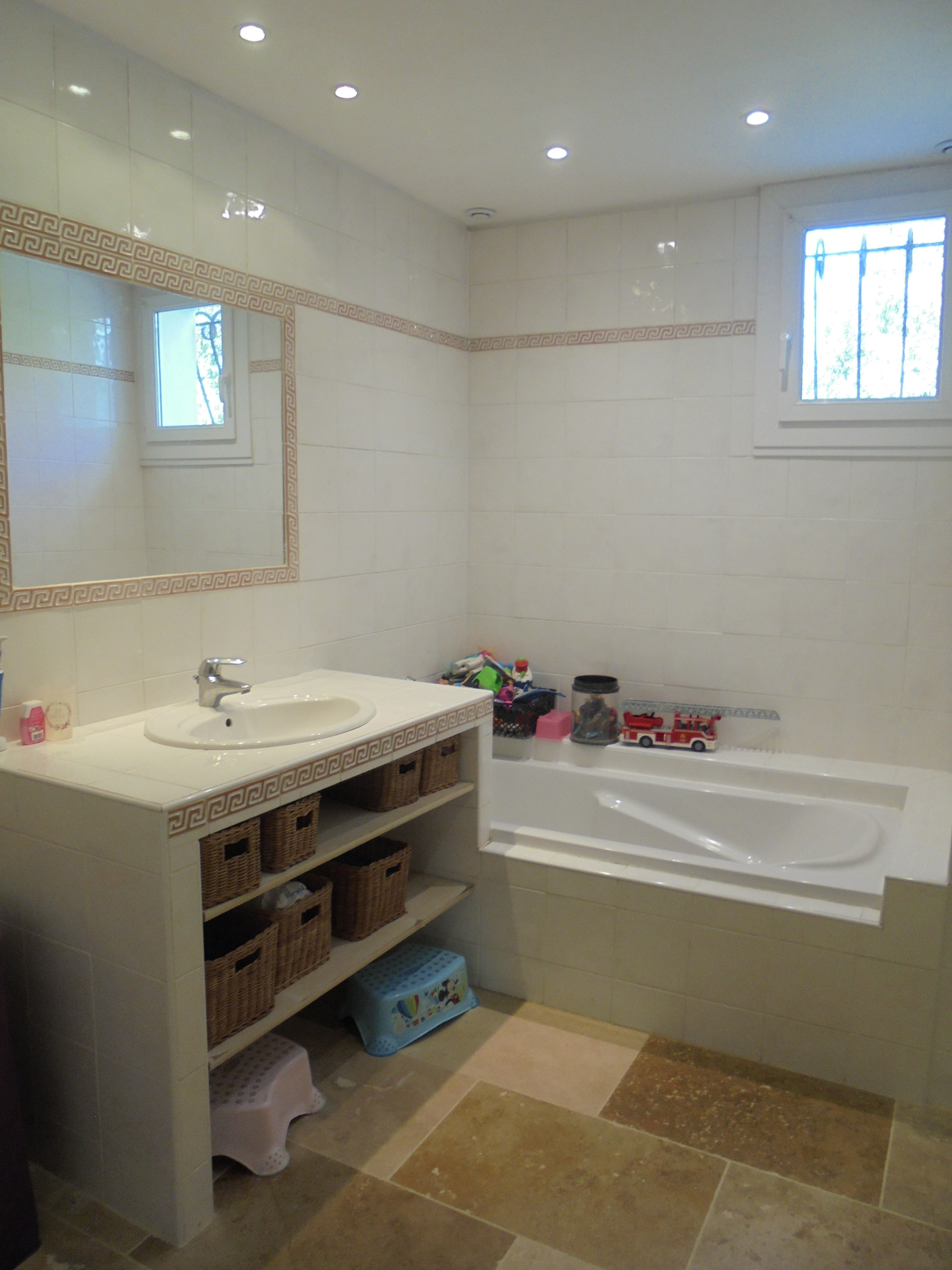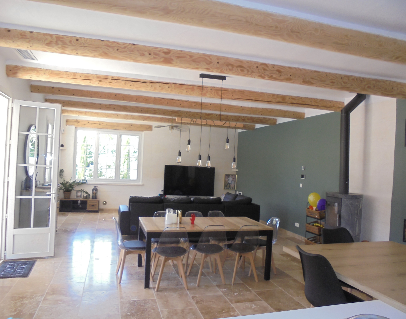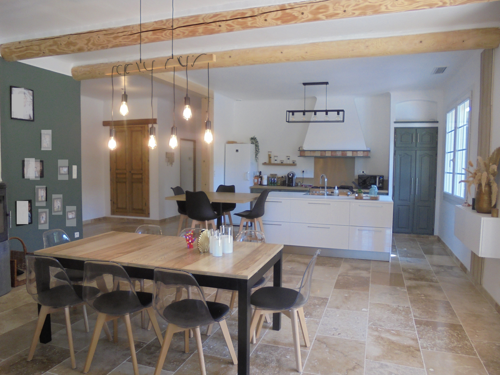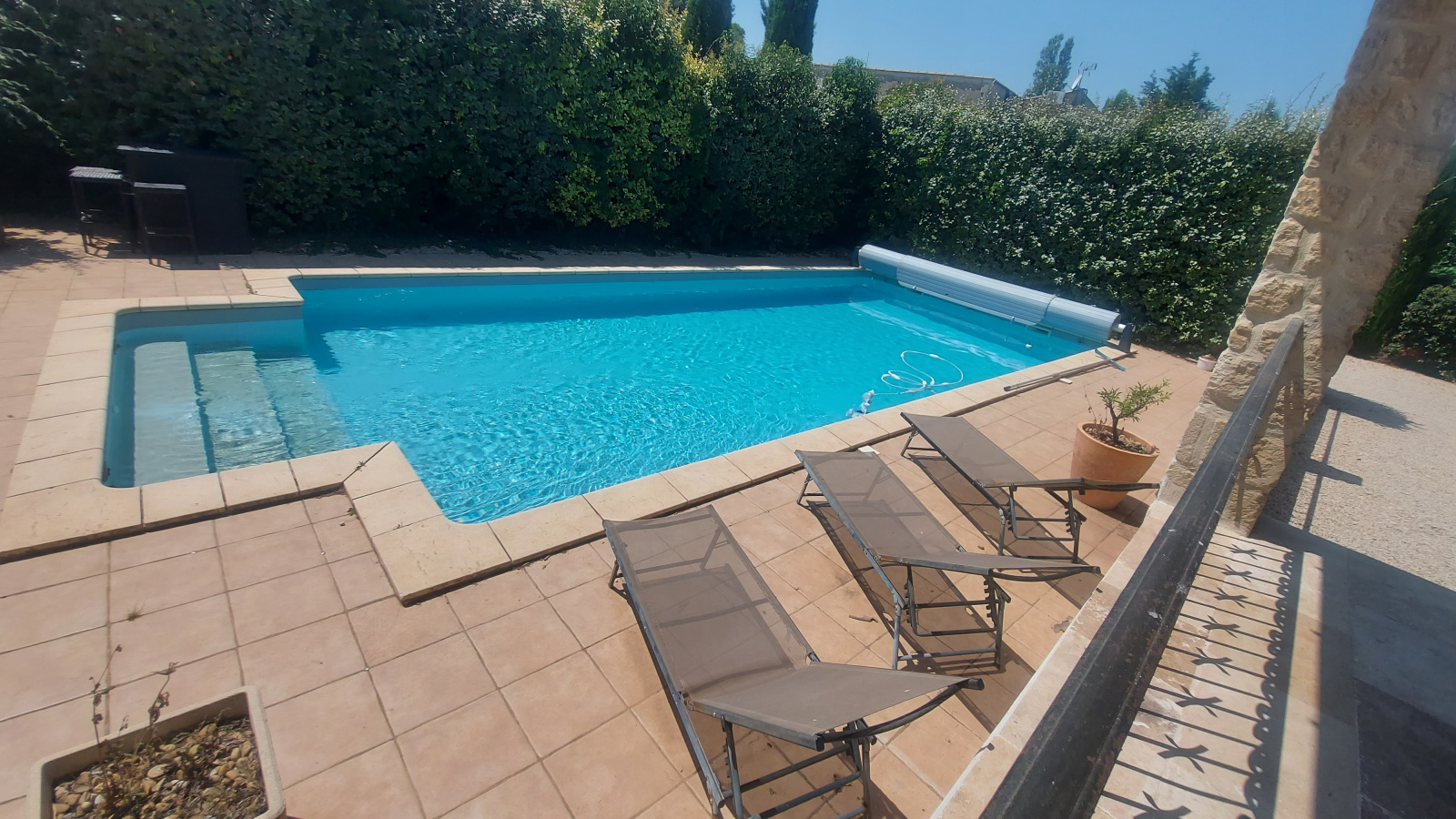 Prestations : menuiseries PVC double vitrage avec volets alu, sols en travertin, poële à bois récent et chauffage par gainable (neuf), alarme, portail électrique, forage + eau de ville, tout à l'égout et eau du canal des Alpines - piscine avec filtration au sel et volet roulant.