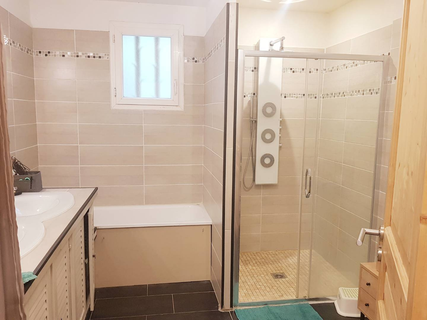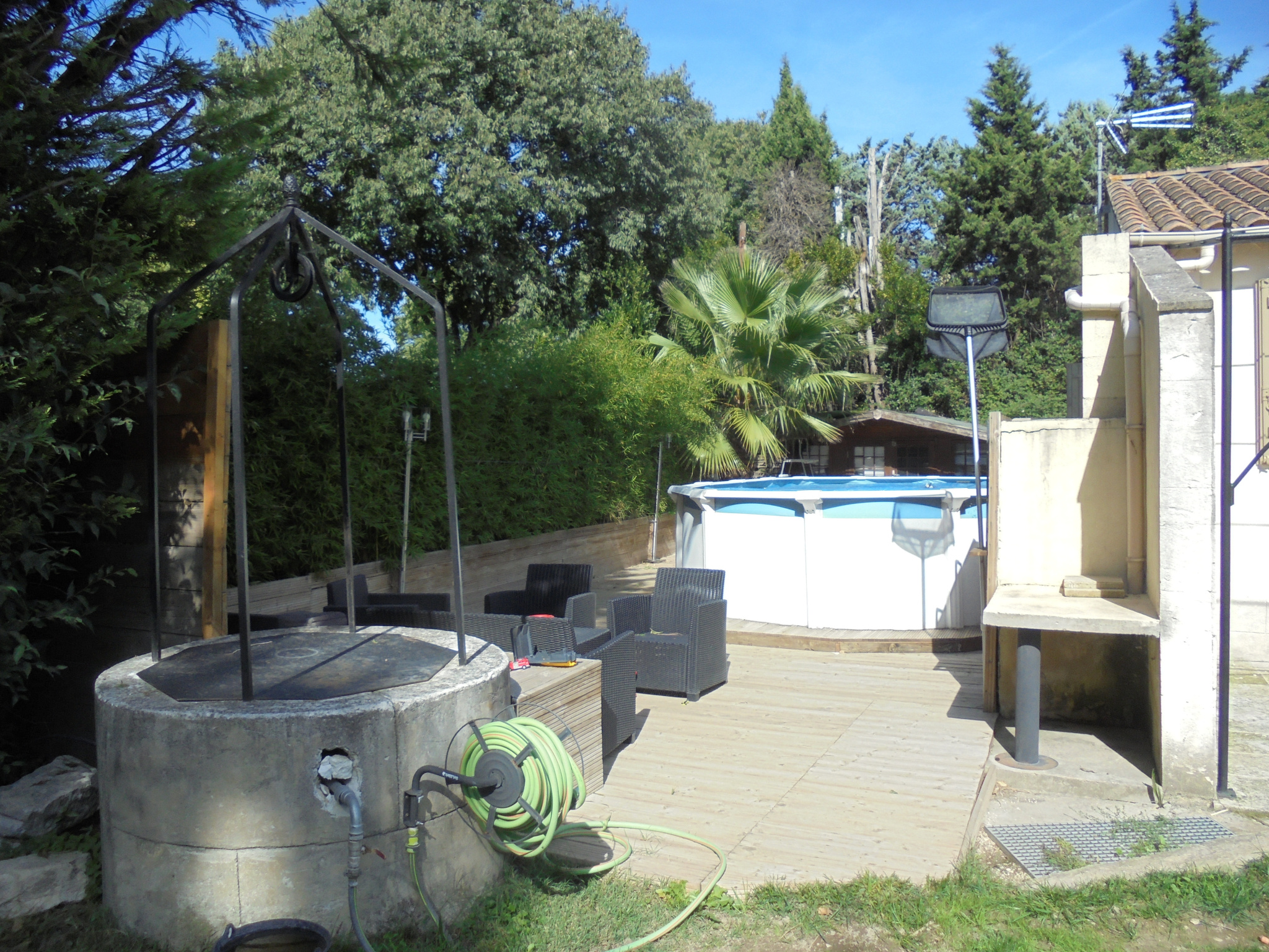 Prestations : cuisine équipée, menuiseries PVC double vitrage, volets bois, gouttières zinc, terrasse en travertin, barbecue en dur, piscine hors sol, climatisation réversible, alarme, forage.
