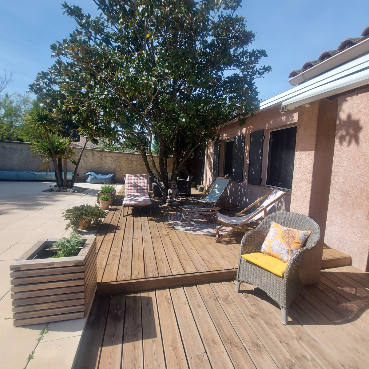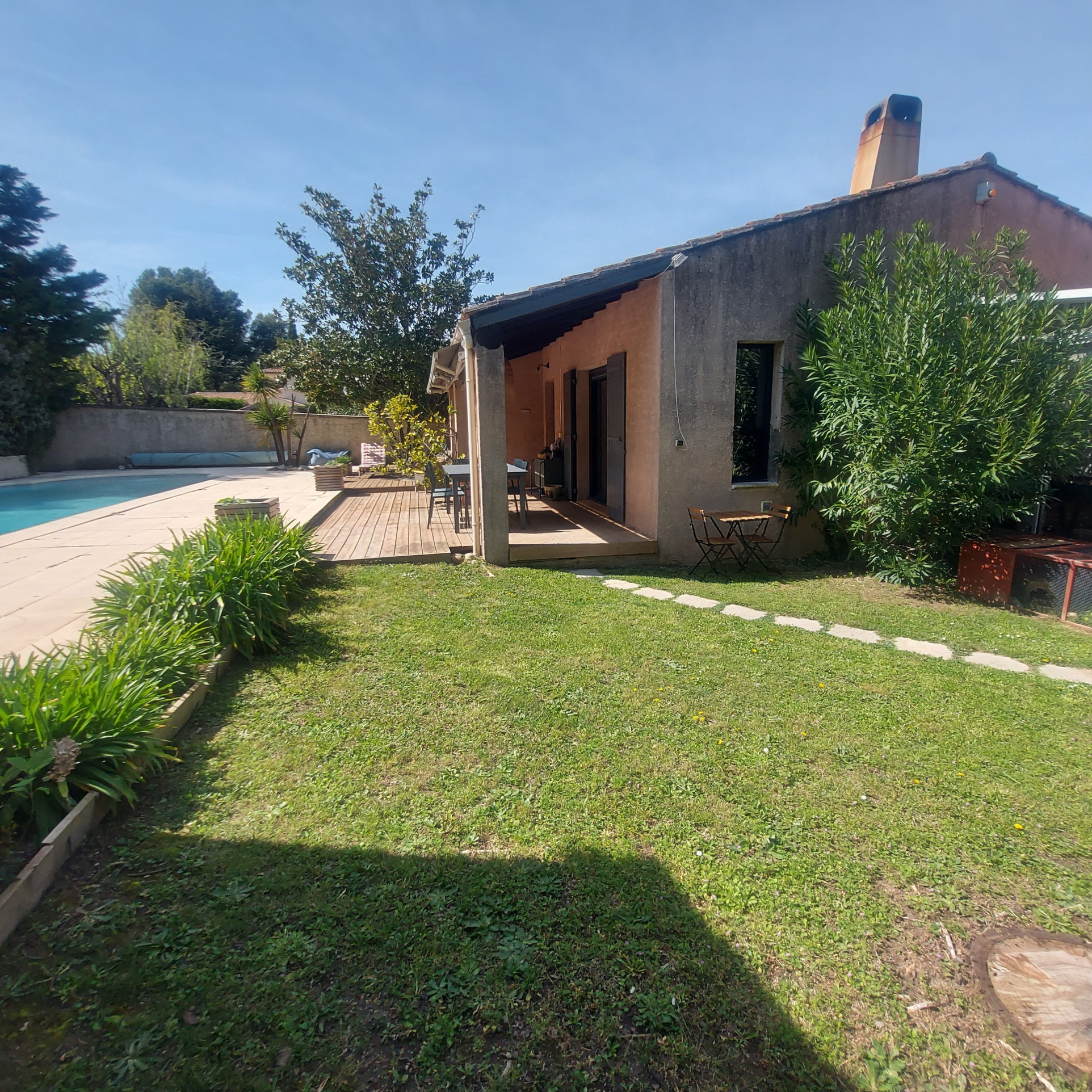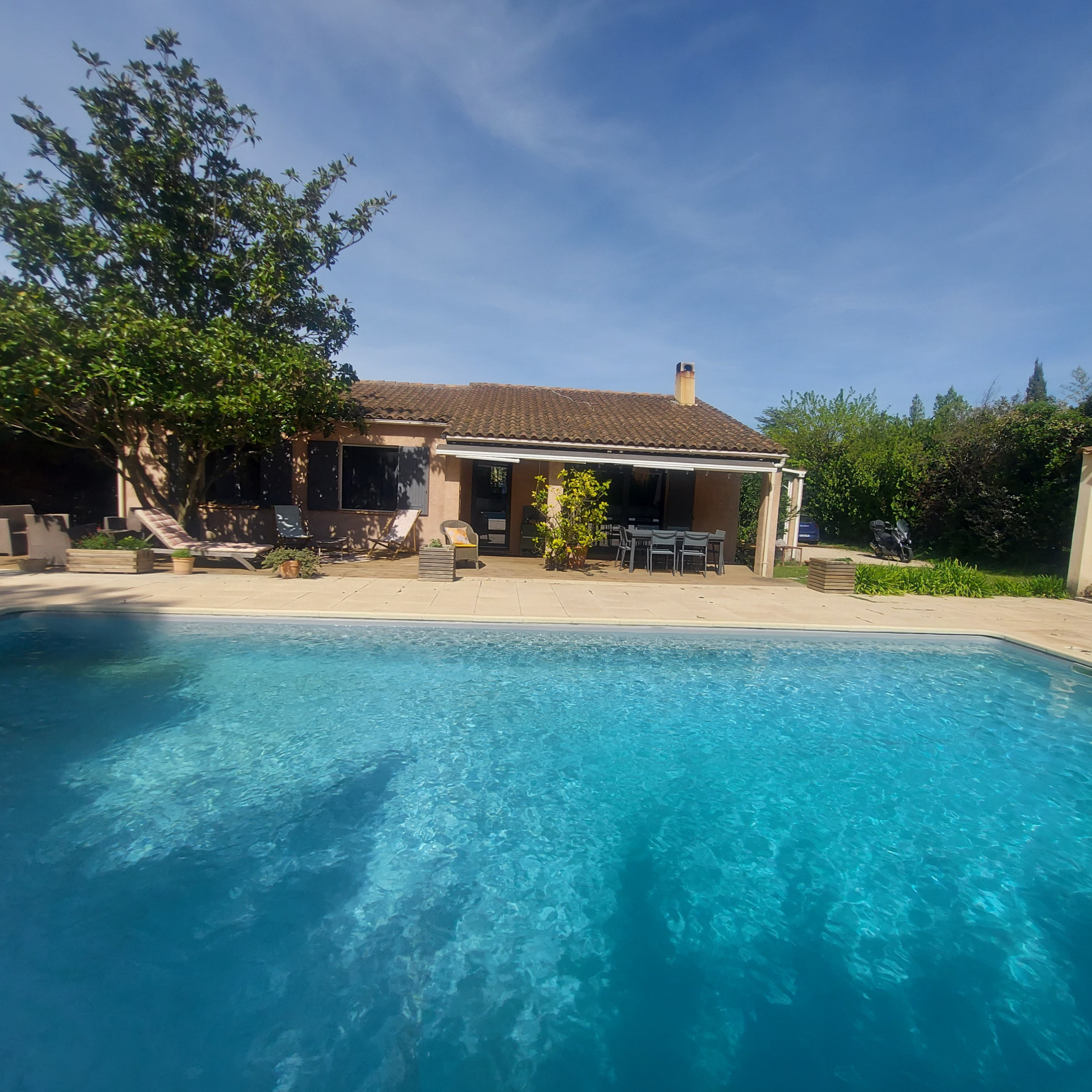 *** VENDU *** Exclusivité à Eyragues, maison de plain-pied année 1990, à venir découvrir absolument ! Plusieurs points forts : à pied du centre du village dans quartier calme, sans vis-à -vis ! orientation plein Sud, d'une superficie habitable de 120 m2, édifiée sur un beau terrain paysagé de 1100 m2. Elle comprend une vaste pièce de vie avec cuisine équipée ouverte de 46 m2, une pièce bureau de 13 m2 (pouvant permettre d'agrandir le salon), une buanderie, trois chambres, une salle d'eau, un w.c. indépendant et une pièce annexe attenante pouvant faire office de dépendance ou 4ème chambre avec point d'eau et toilettes. Le jardin est paysagé avec une belle piscine de 10x5 et grande terrasse en bois. Un pool-house aménagé en cuisine d'été vient compléter ce bel ensemble très cocooning.