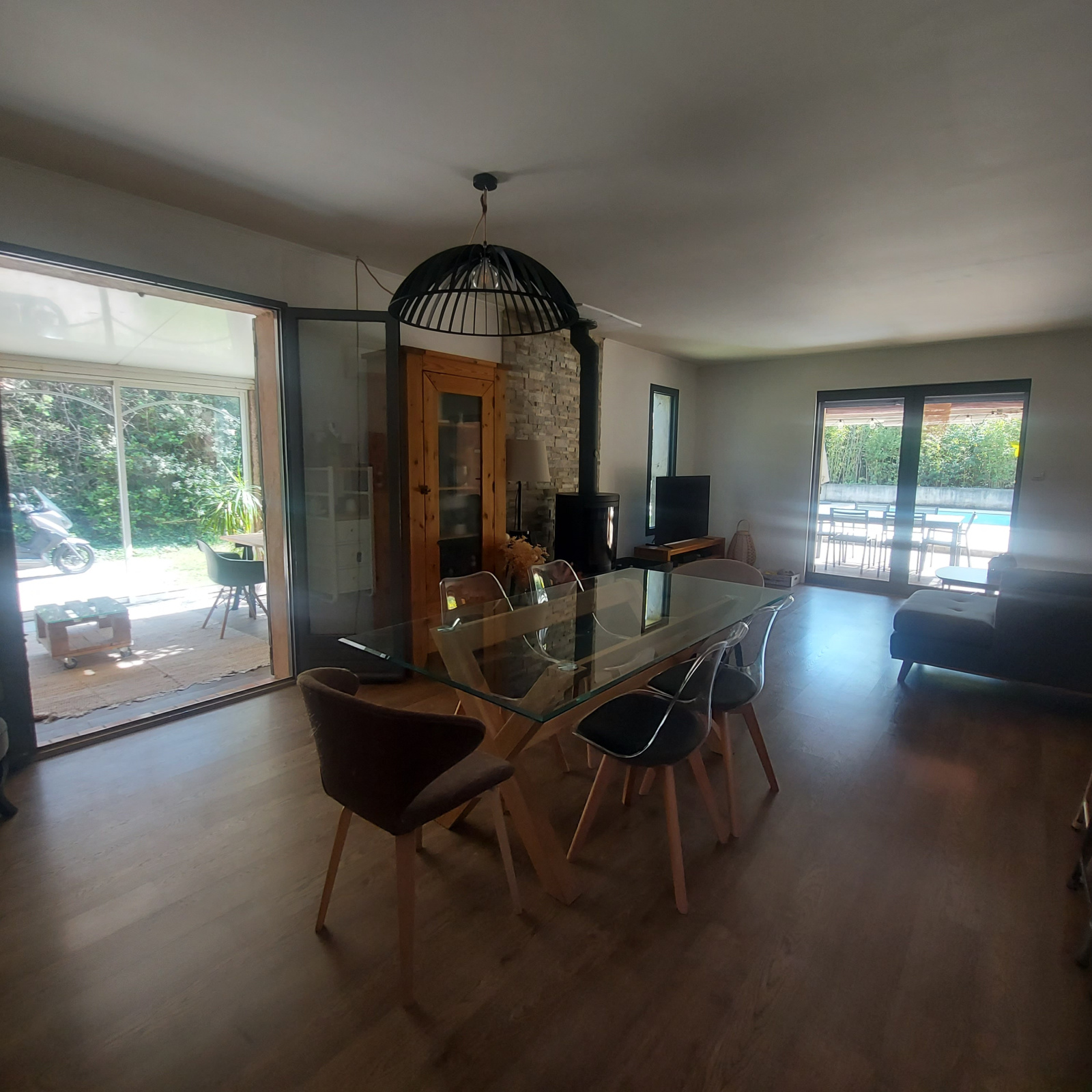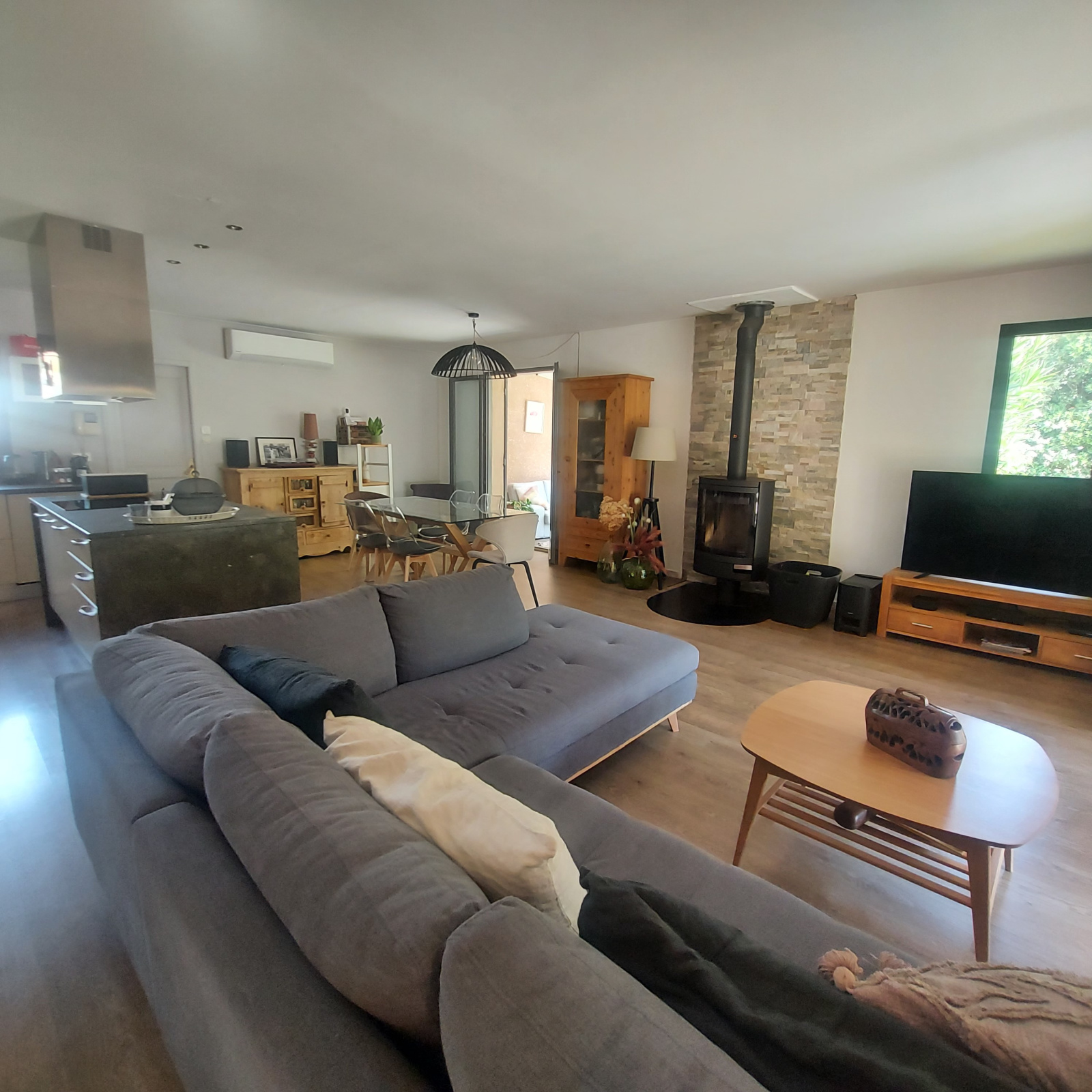 Prestations : menuiseries alu double vitrage, portail d'entrée automatique, poêle à bois, climatisation réversible, radiateurs à inertie sèche, eau de ville + puits, tout à l'égout, volets bois.