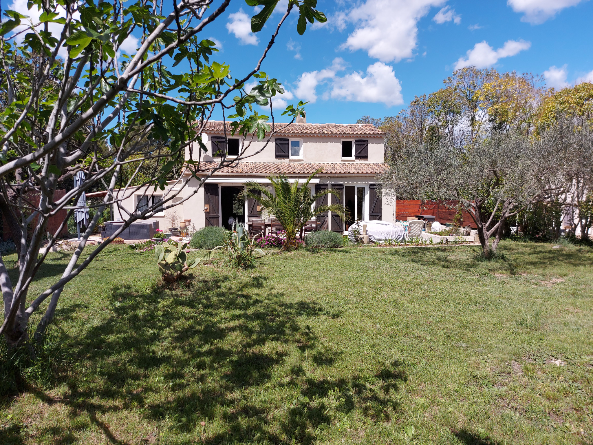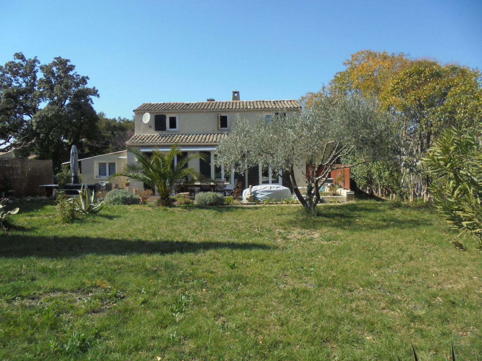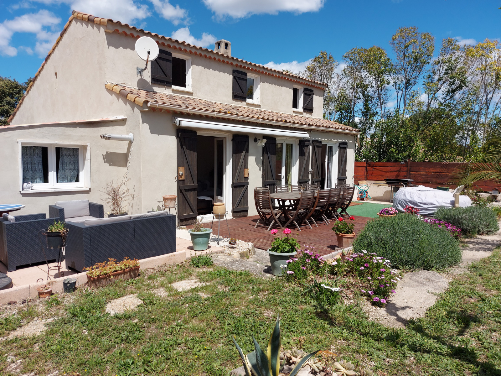 *** VENDU *** Exclusivité à Eyragues, en position dominante et au calme, jolie maison exposition plein Sud de 130 m2 sur beau terrain paysagé de 890 m2 comprenant trois chambres (possibilité 4), salle de séjour, salon, cuisine séparée, buanderie, salle d'eaau, w.c. et un garage attenant de 14 m2, terrain pisicinable.
