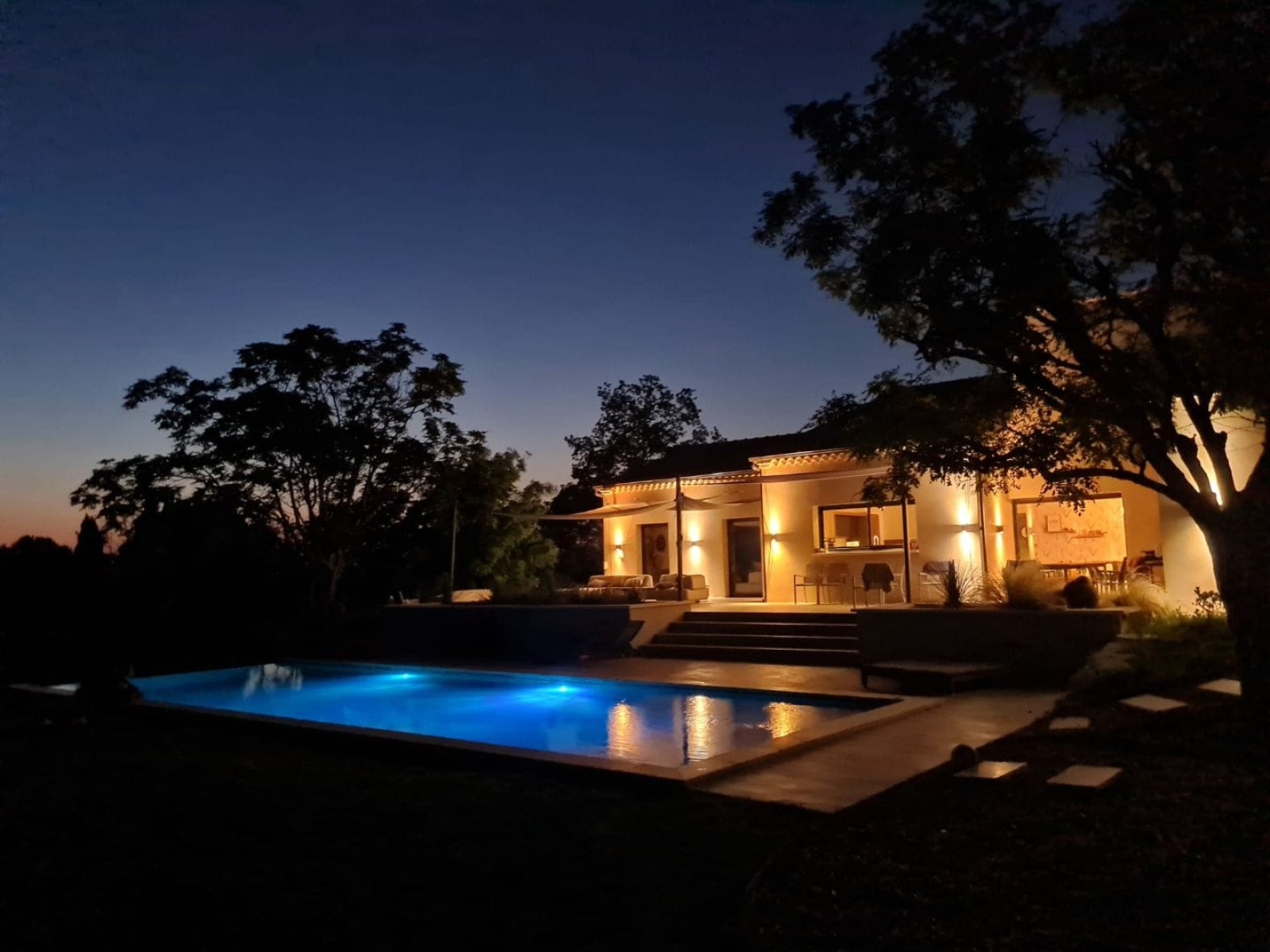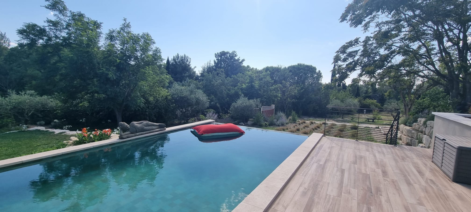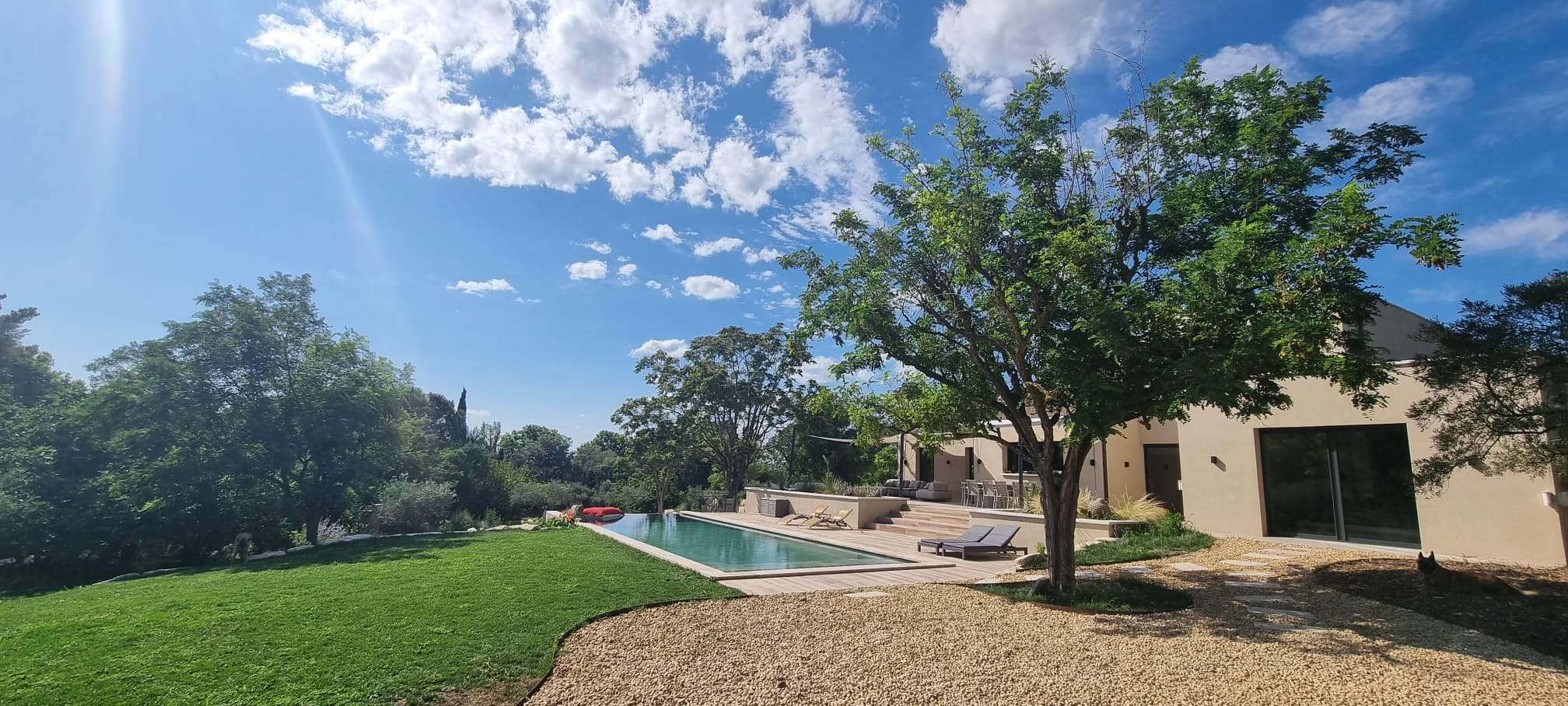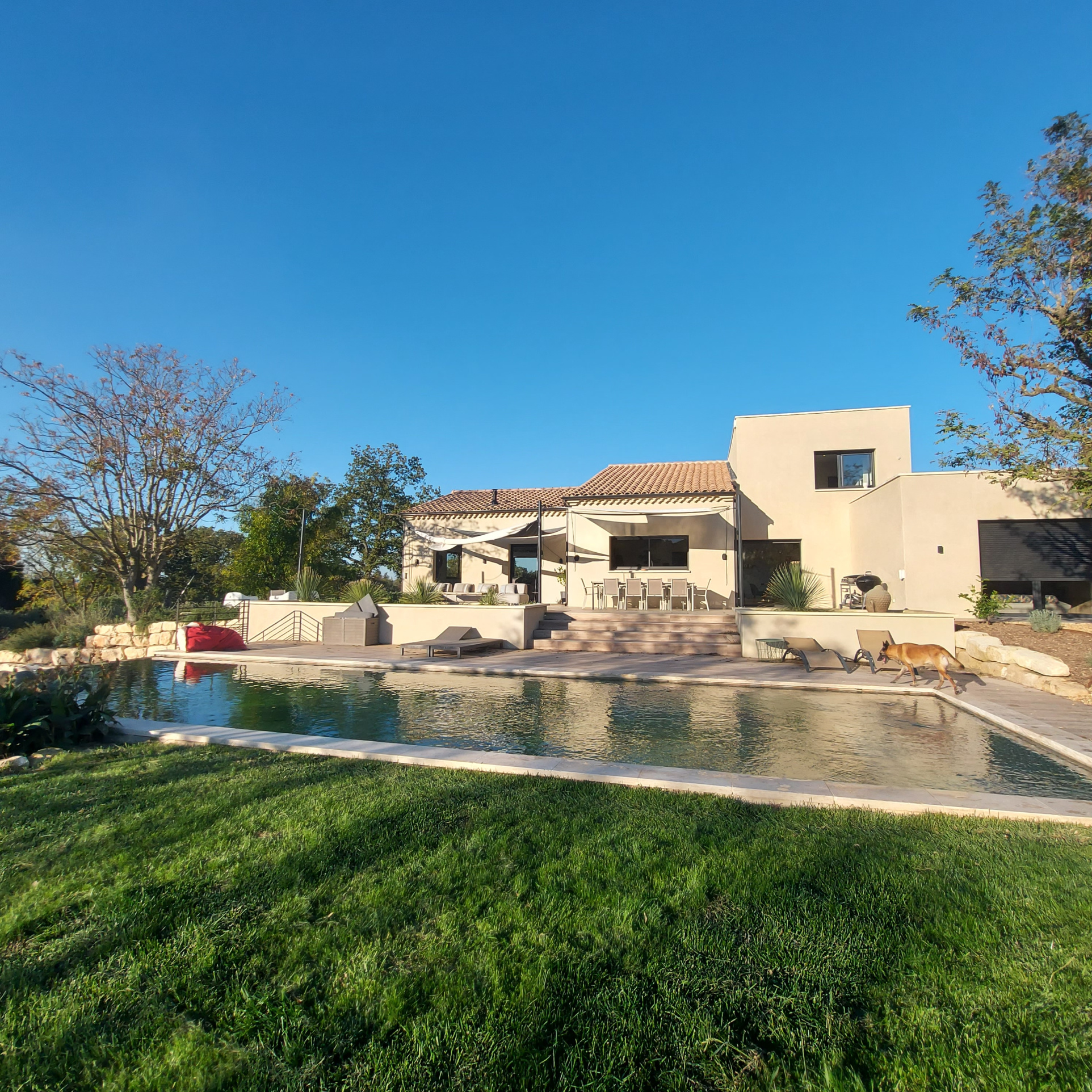Prestations : Grandes baies à galandage et menuiseries aluminium avec volets roulants domotique, panneaux solaires thermiques, pompe à chaleur (plancher chauffant et raffraîchissant), climatisation, ballon d'eau chaude solaire, poêle à gaz, eau de ville et forage, puits canadien par géothermie, fosse septique neuve (micro-station), piscine à débordement au sel de 4 x13 avec régulateur de sel, volet roulant immergé, arrosage automatique, tondeuse automatique, porrtail auto, visiophone, interphone, alarme intérieure et extérieure, répartiteur de wi-fi, garage de rangement.