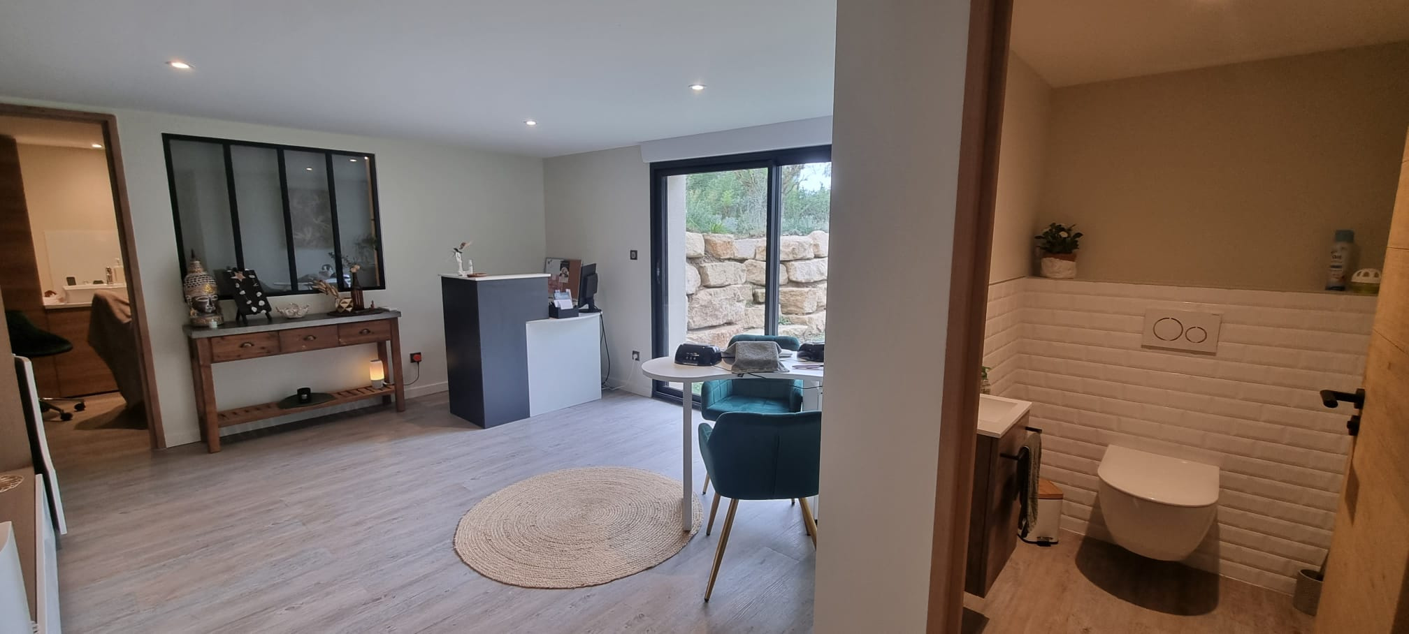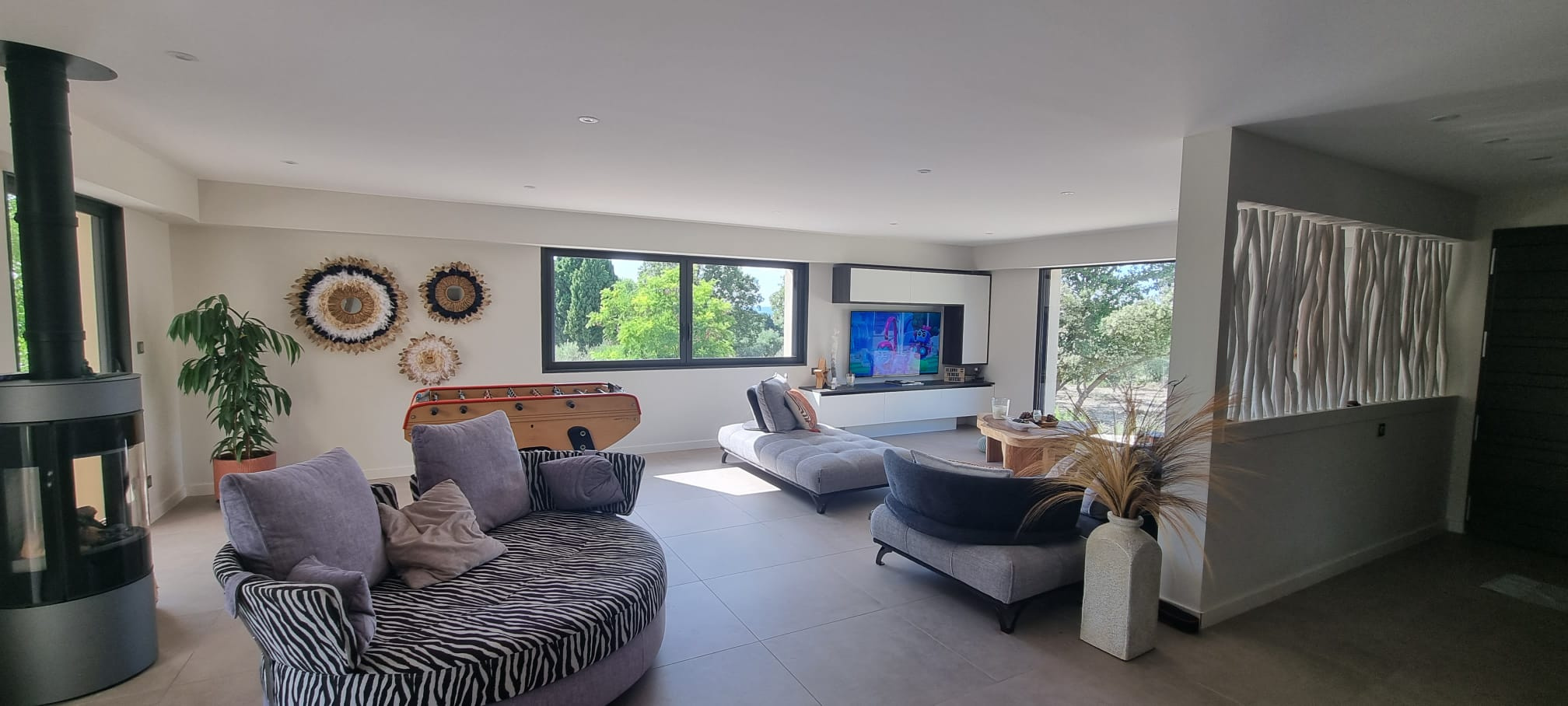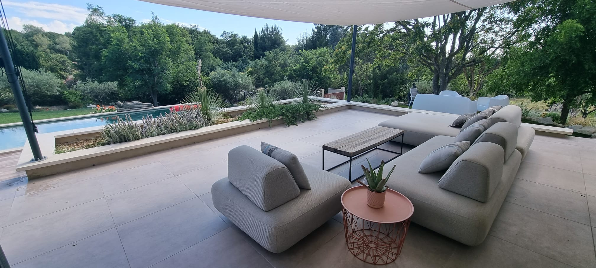 Prestations : Grandes baies à galandage et menuiseries aluminium avec volets roulants domotique, panneaux solaires thermiques, pompe à chaleur (plancher chauffant et raffraîchissant), climatisation, ballon d'eau chaude solaire, poêle à gaz, eau de ville et forage, puits canadien par géothermie, fosse septique neuve (micro-station), piscine à débordement au sel de 4 x13 avec régulateur de sel, volet roulant immergé, arrosage automatique, tondeuse automatique, porrtail auto, visiophone, interphone, alarme intérieure et extérieure, répartiteur de wi-fi, garage de rangement.