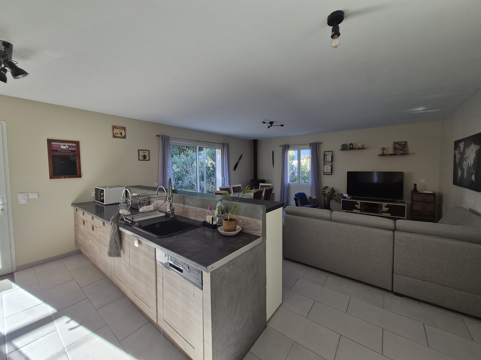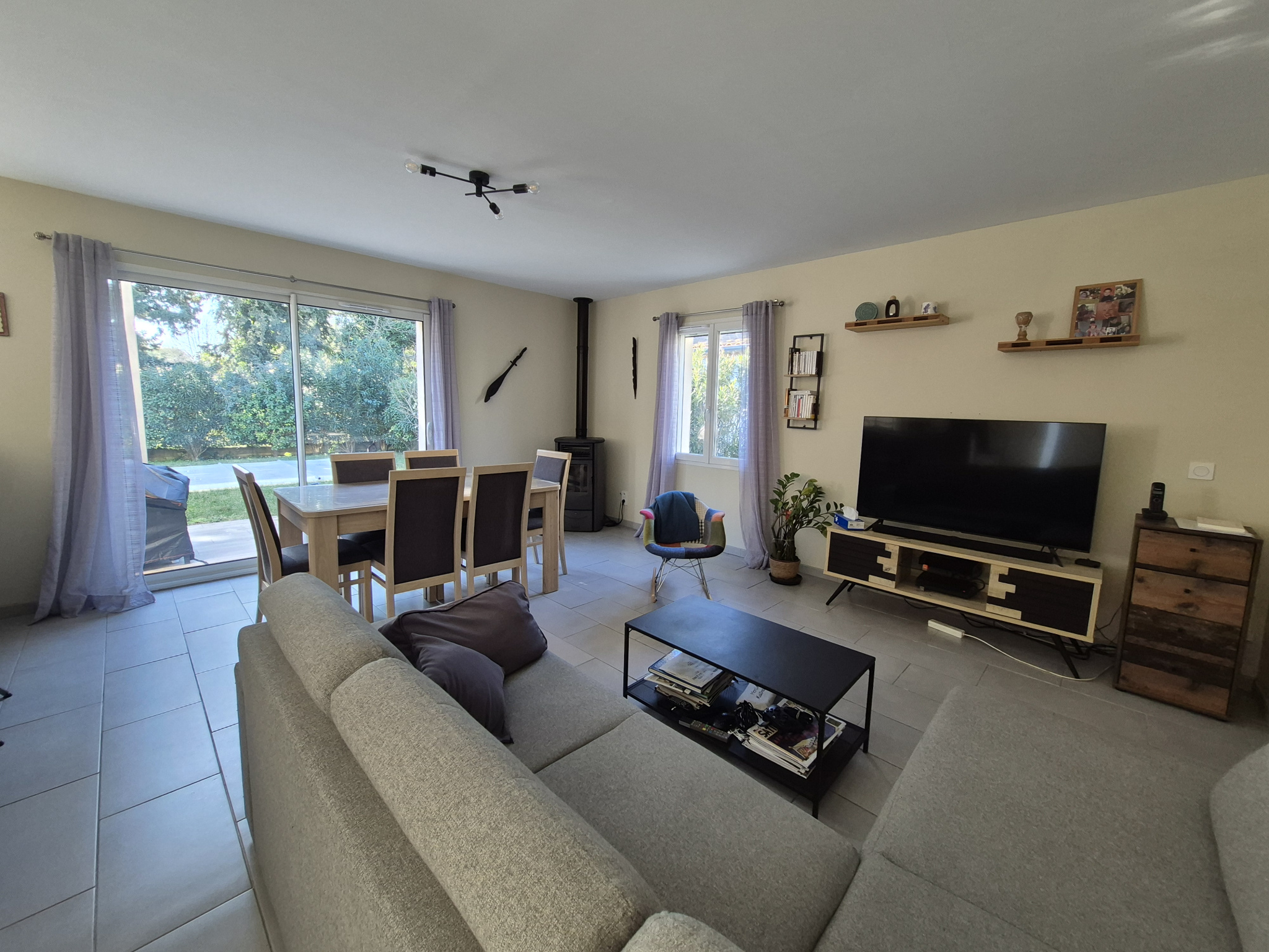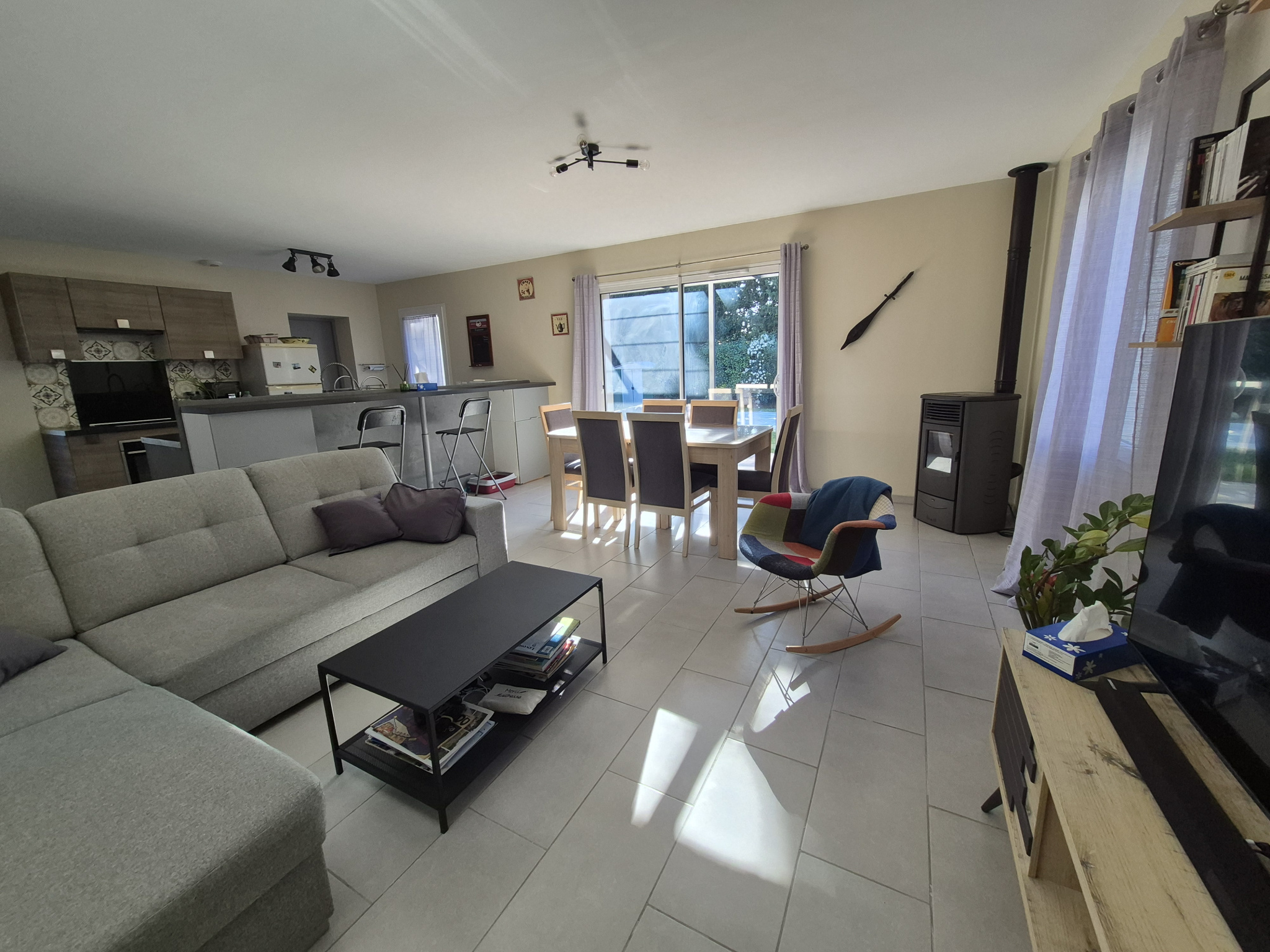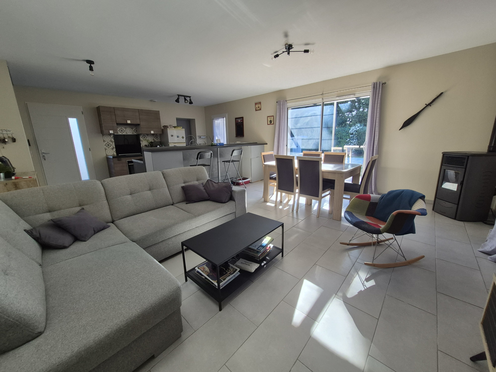 Prestations : menuiseries PVC et alu double vitrage, chauffe-eau thermodynamique, VMC double flux, poêle à granules, forage + eau de ville, gouttières alu, pergola.