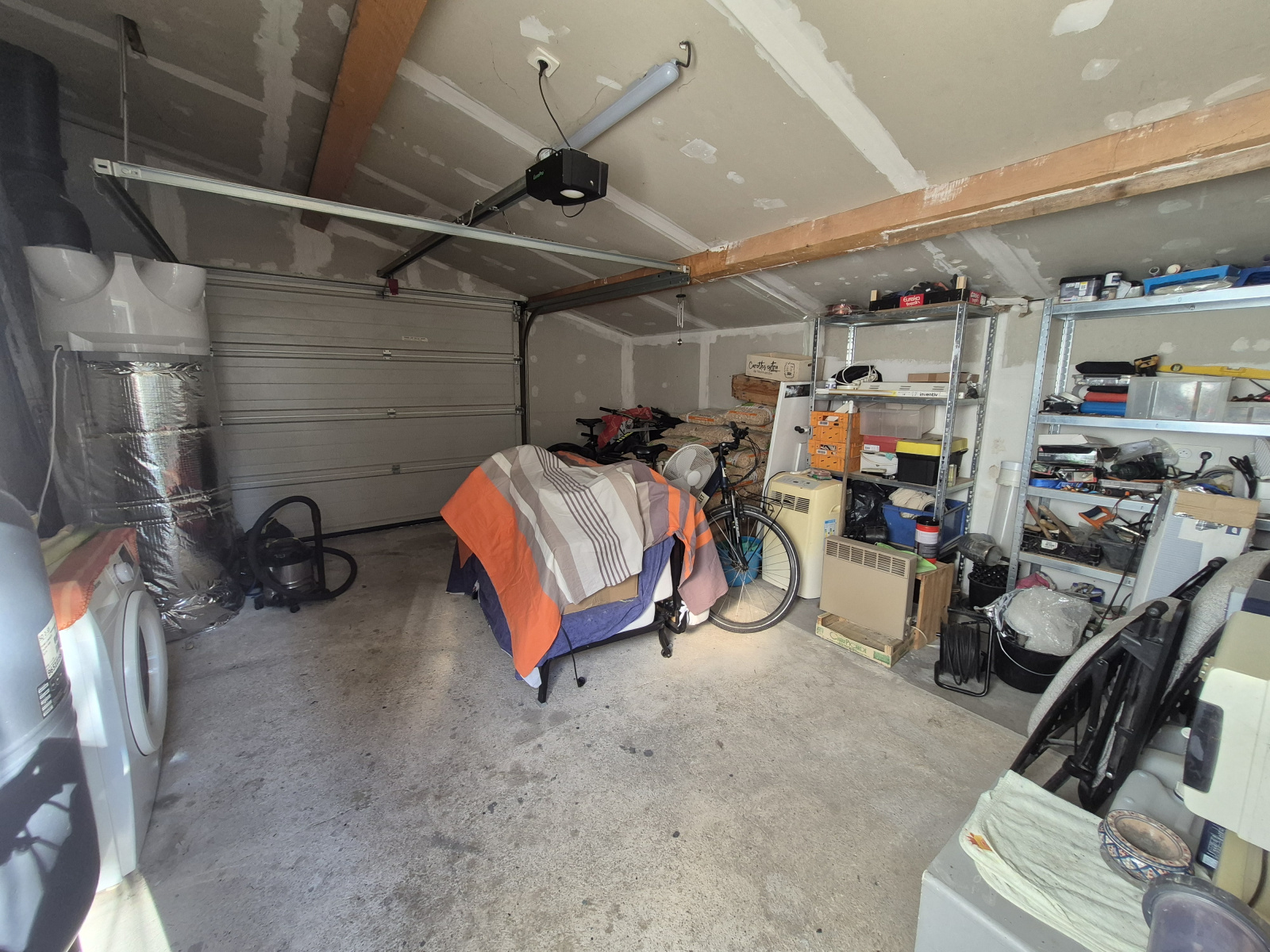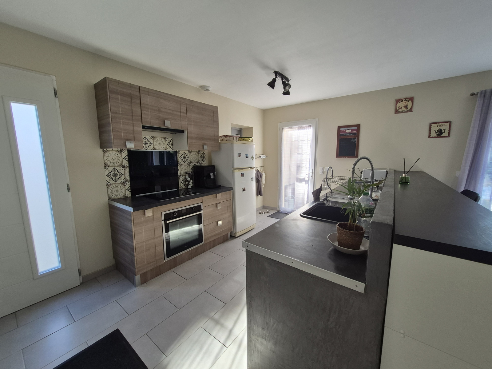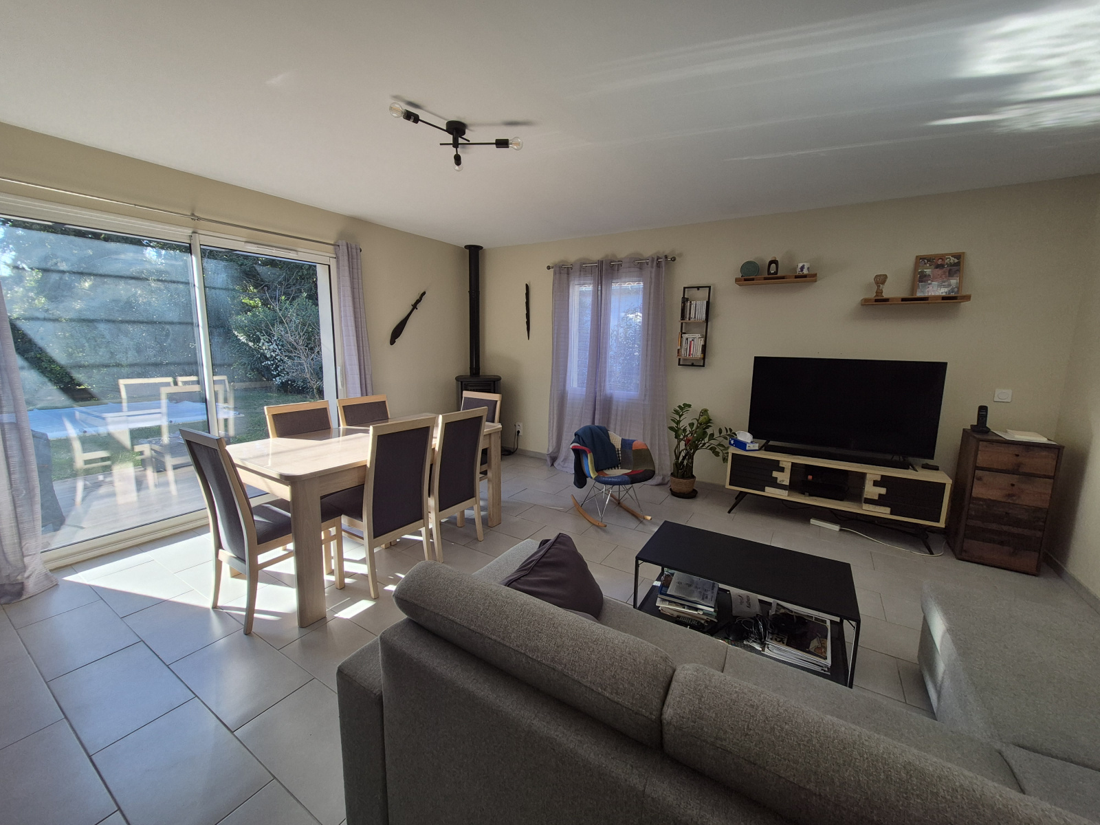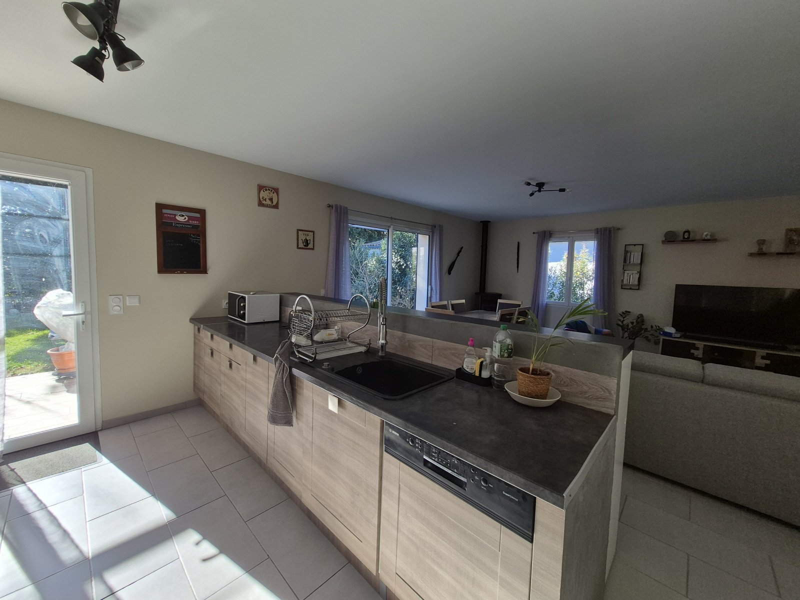 Prestations : menuiseries PVC et alu double vitrage, chauffe-eau thermodynamique, VMC double flux, poêle à granules, forage + eau de ville, gouttières alu, pergola.