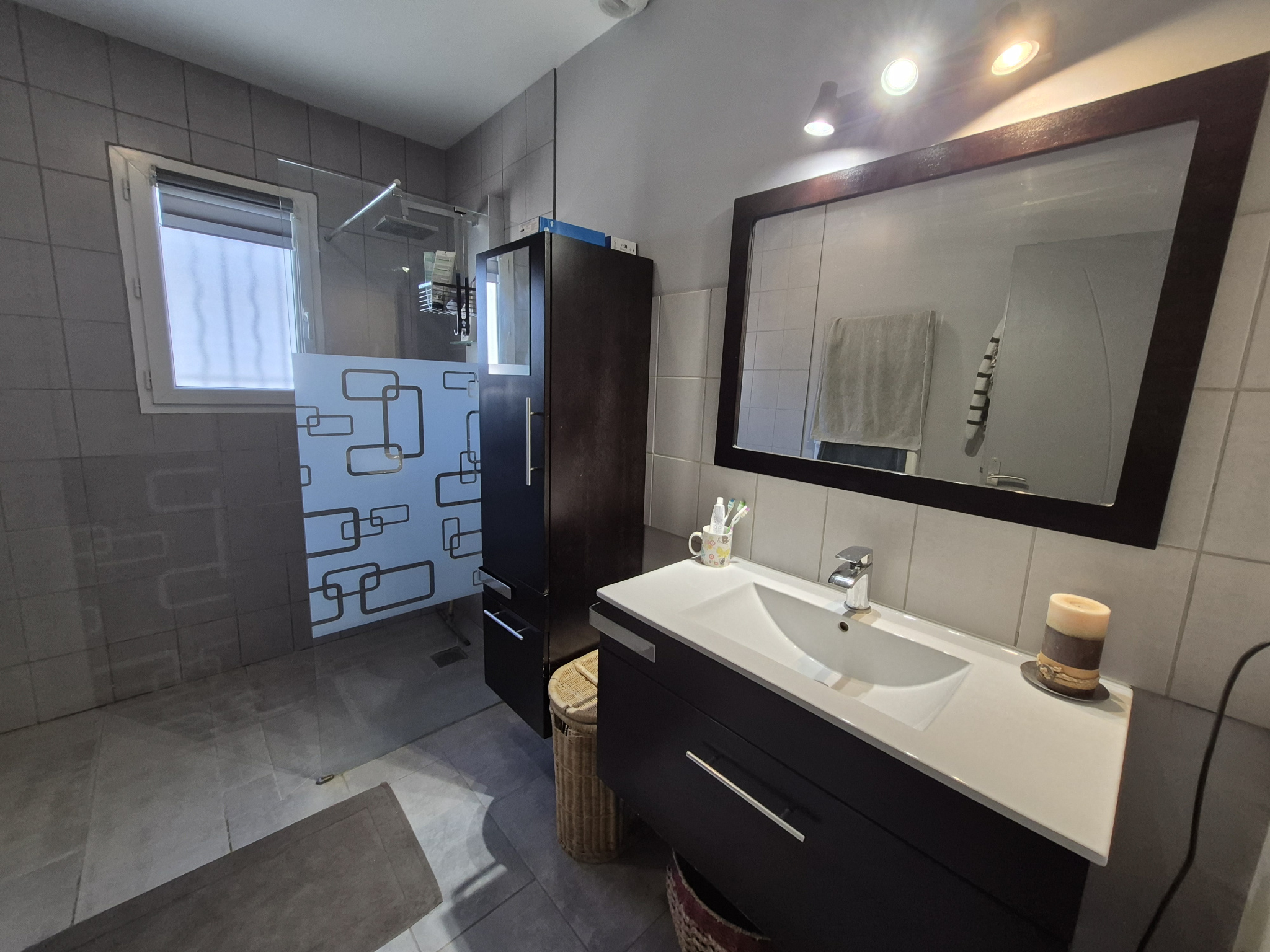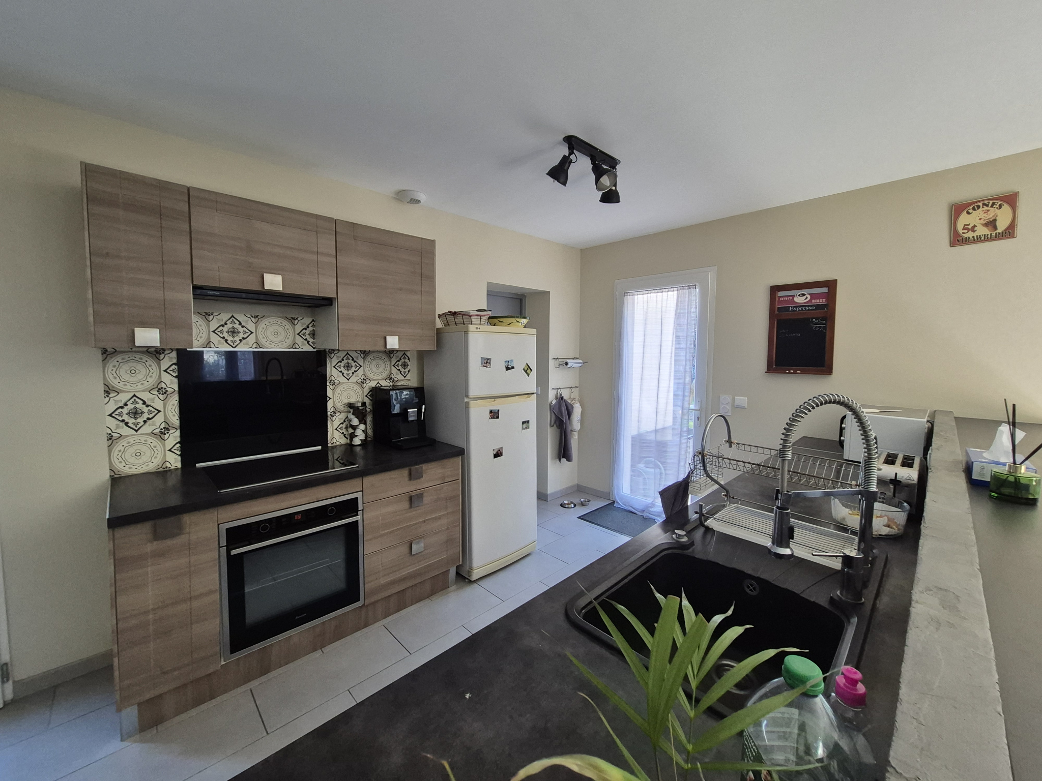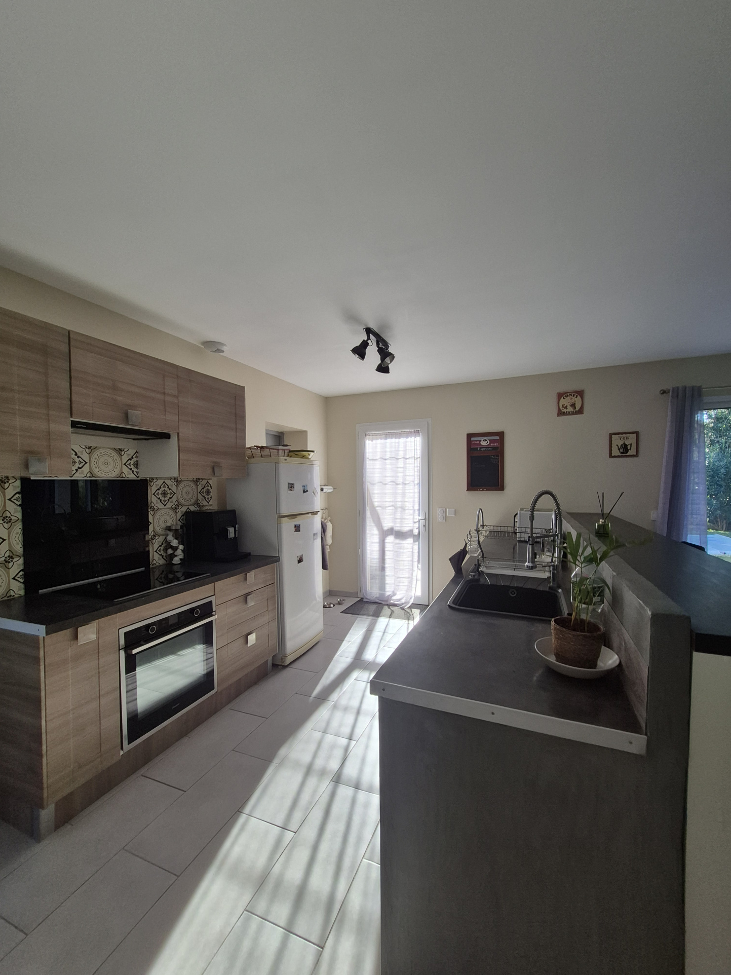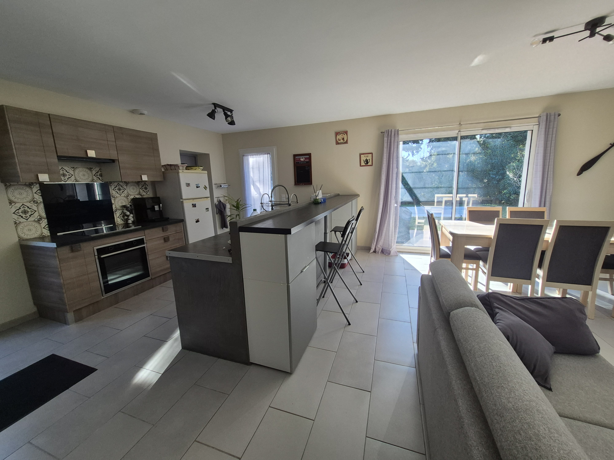 Prestations : menuiseries PVC et alu double vitrage, chauffe-eau thermodynamique, VMC double flux, poêle à granules, forage + eau de ville, gouttières alu, pergola.