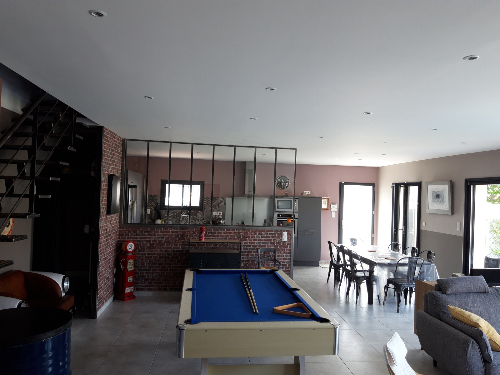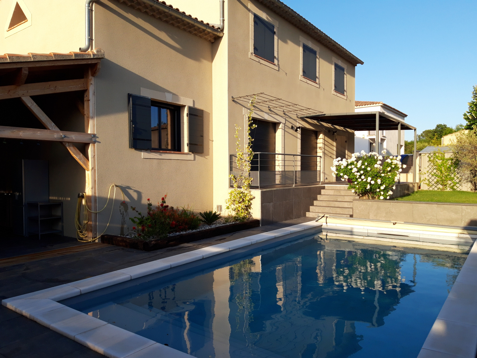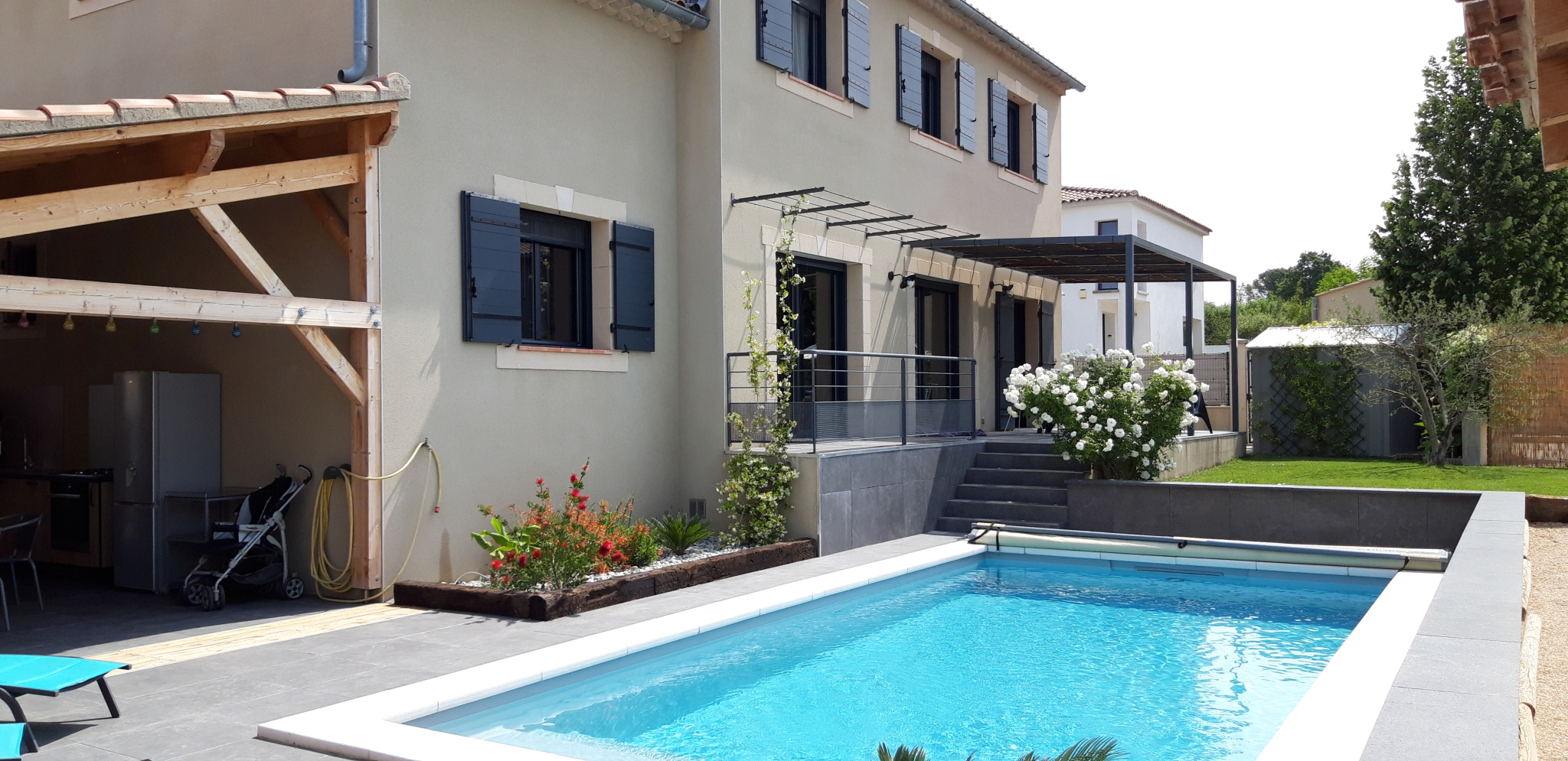 Prestations : pompe à chaleur (plancher chauffant et raffraîchissant), climatisation réversible à l'étage, poêle scandinave à bois, adoucisseur, menuiseries alu double vitrage, moustiquaires, baies vitrées avec volets roulants électriques + volets bois, alame contact, portail électrique avec interphone, terrasses carrelées, arrosage automatique intégré,