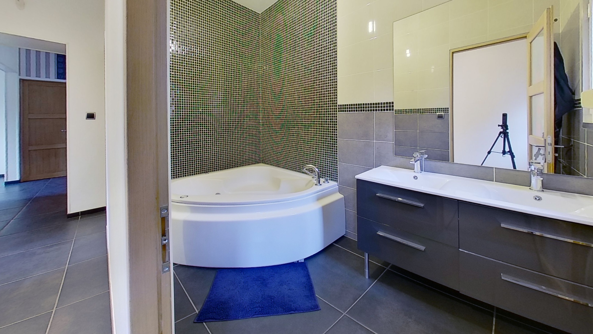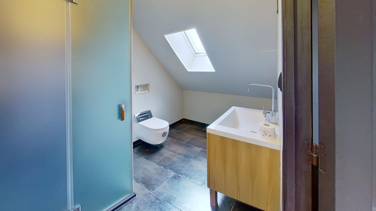 A l' étage vous y trouverez un grand espace idéal pour un bureau, 2 grandes chambres ainsi qu' une deuxième salle de bain avec douche et WC.