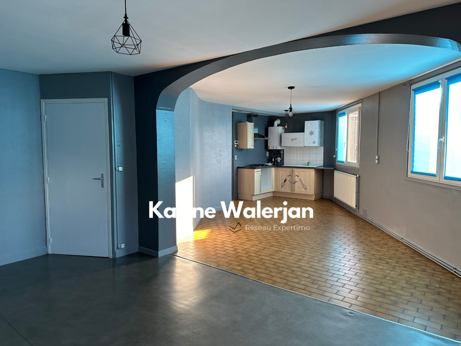 A l'étage, un appartement de 69 m2 avec cuisine ouverte sur un séjour, 2 chambres, une salle de bain avec wc.
