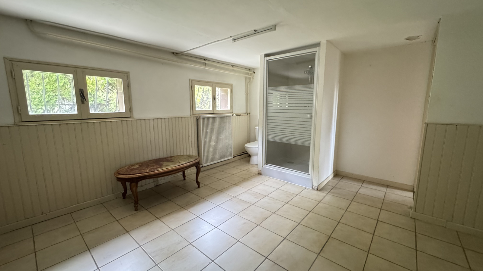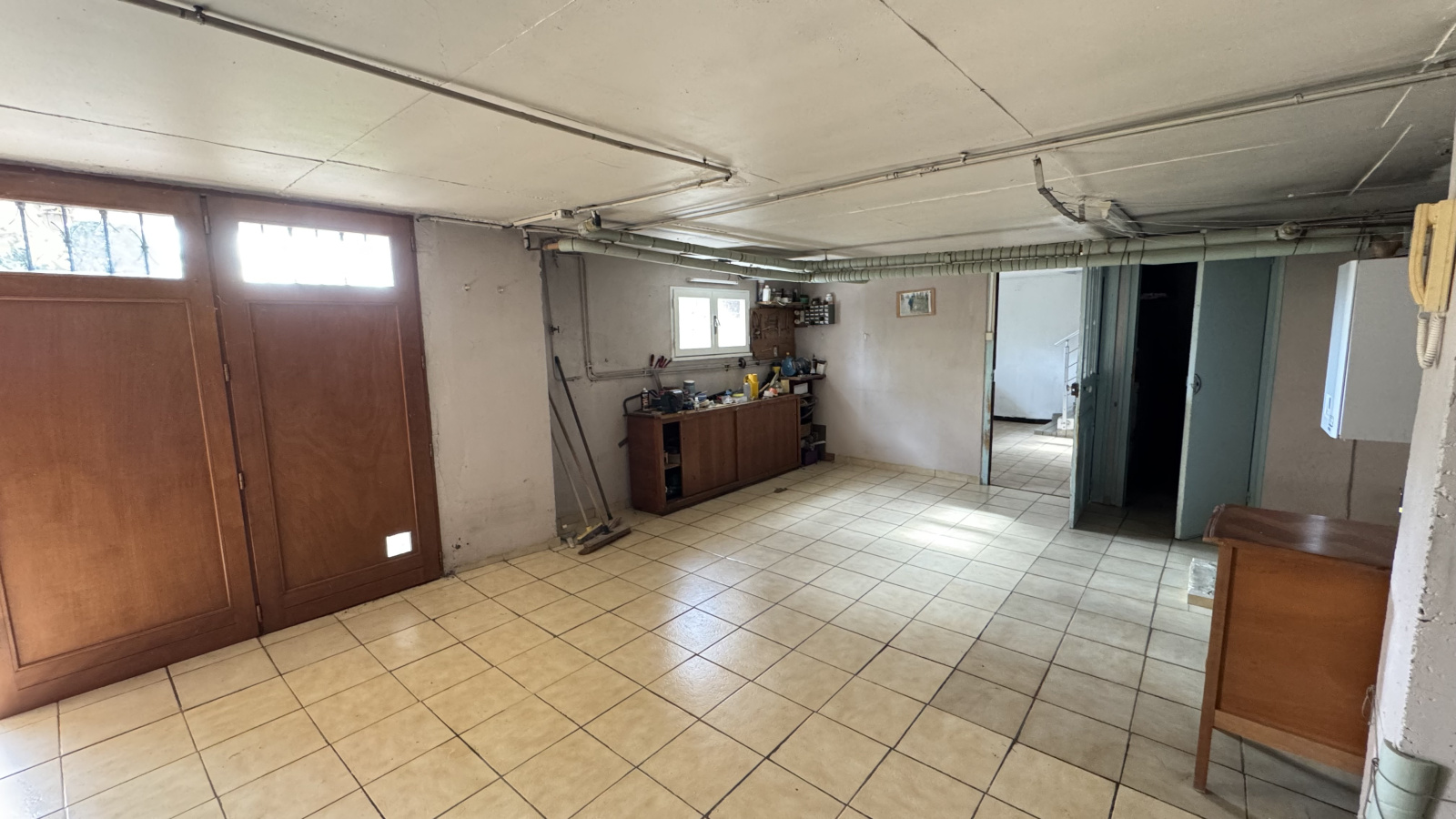 Niveau inférieur : 1 pièces polyvalente (bureau, chambres, espace télétravail…), salle d’eau, Grand garage