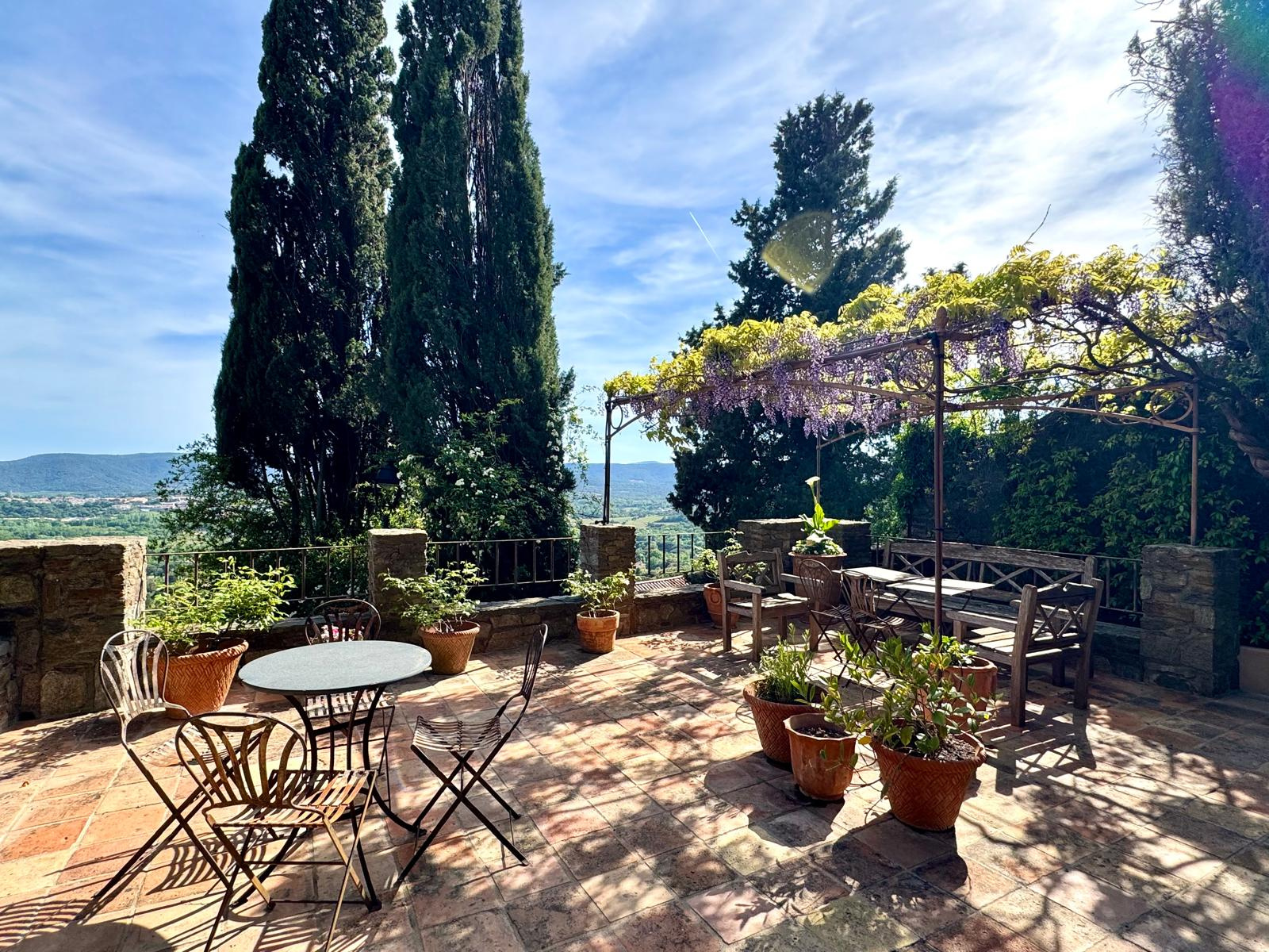 À l’extérieur, la propriété dévoile différents espaces de détente avec terrasses, jardin et piscine chauffée, au sein d’un environnement calme offrant une vue ouverte sur les collines environnantes.