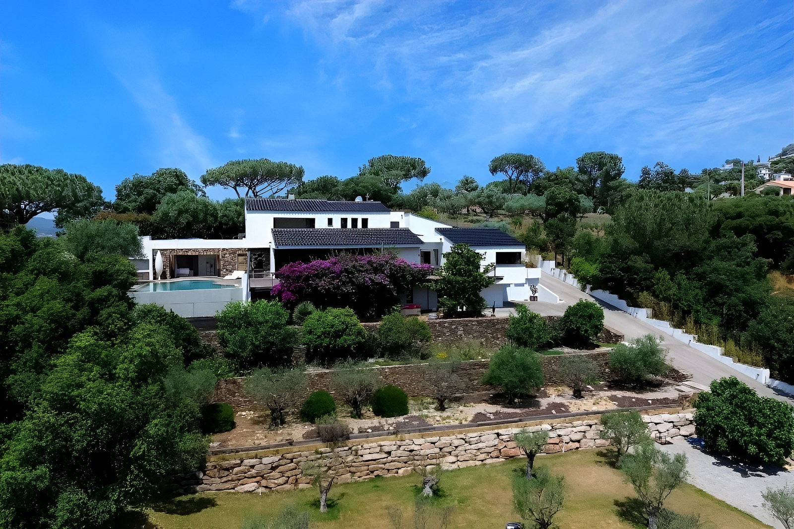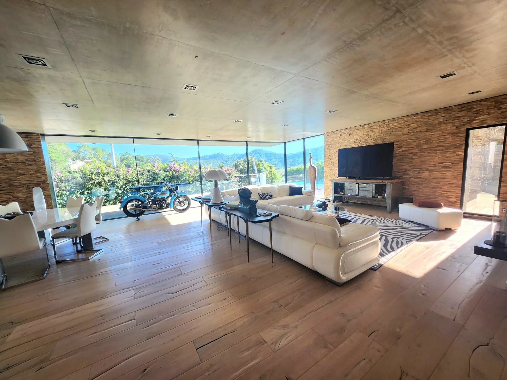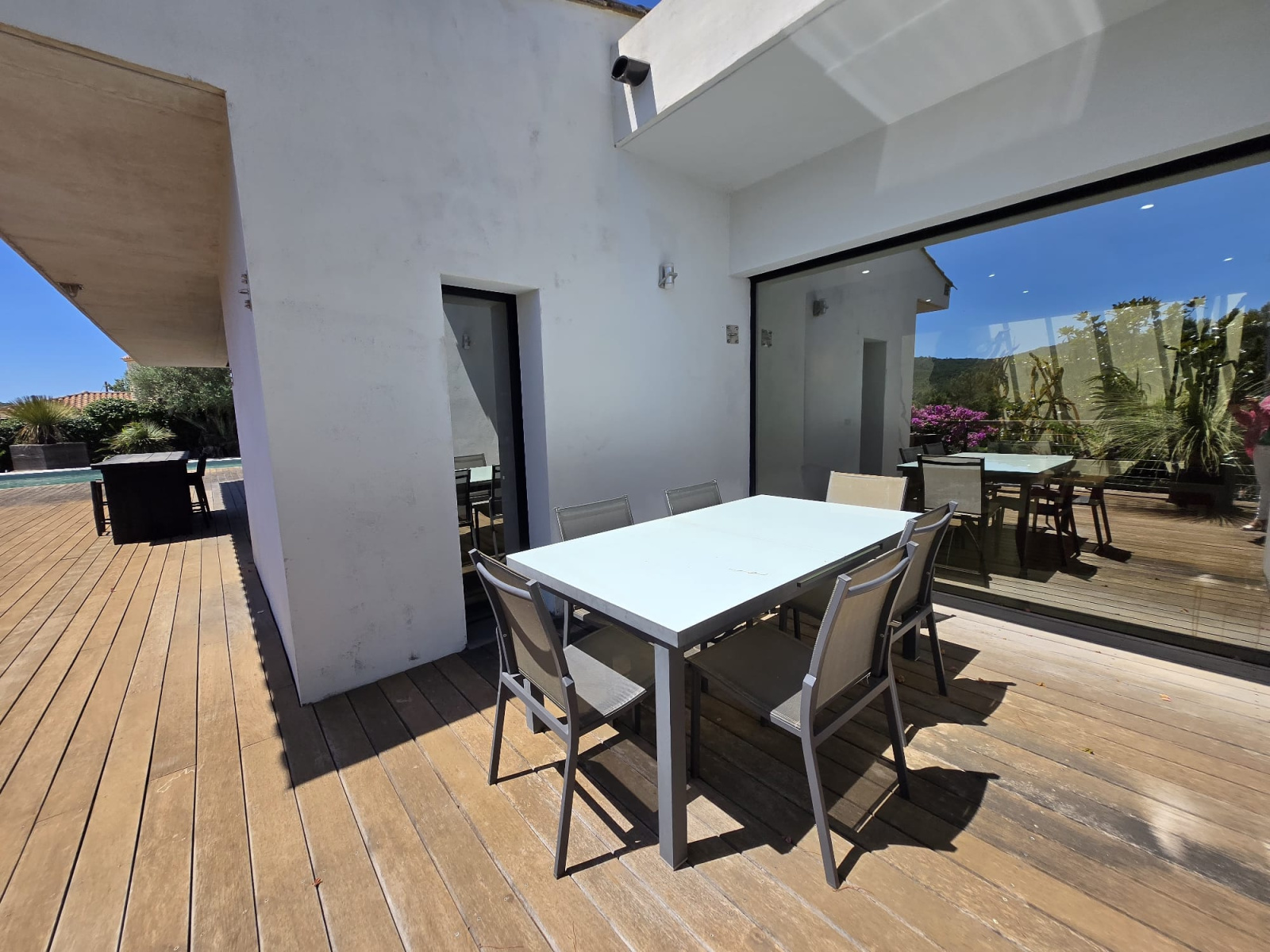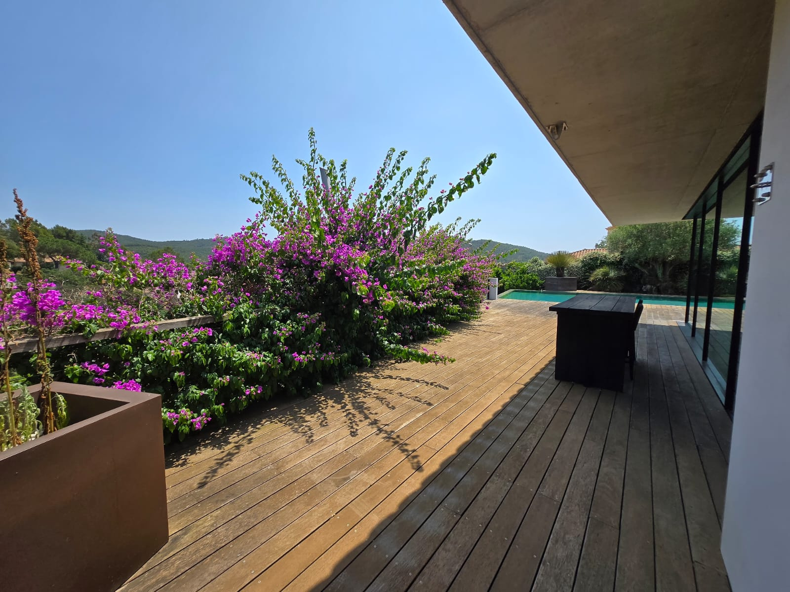 Très rare à la vente, cette propriété unique séduira les amateurs de design, de nature et de confort absolu. Nichée dans un écrin de verdure, entre bougainvilliers, magnolias, oliviers et autres essences méditerranéennes, cette villa contemporaine de 2011 trône en position dominante face à la majestueuse chaîne du Massif des Maures.