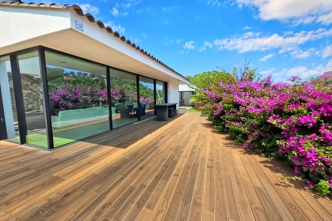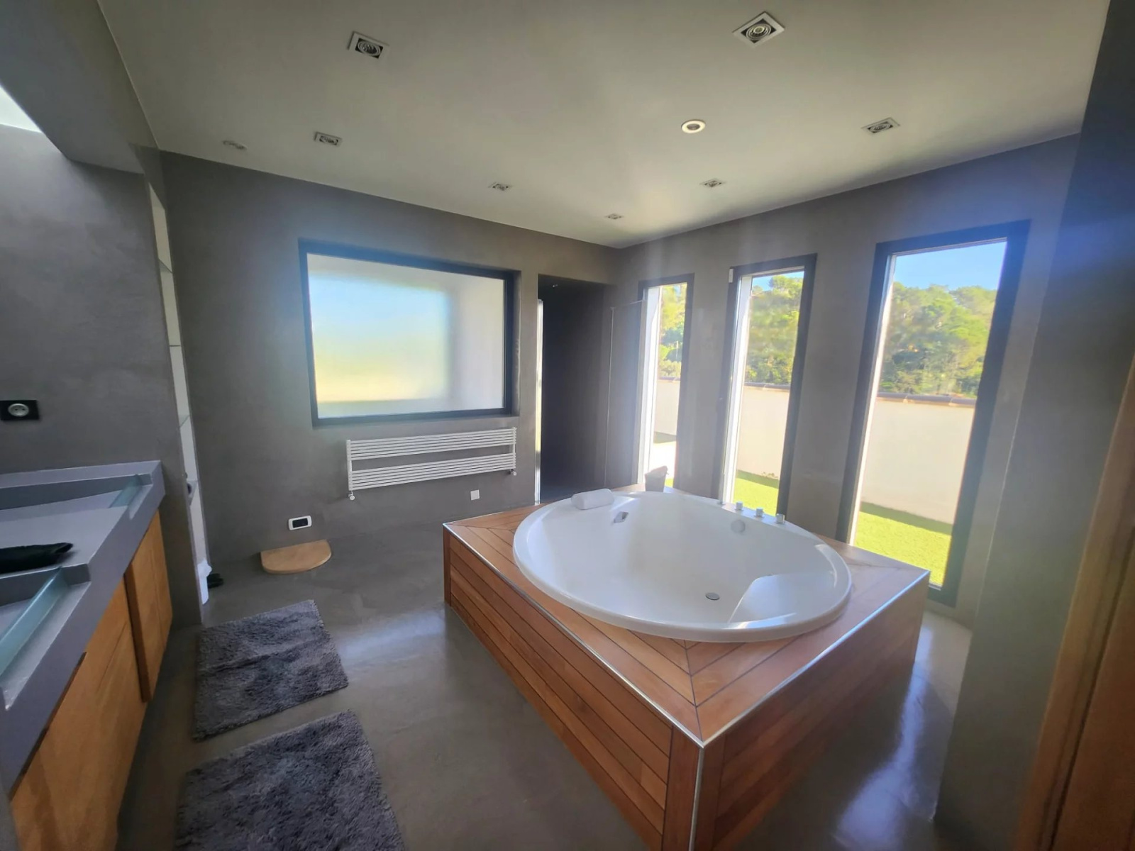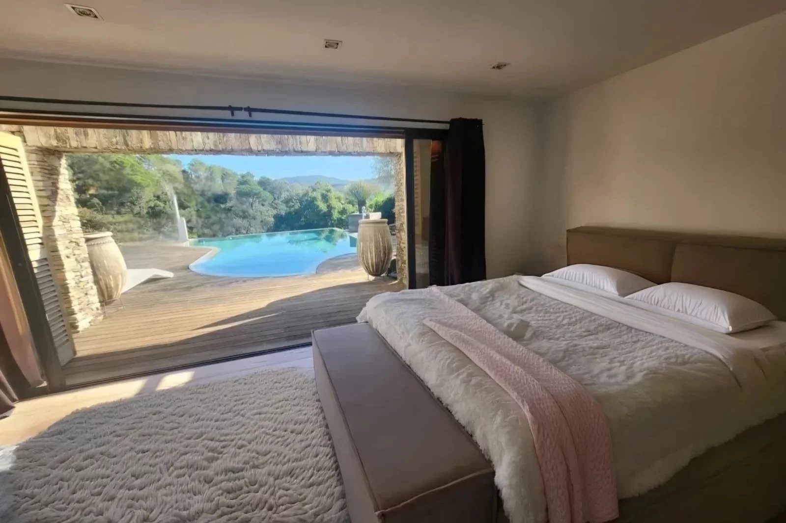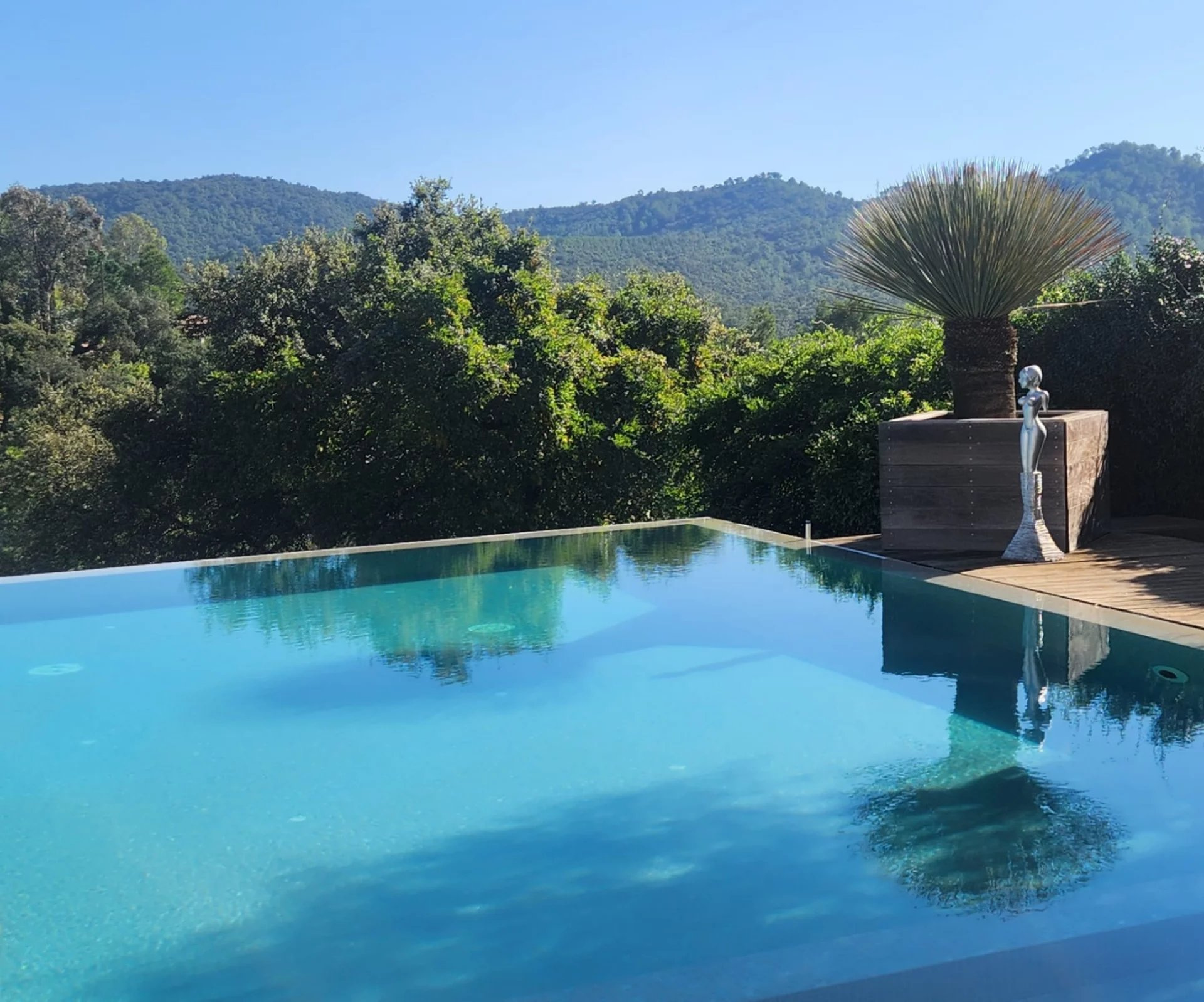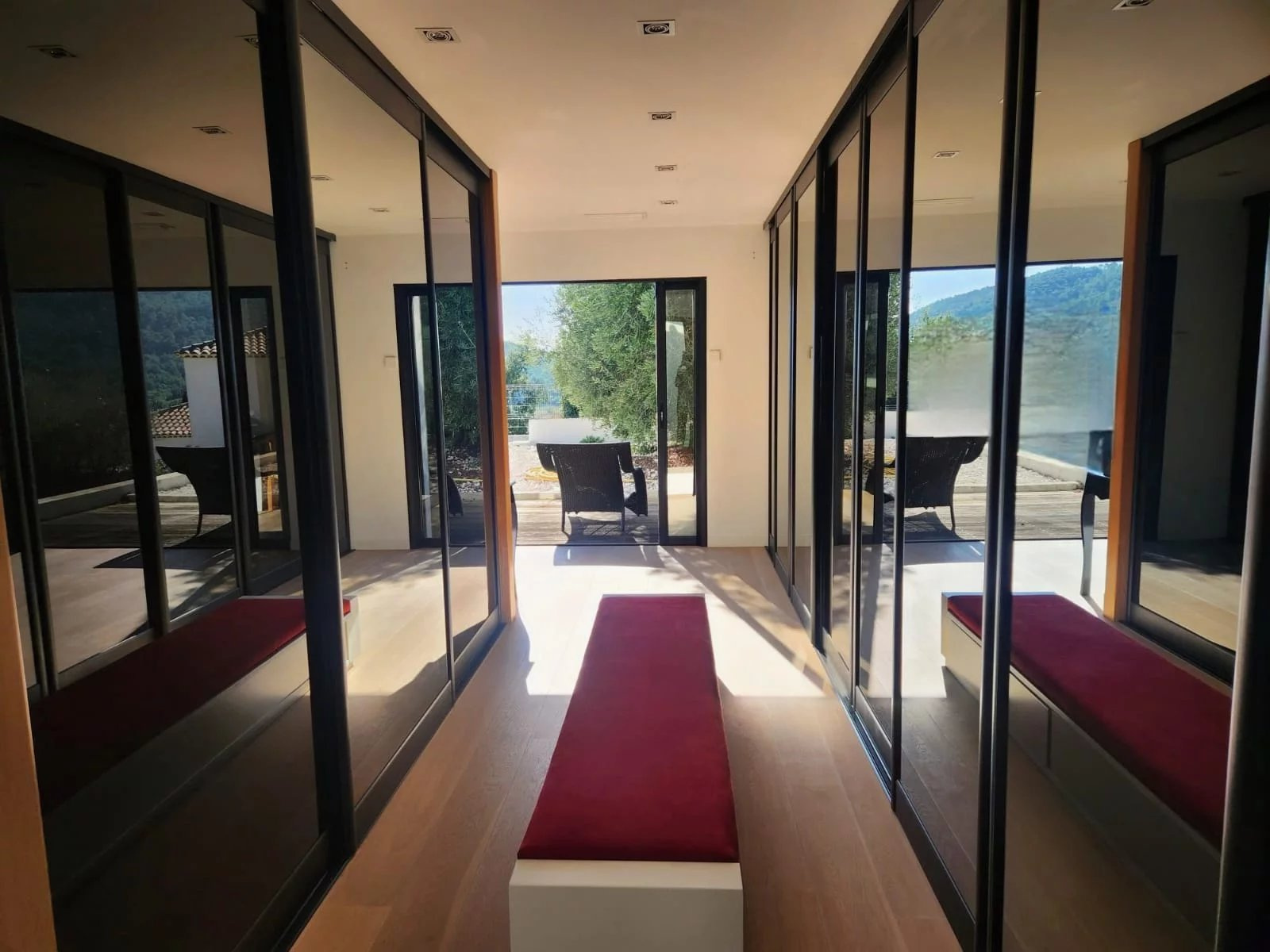 Très rare à la vente, cette propriété unique séduira les amateurs de design, de nature et de confort absolu. Nichée dans un écrin de verdure, entre bougainvilliers, magnolias, oliviers et autres essences méditerranéennes, cette villa contemporaine de 2011 trône en position dominante face à la majestueuse chaîne du Massif des Maures.