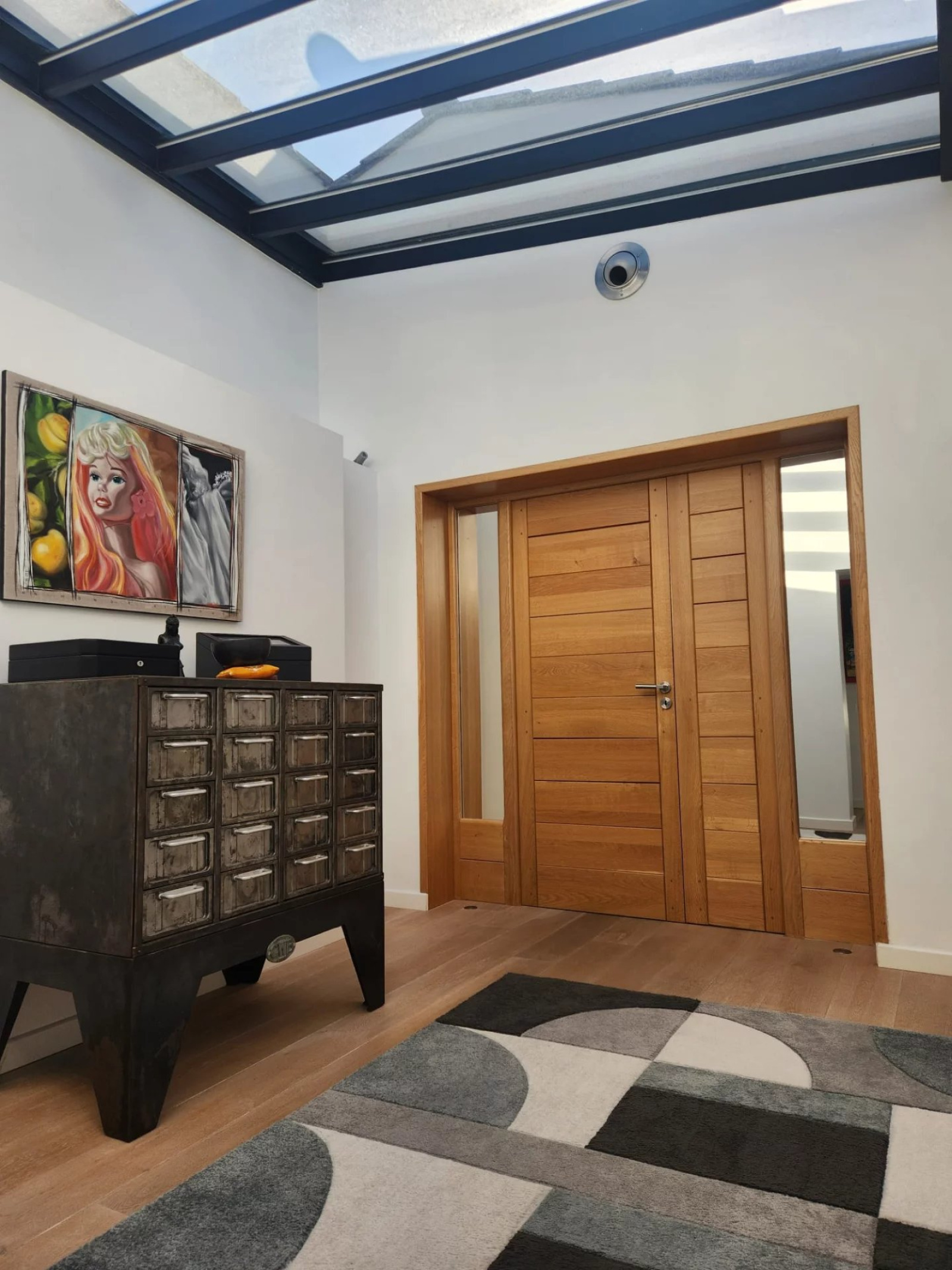 Dès l’entrée, l’architecture remarquable alliant pierre, béton brut et bois révèle un style à la fois atypique, raffiné et intemporel. Véritable œuvre d’art à ciel ouvert, la maison développe 430 m² de surface habitable, au cœur d’un jardin paysager de 3 594 m².