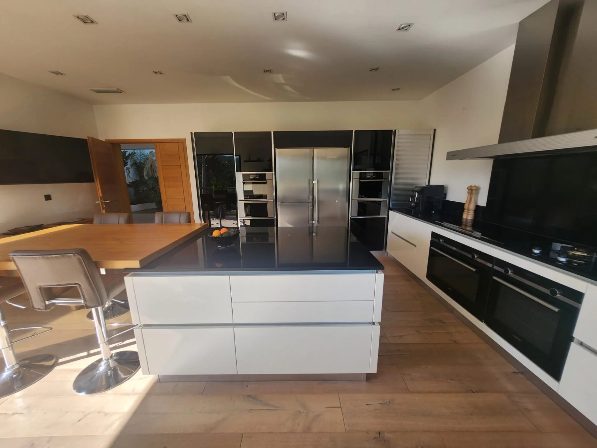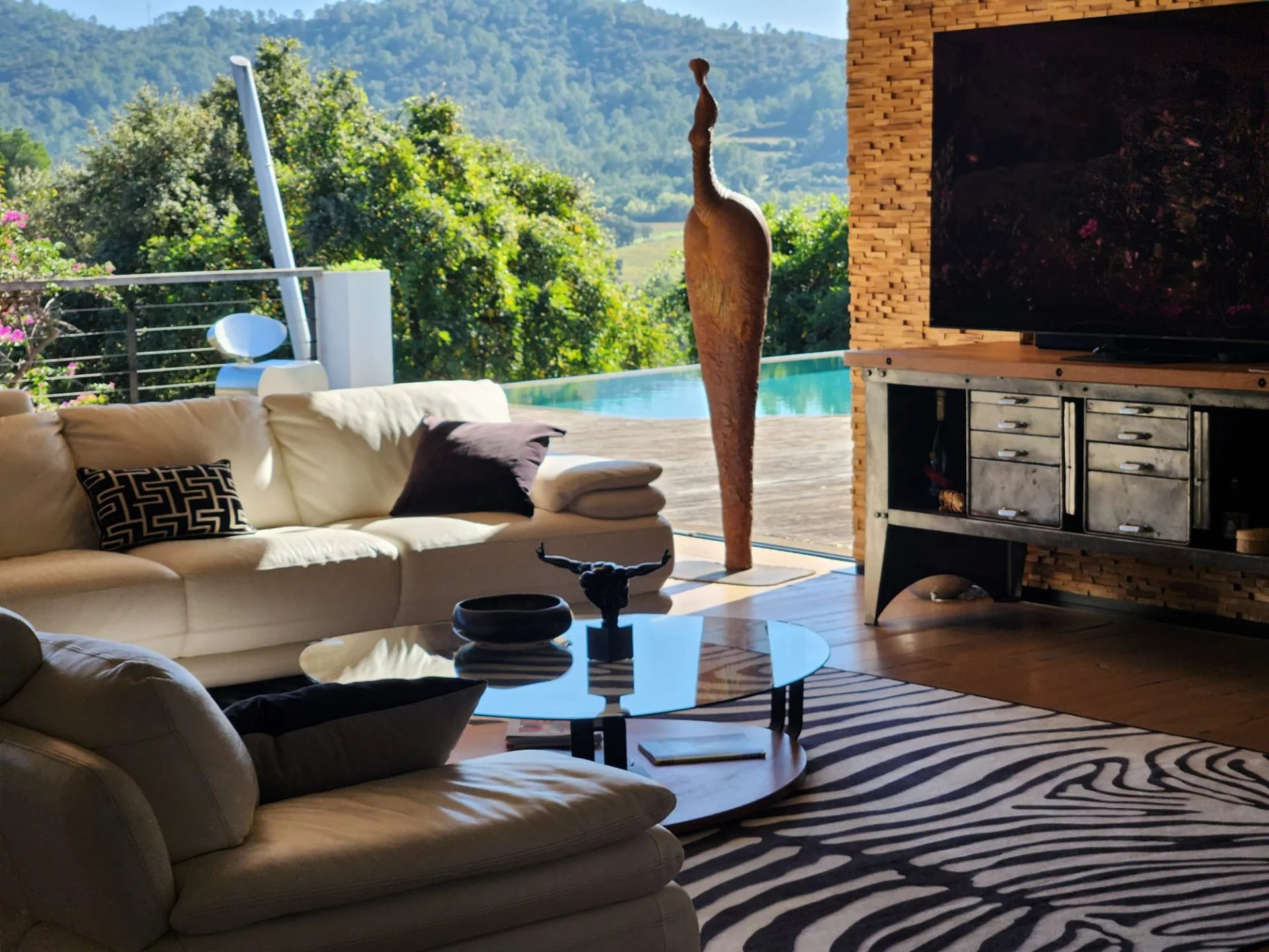 L’espace de vie principal de 115 m² impressionne par sa lumière et ses volumes : baies vitrées entièrement rétractables, ouverture totale sur l’extérieur, et une vue panoramique sur la piscine à débordement et les collines environnantes.