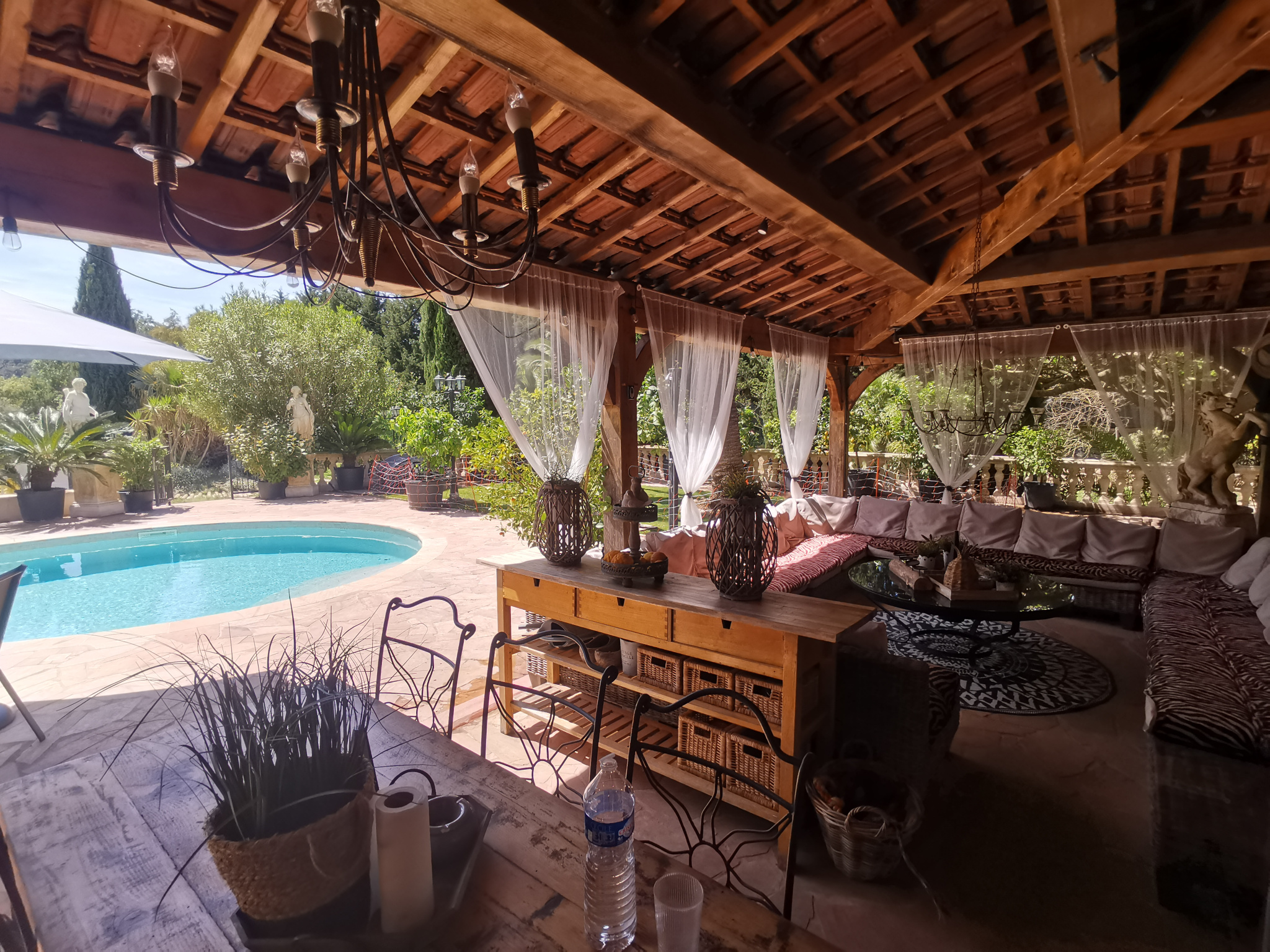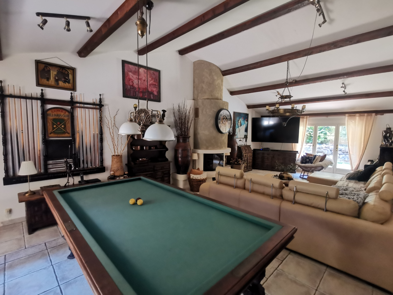 annexe: buanderie, cave, atelier, garage ouvert de 120m2, nombreux parkings, patio, bassin d'eau douce, local piscine (filtre et UV), terrain de pétanque.