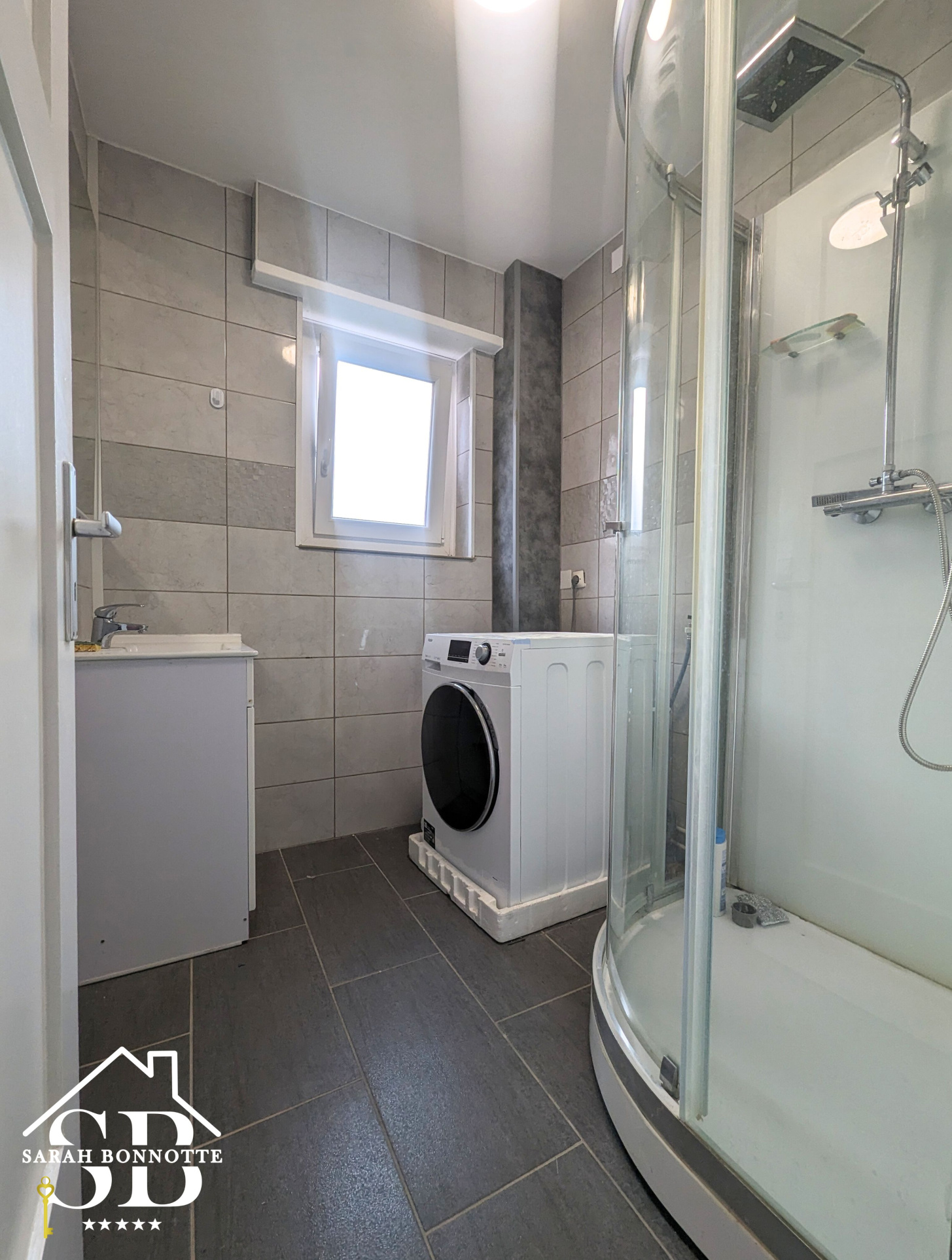 Côté sanitaires, vous disposez d'une salle d'eau composée d'un meuble vasque, douche, emplacement machine à laver, fenêtre, puis un wc indépendant.