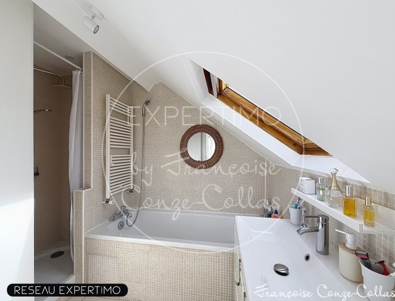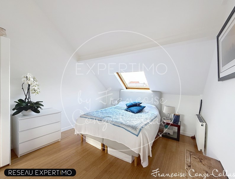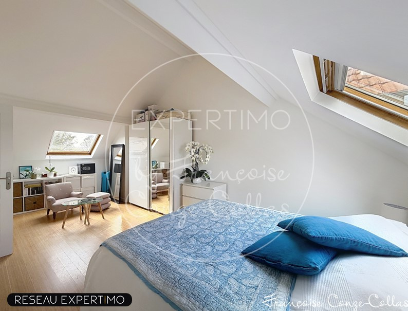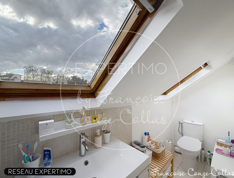 Au 2ème étage, grande chambre parentale de 20m2, chambre ou bureau de 12m2 et salle de bains avec WC, baignoire et douche et 2 velux.