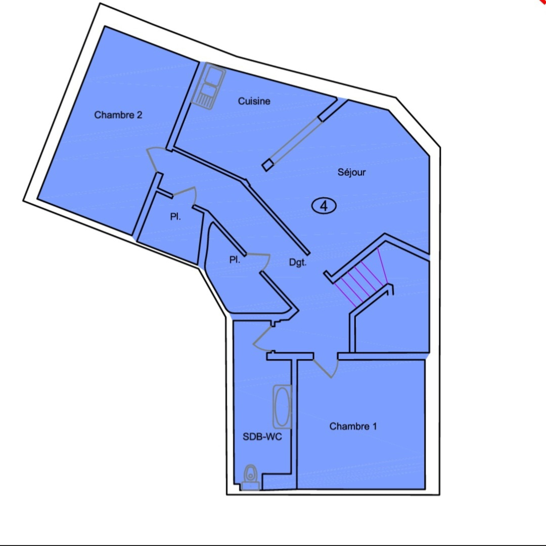 Dans un petit immeuble se trouve cet appartement trois pièces de 80m2 qui occupe tout le premier et dernier étage.