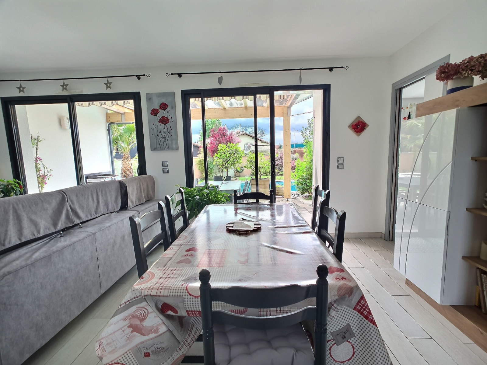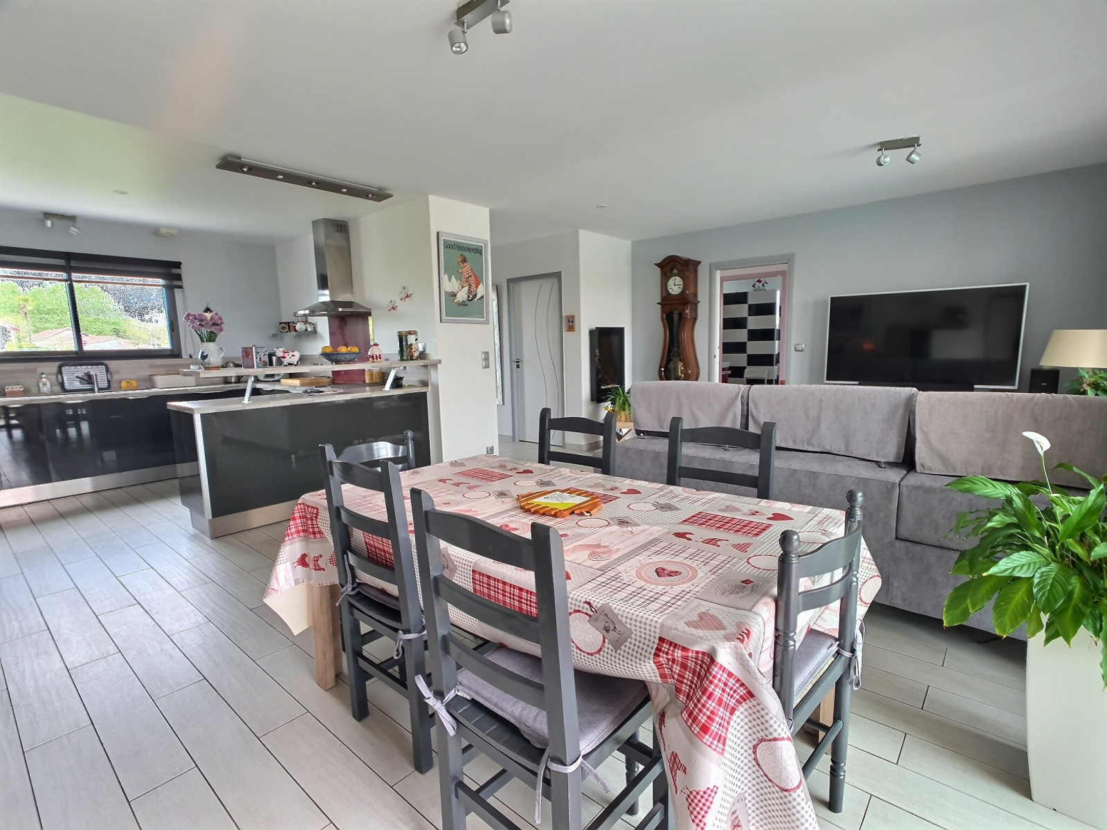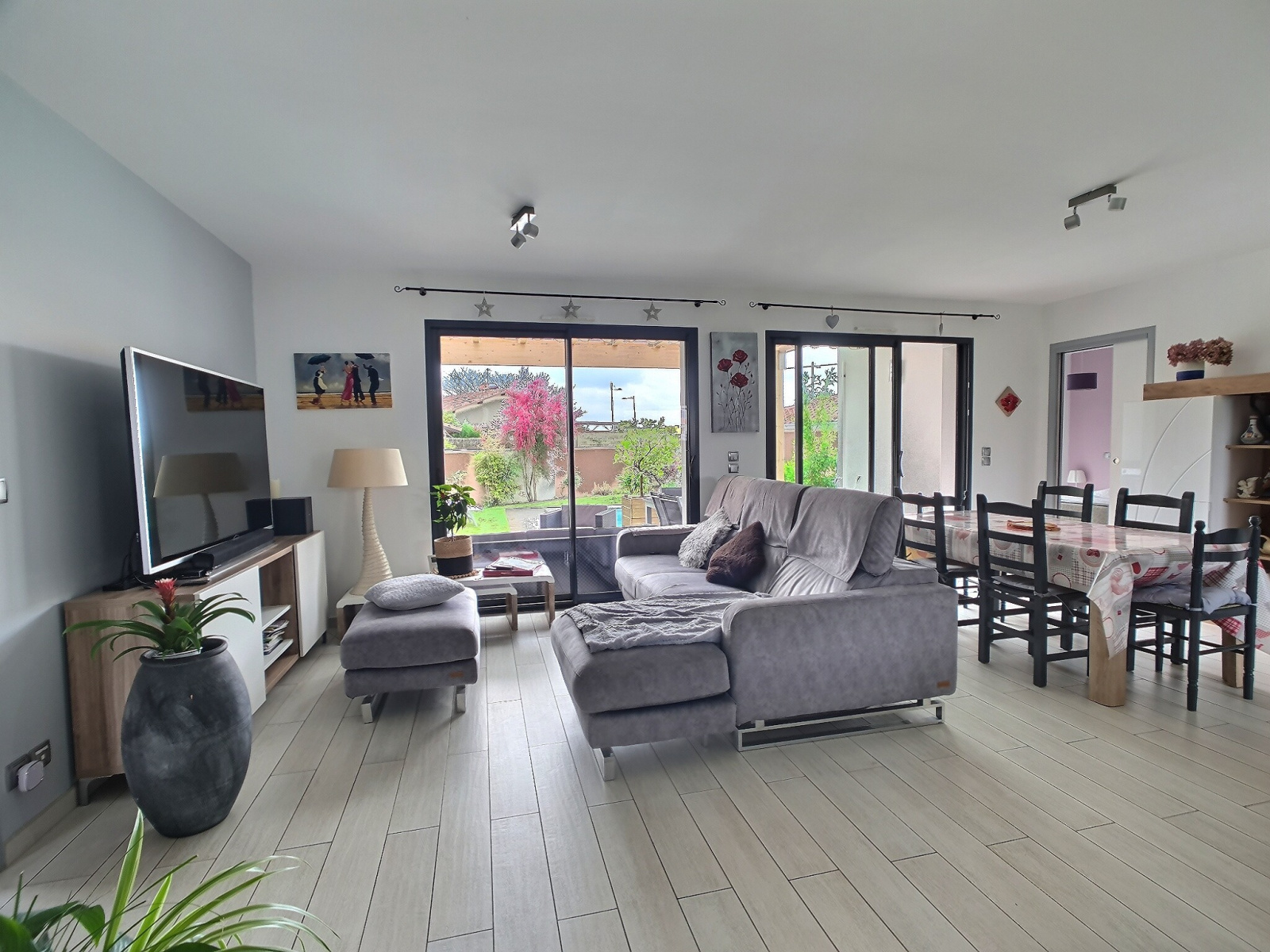 Maison de plain-pied de 2014, hors lotissement, orientée sud de type T6 d'environ 116 m² qui comprend 4 chambres dont 1 suite parentale. Le tout sur une parcelle clôturée et murée de 600 m² exposée Sud avec une terrasse extérieure couverte d'une 15aine de m², attenante à la pièce à vivre.