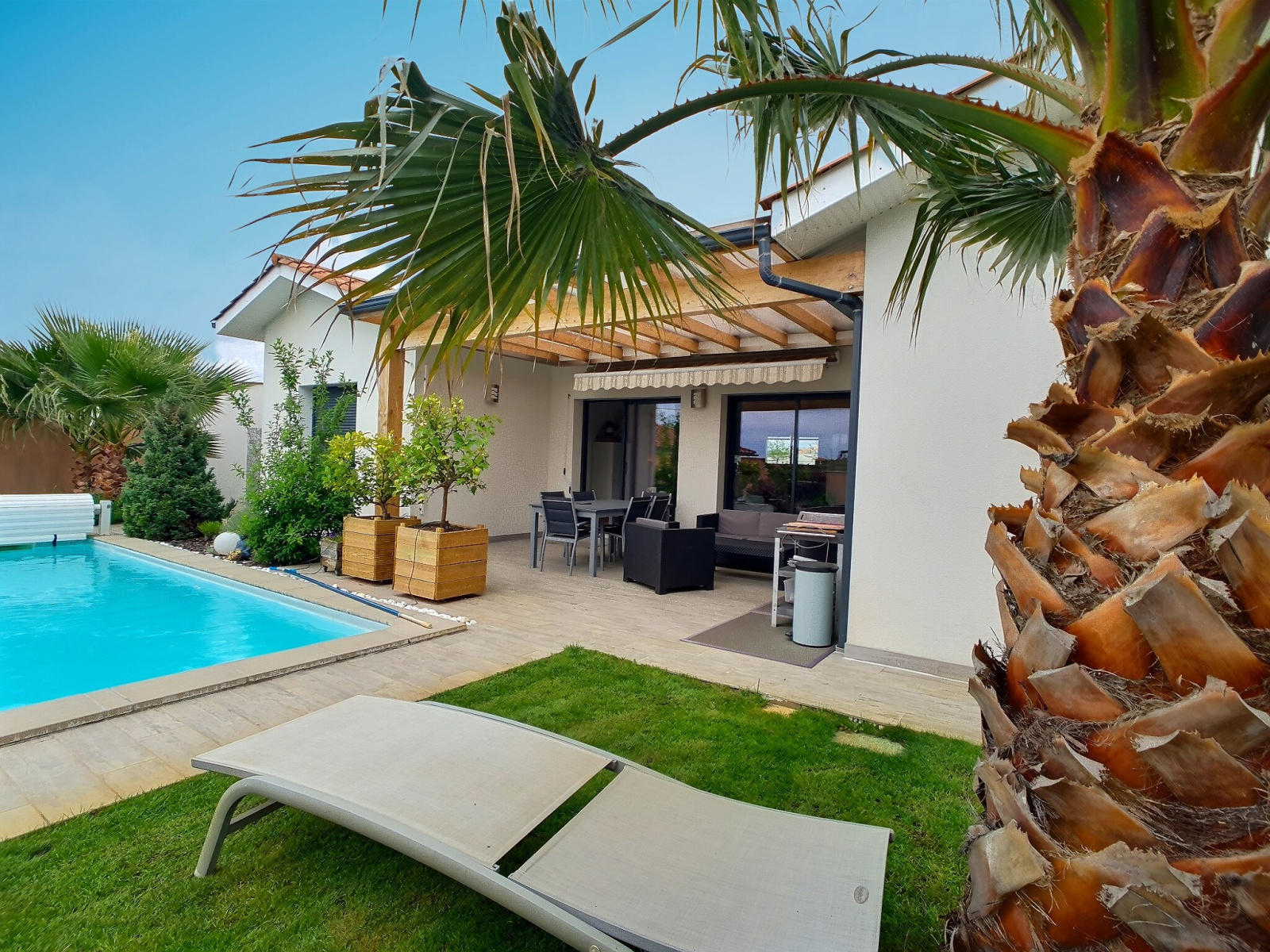 Sur les extérieurs, nous trouvons un espace jardinage, un local technique piscine servant également d'atelier (20 m²) ainsi qu'une piscine chauffée au sel de 7X3,5 m sur une profondeur régulière d'1m40 avec 1 volet immergé. A noter la présence d'une douche extérieure sur le mur de ce local, côté piscine. Un forage permet d'alimenter les arrosages extérieurs, également de manière automatisé.