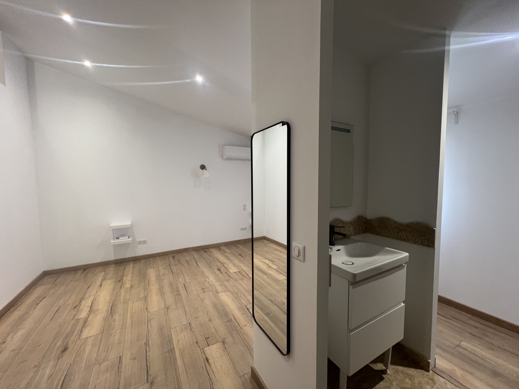 Le bien : la grande pièce de vie traversante s'ouvre à l'Est et à l'Ouest sur deux cours privées (43 m² + 23 m²) au sol minéral, prêtes à être habillée de plantes et de lumière.